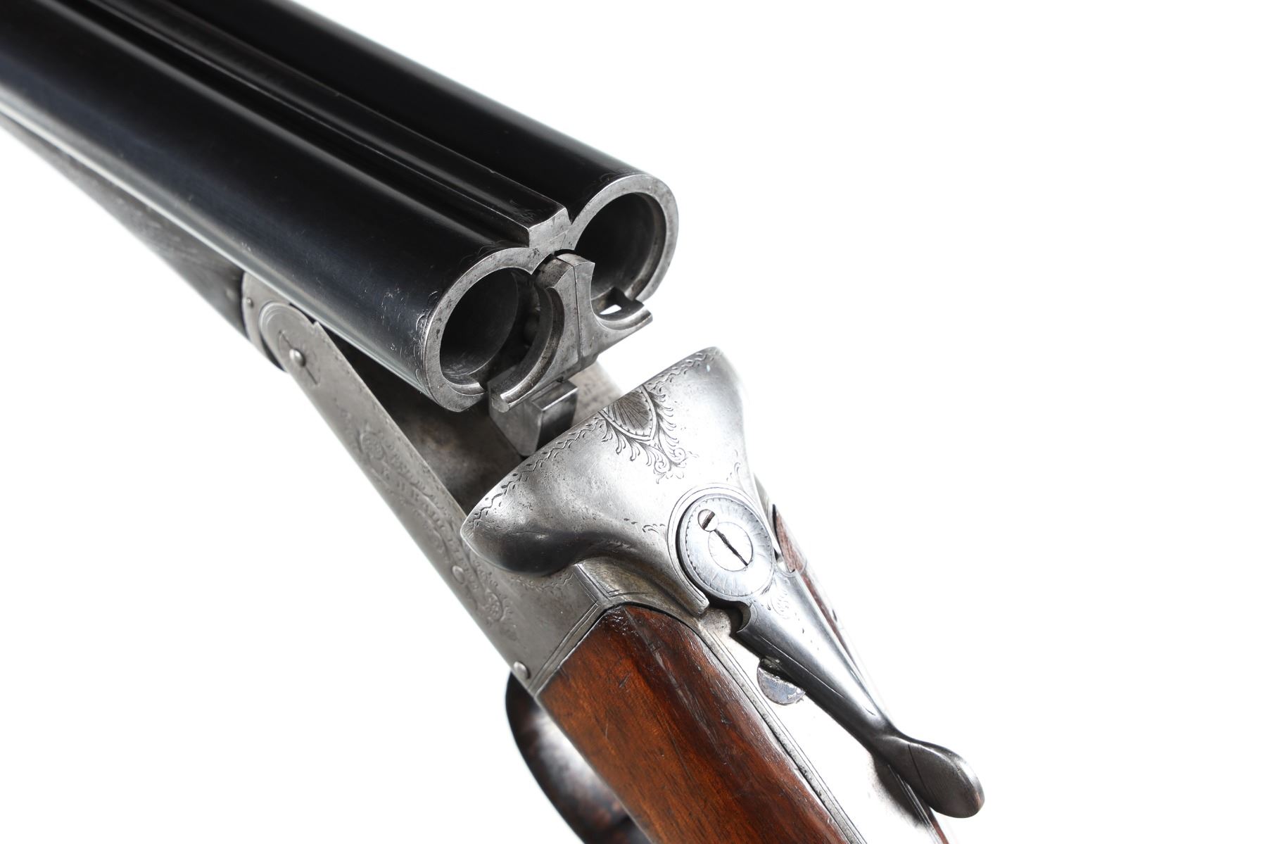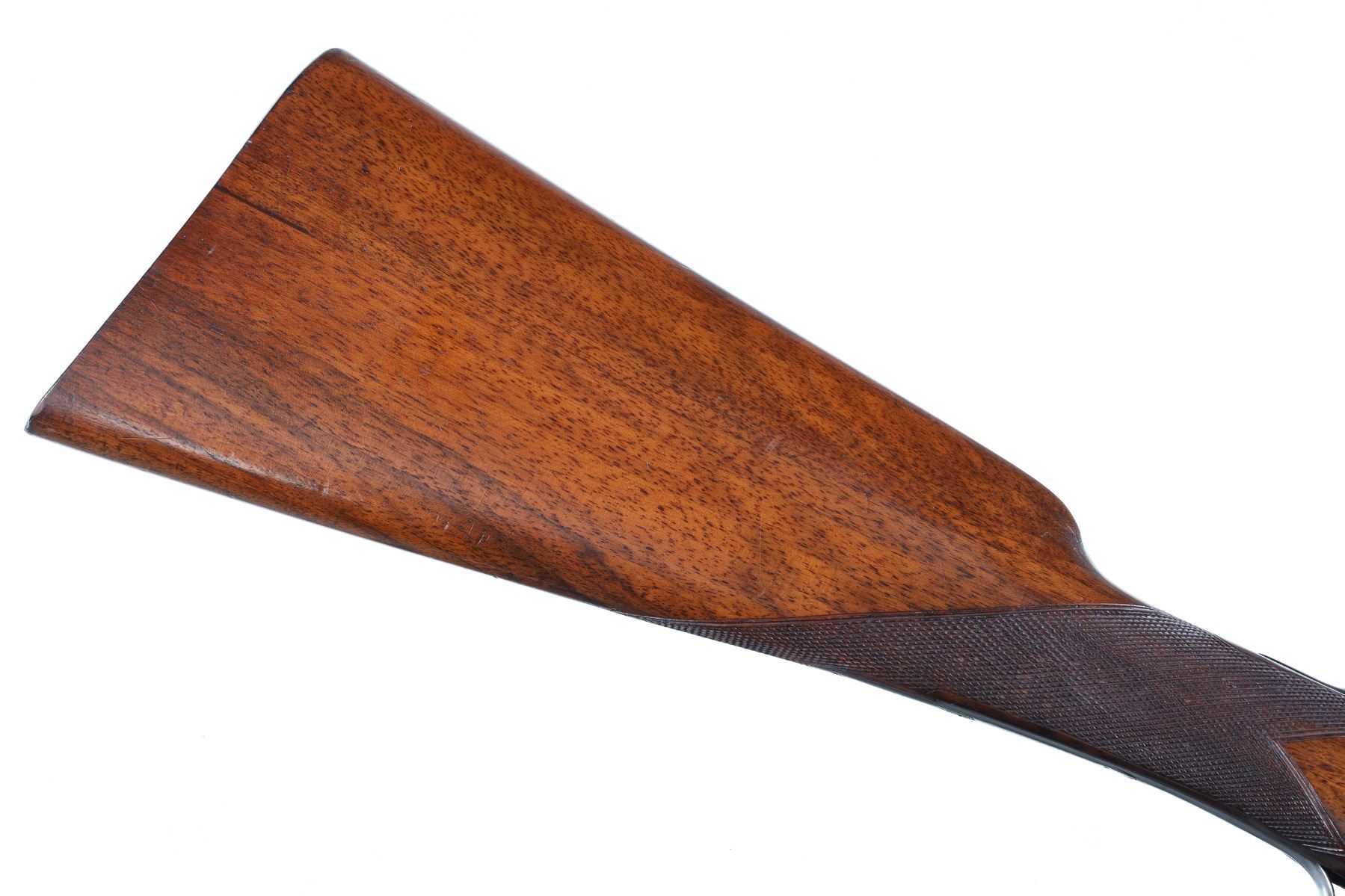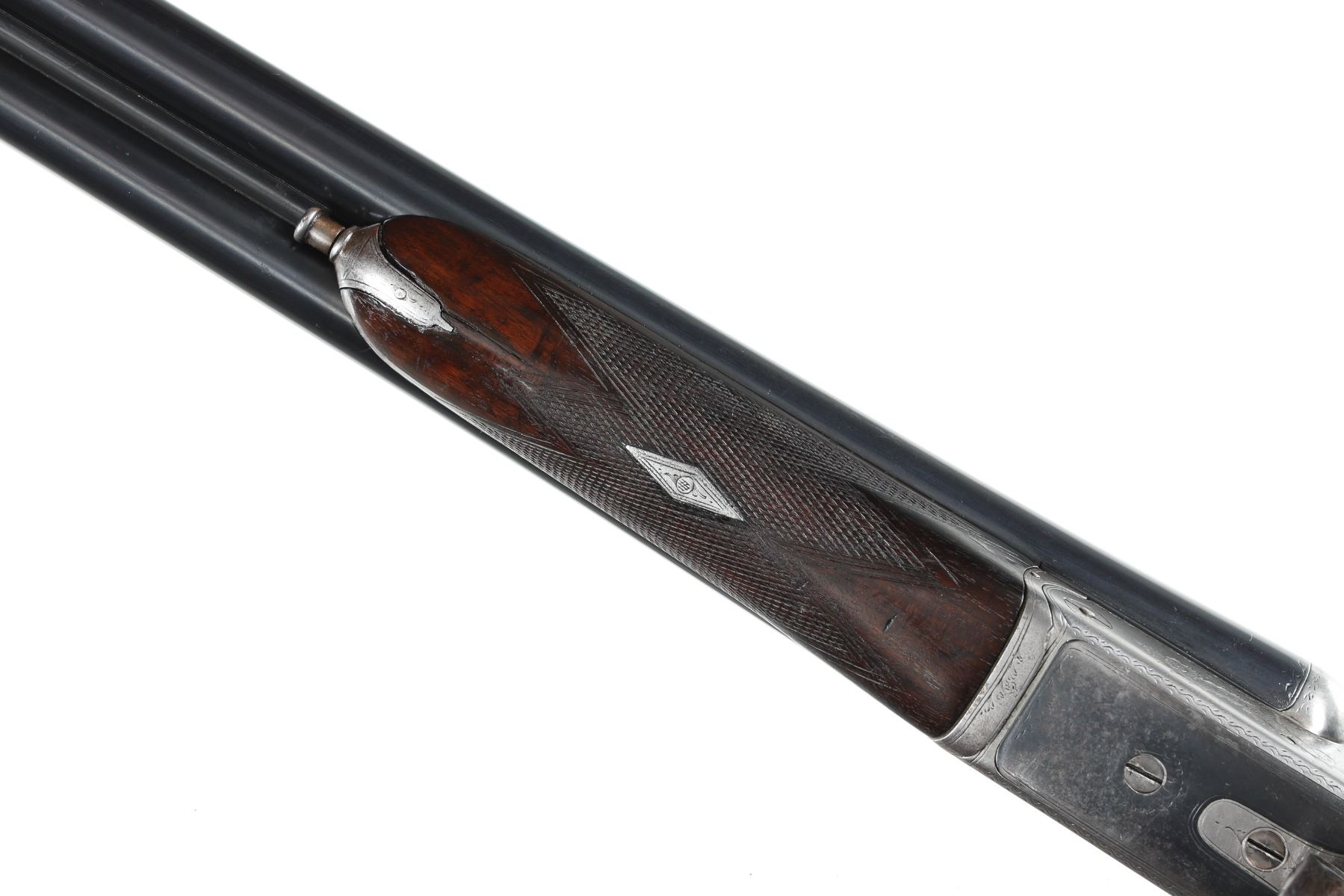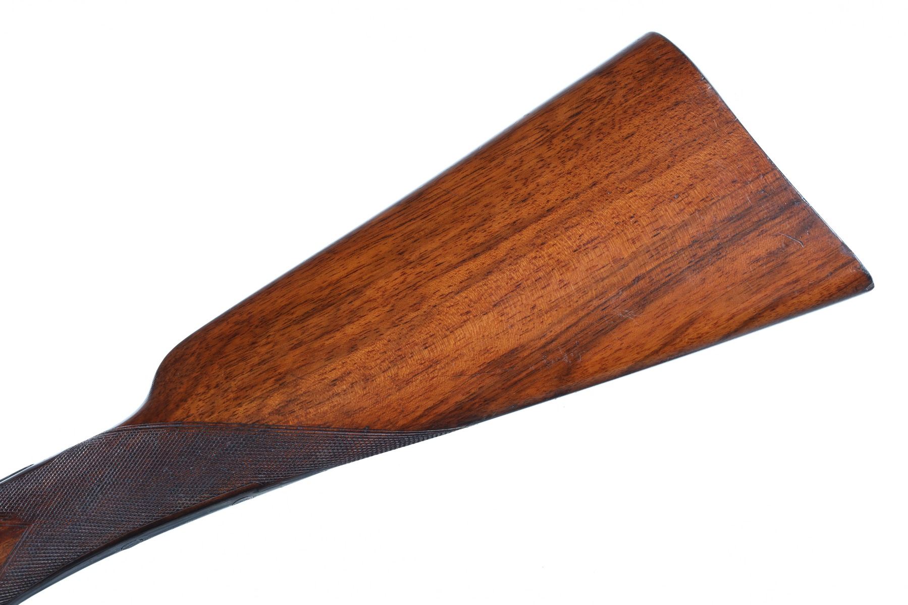 12ga Serial # 4204 Fine overall with reblacked barrels, receiver toned to silver, stocks very good with minor impressions with a small shrinkage crack. Choked imp cyl/mod, 2 1/2" chambers, double trigger with ejectors, 14" LOP, drop is 1 1/2" and 2 1/2". Mfg in 1995 Barrel 28" Modern