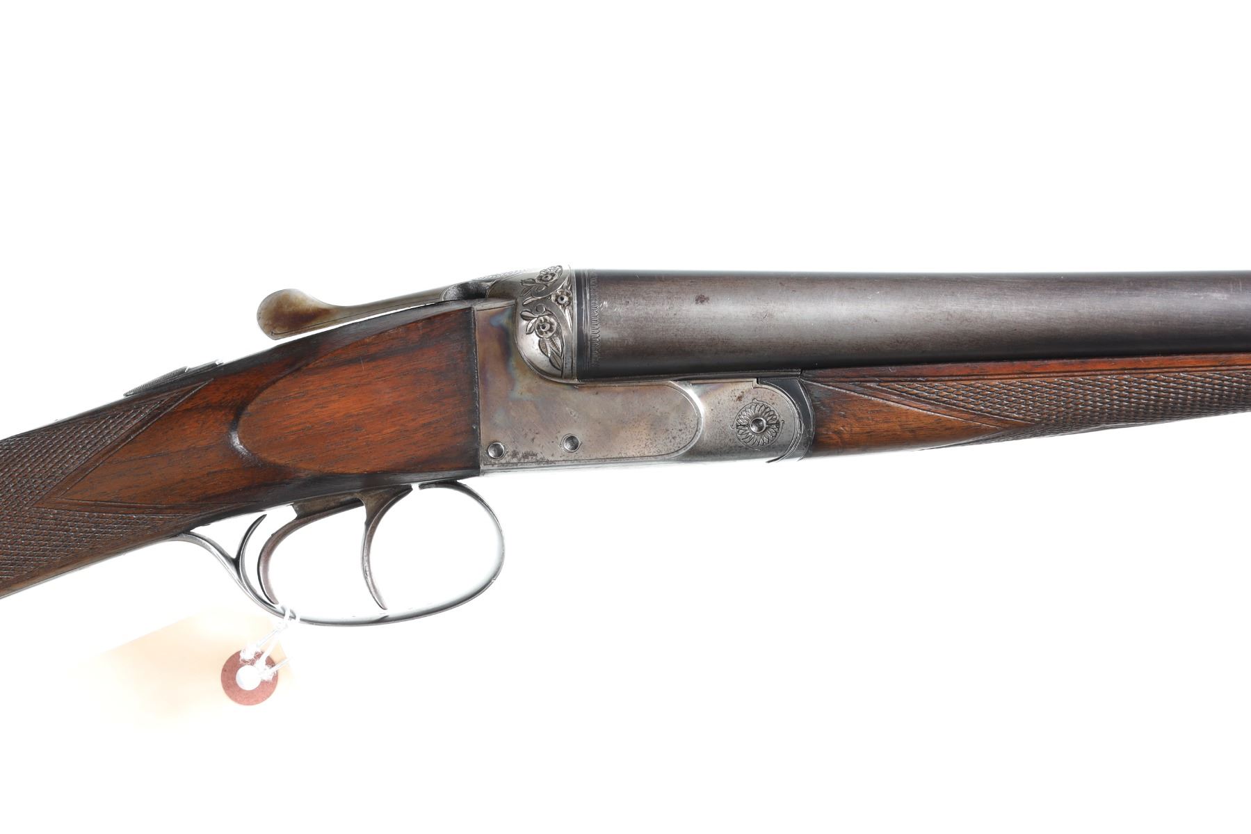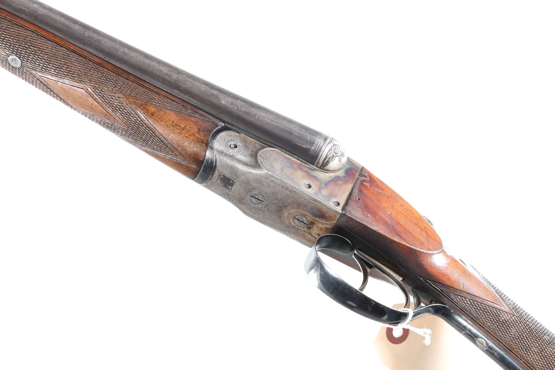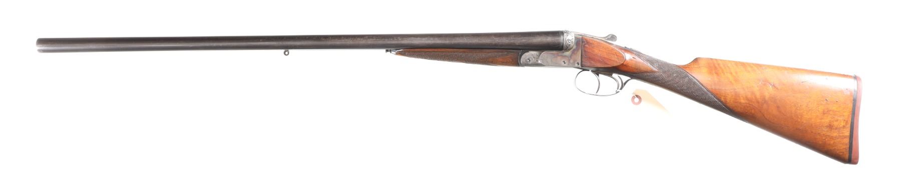 12ga Serial # 5291 French produced double 12ga, from Saint Etienne. Box lock action with double trigger, pistol grip stock with splinter forearm. Very good overall condition. Chambers marked 2 1/2" with extractor, chokes measured full/full, and 14 5/8" LOP. Mechanically excellent. C&R Barrel 27 11/16" C&R