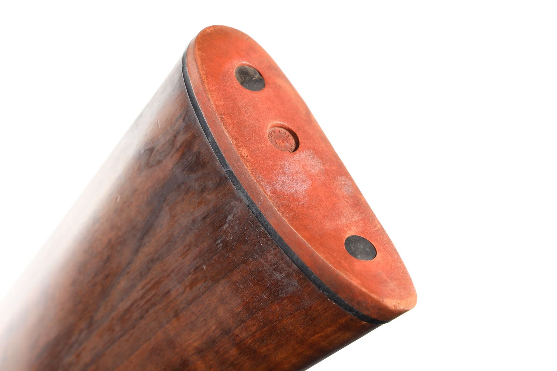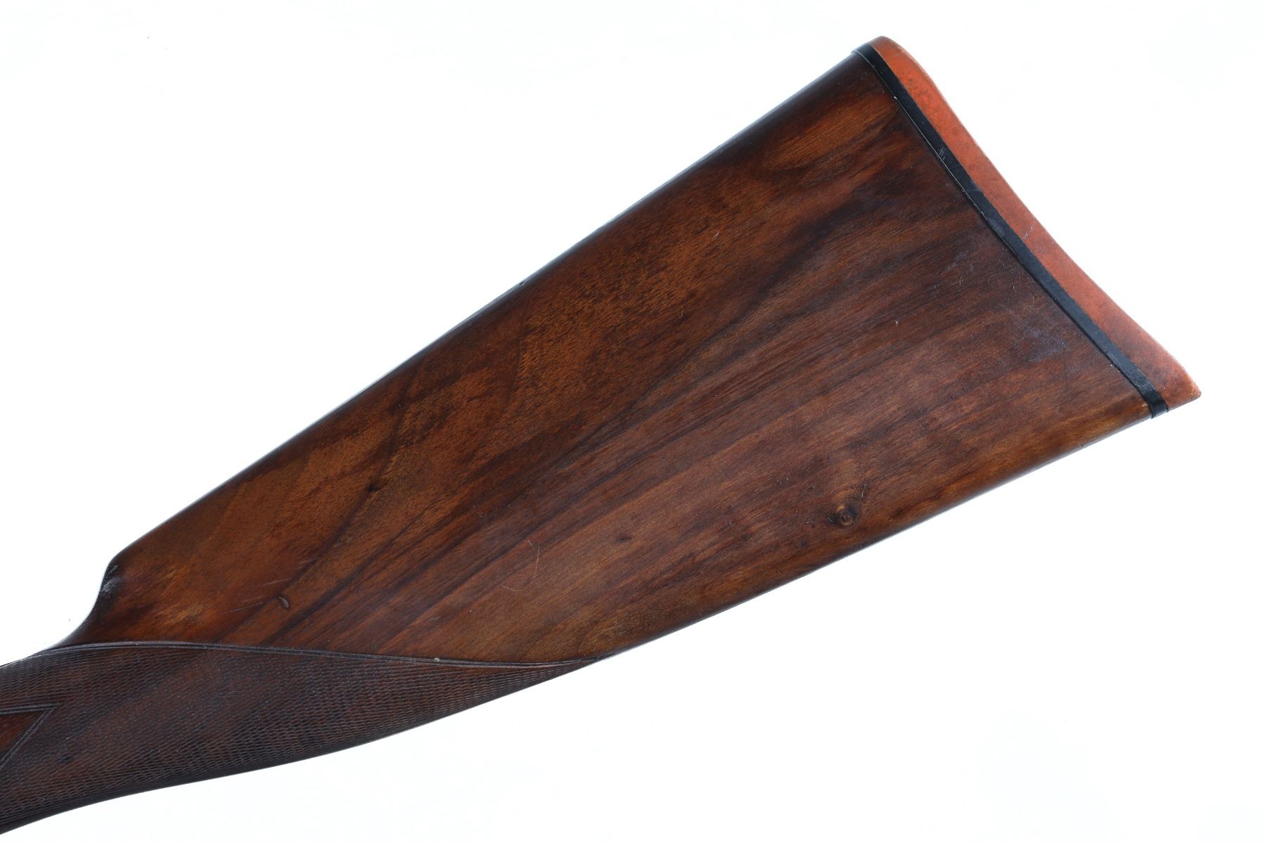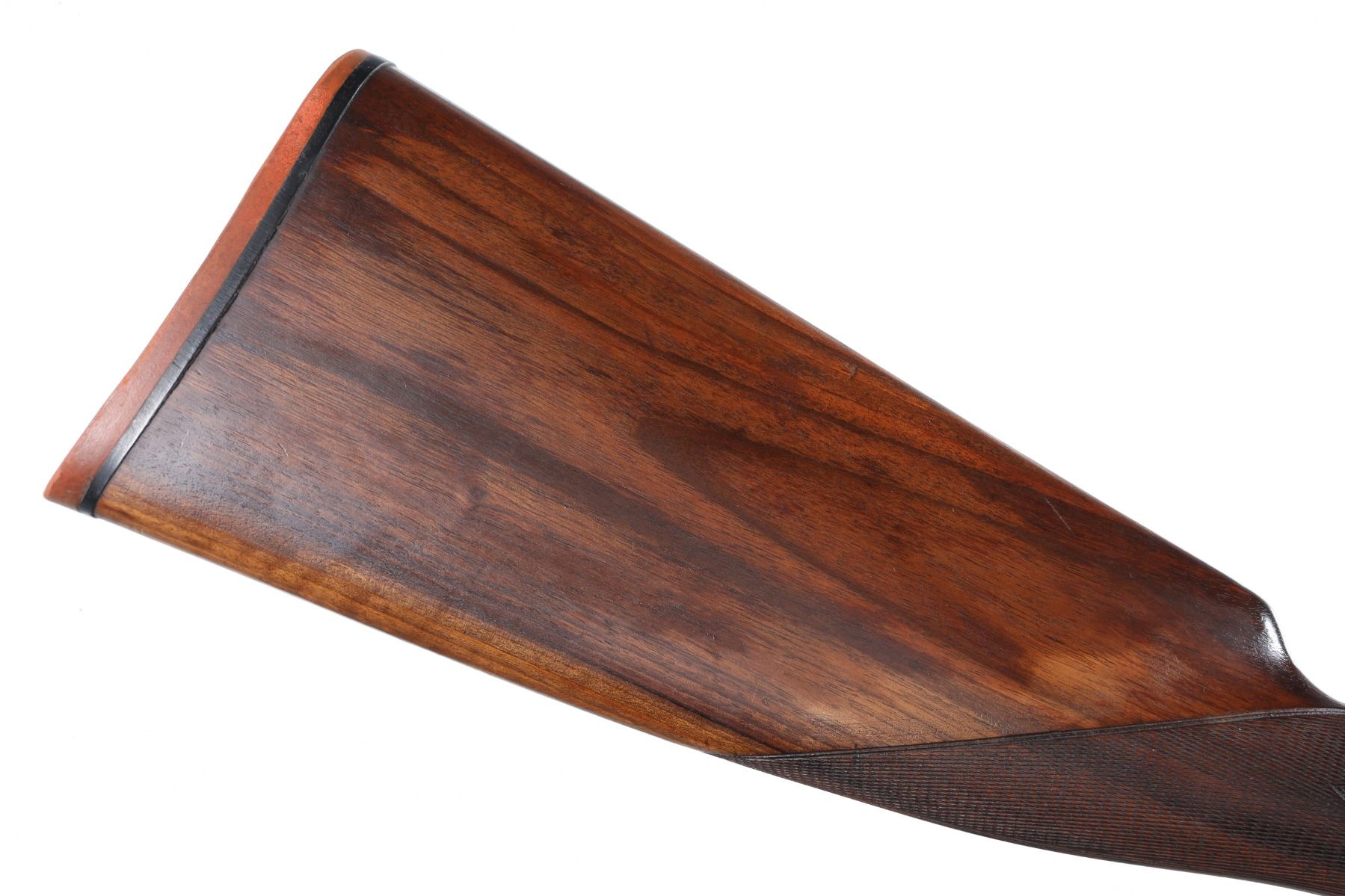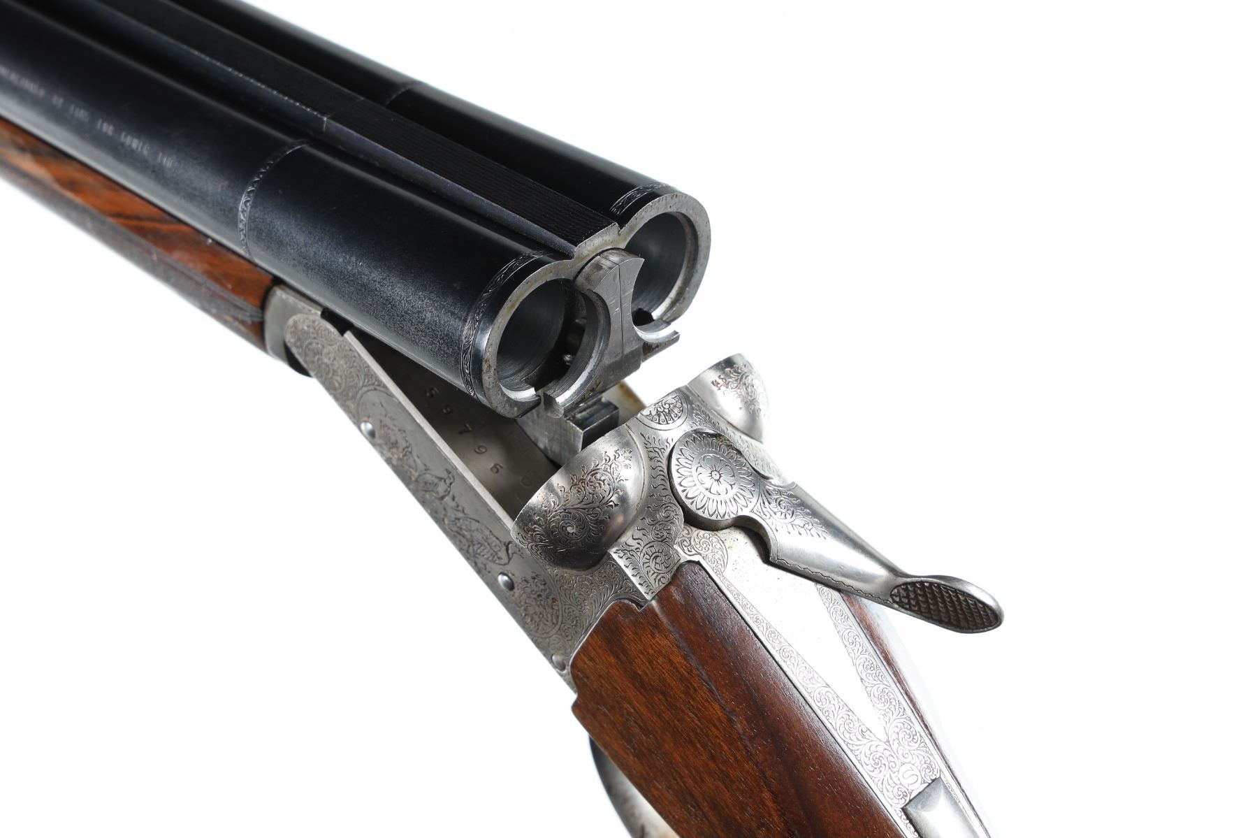 12ga Serial # 59796 Choked Full/Mod, 2 3/4" chambers, double trigger with ejectors, LOP 15", Drop 1 3/4"; 2 3/4". English checkered straight stock with game scene engraved. Very fine overall condition, slight traces of oxidation on receiver, bright bores, barrels retain most all finish. Mfg in 1984 Barrel 28" Modern