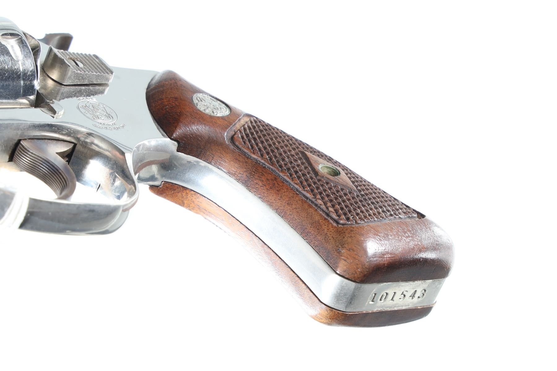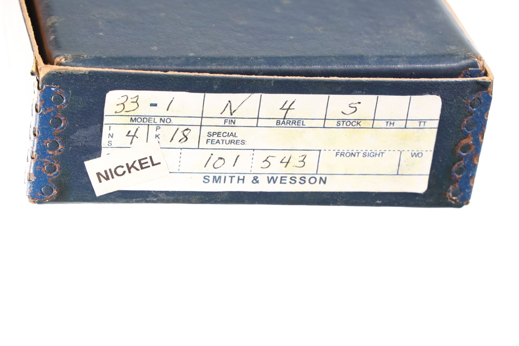 .38 s&w Serial # 101543 Nickel finish, flat latch, excellent overall condition with factory box with contemporary label. Mfg 1961-1968. Barrel 4" C&R