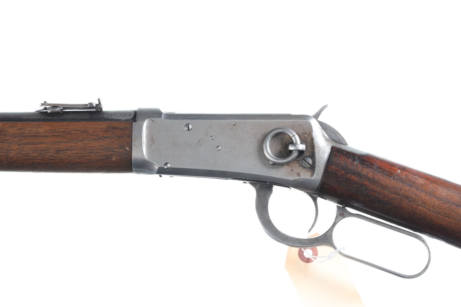 .30 wcf Serial # 597338 Winchester 1894 Saddle Ring Carbine with stud mounted front blade sight and folding staff Carbine rear sight. Long walnut carbine fore arm with shotgun butt pattern carbine stock. Good to very good overall condition, desirable saddle ring carbine. Receiver is dove grey and void of finish while barrel and tube retain generous amounts of factory blue finish. Mechanically fine. Manufactured 1913, C&R Barrel 20" C&R