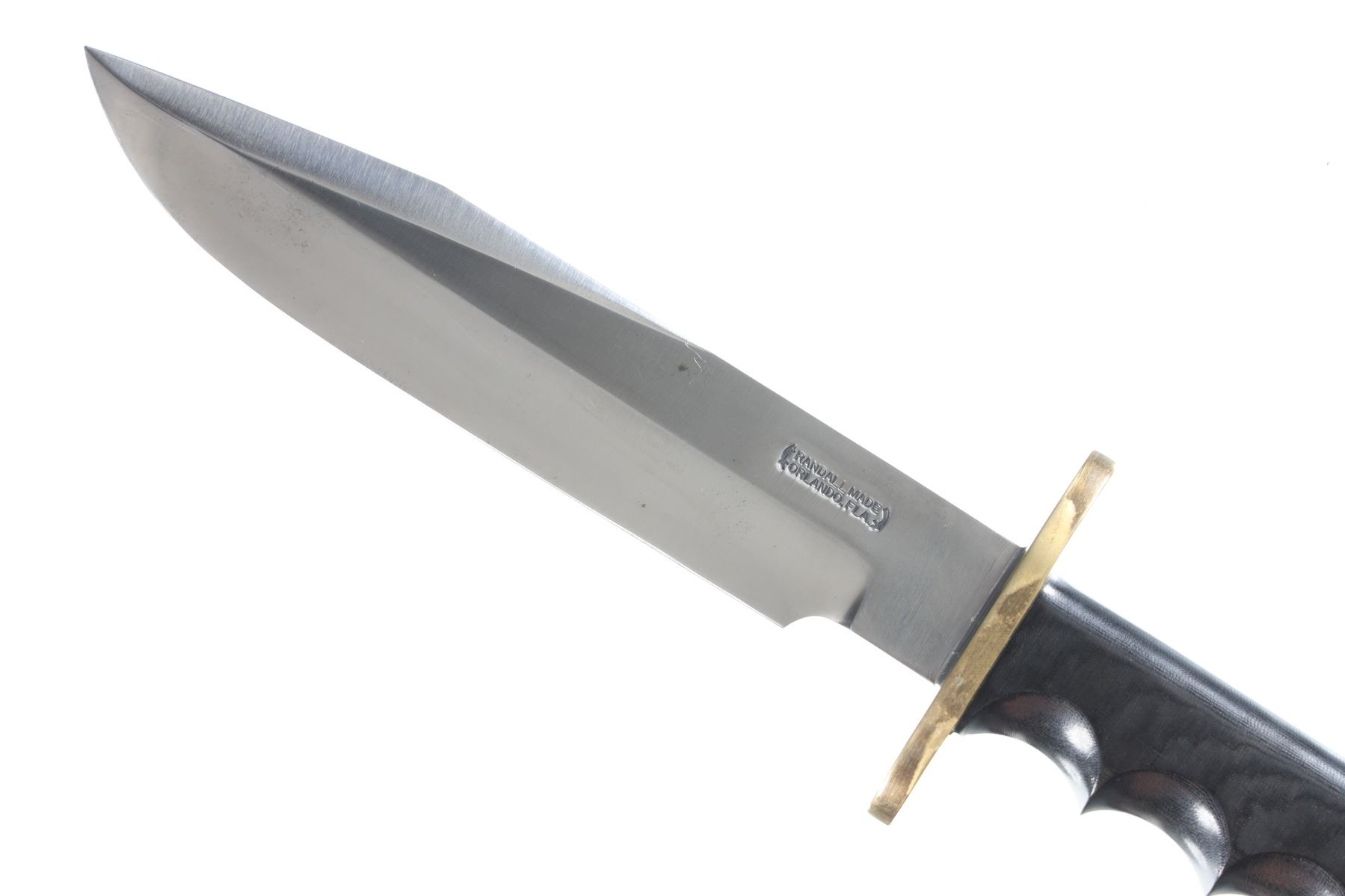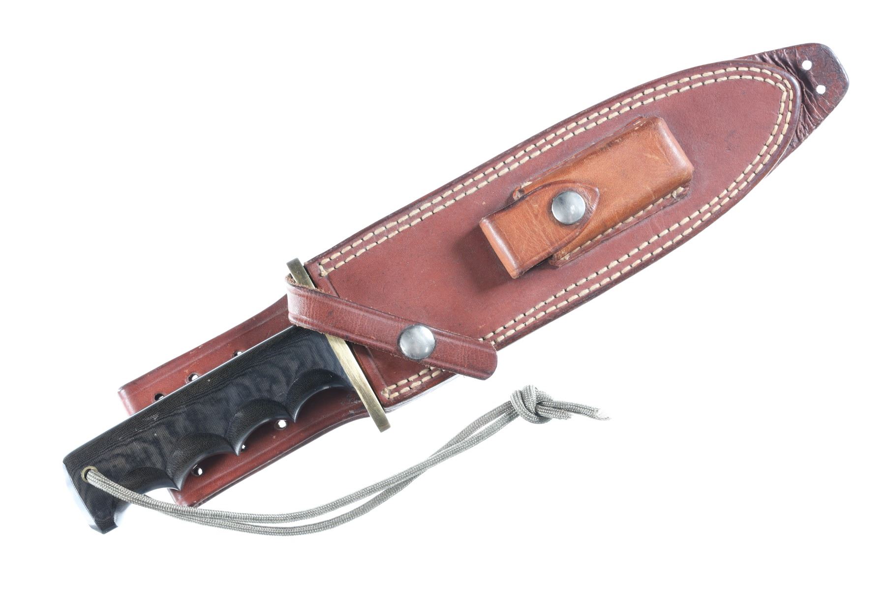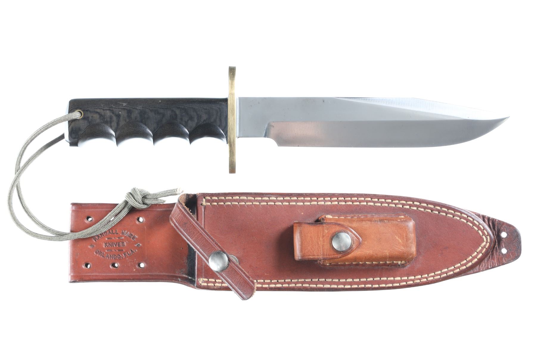 The classic Randall Model 14 Attack with 7 1/2" carbon steel blade with Randall Made touchmark on ricasso. Brass double guard with black Micarta handle with finger grooves and wrist thong. Housed in Leather Randall marked scabbard with stone pouch and stone. Condition: Very fine with no evidence of sharpening. Blade has a couple small spots of oxidation and brass has a period toned tarnish. Leather scabbard is very fine with smooth unmarked nickel snaps and slight soiling from carry.
