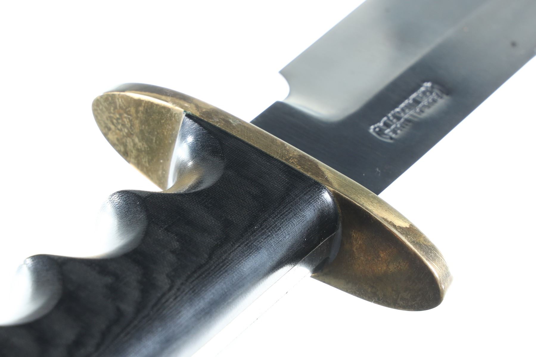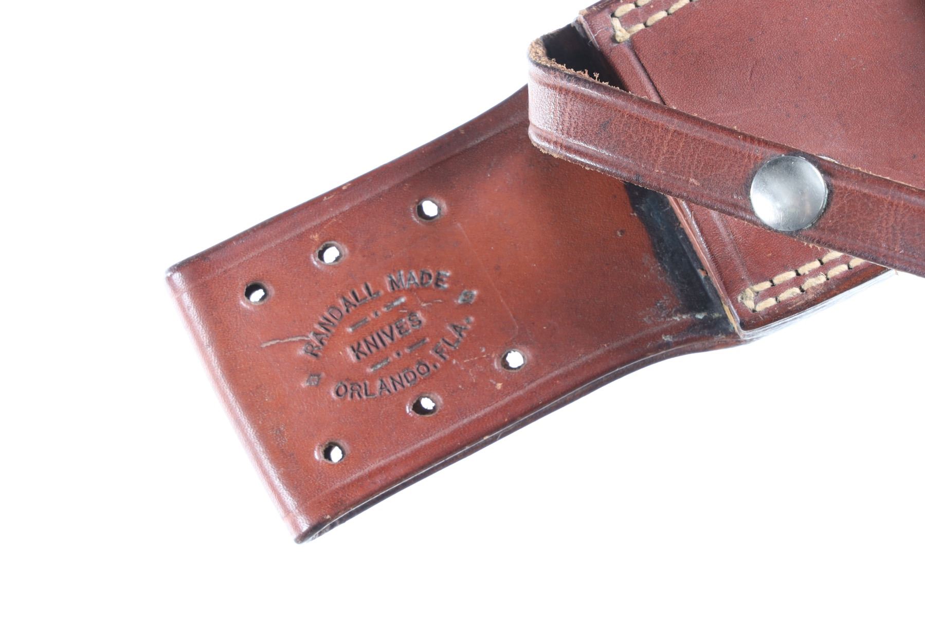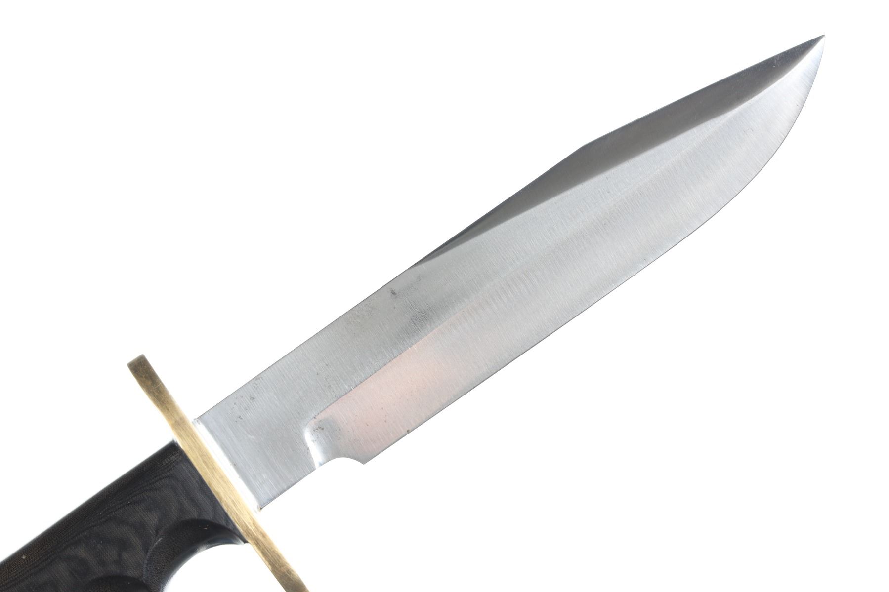 The classic Randall Model 14 Attack with 7 1/2" carbon steel blade with Randall Made touchmark on ricasso. Brass double guard with black Micarta handle with finger grooves and wrist thong. Housed in Leather Randall marked scabbard with stone pouch and stone. Condition: Very fine with no evidence of sharpening. Blade has a couple small spots of oxidation and brass has a period toned tarnish. Leather scabbard is very fine with smooth unmarked nickel snaps and slight soiling from carry.