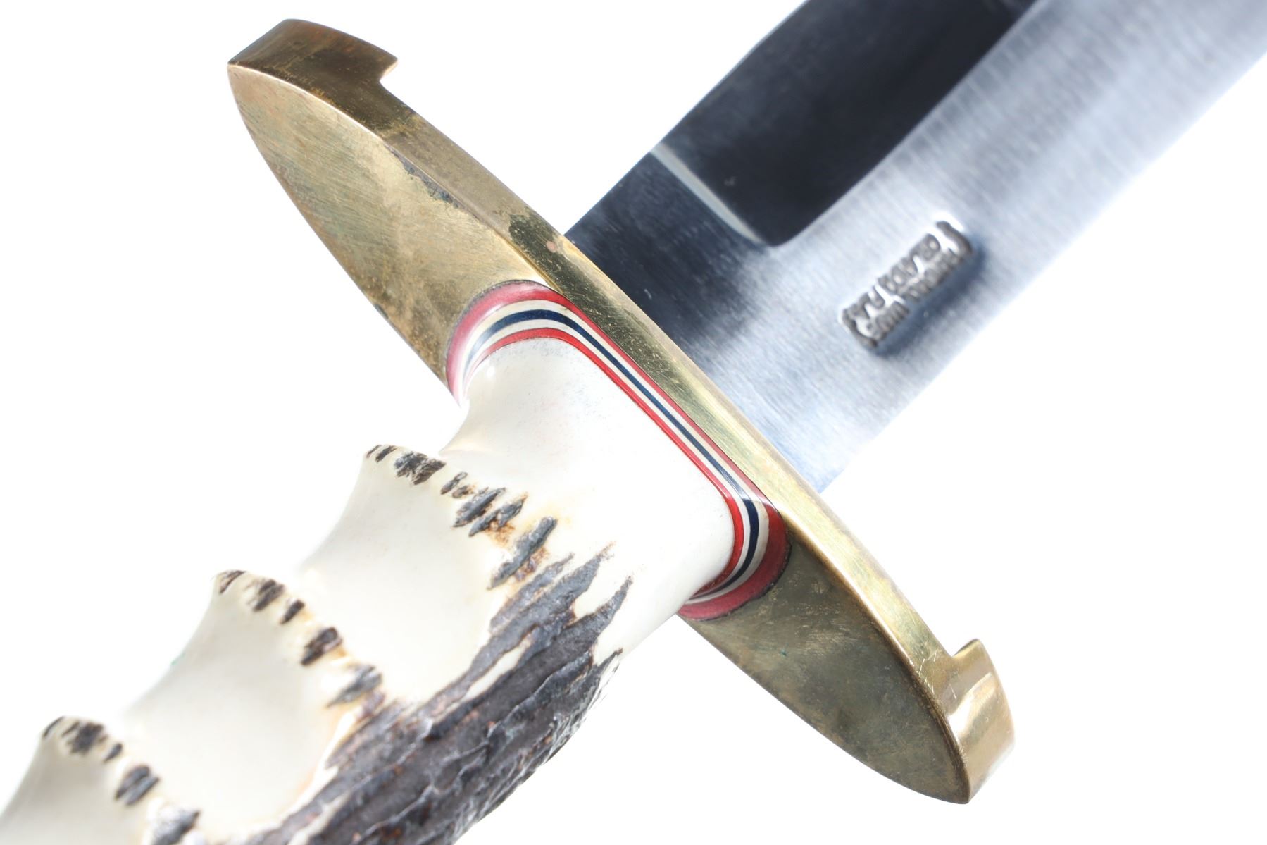 Randall Made Knives Model 12 Confederate Bowie with 11" Carbon steel blade with "RANDALL MADE" touchmark on ricasso. Brass double lugged guard with Polished finger groove Sanbar stag handle with brass butt with wrist thong. Housed in Randall leather scabbard with stone pouch and stone. Condition, near new with no evidence of use. Slight tarnish on brass and scabbard is near new.