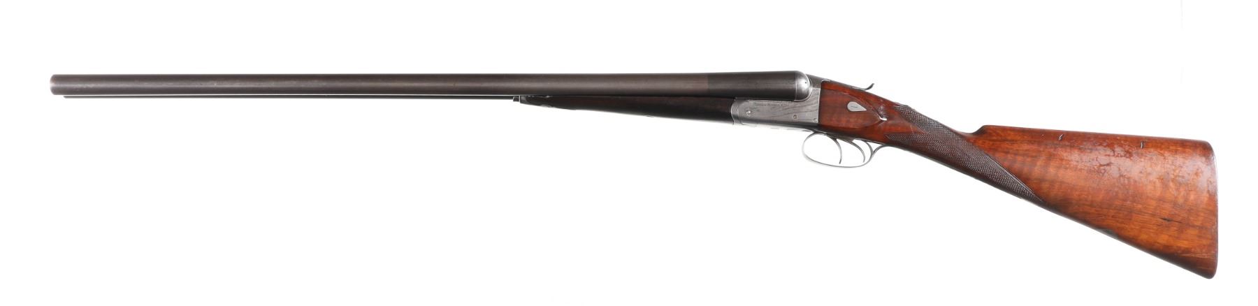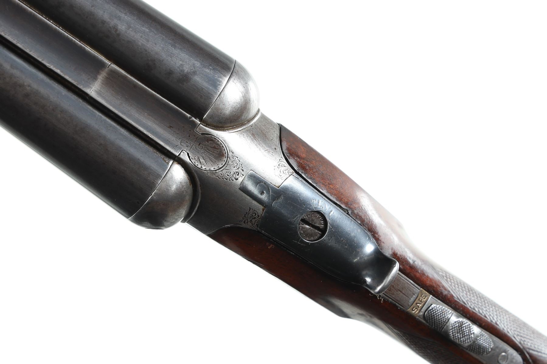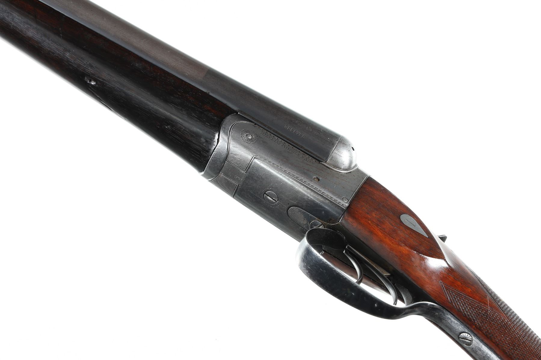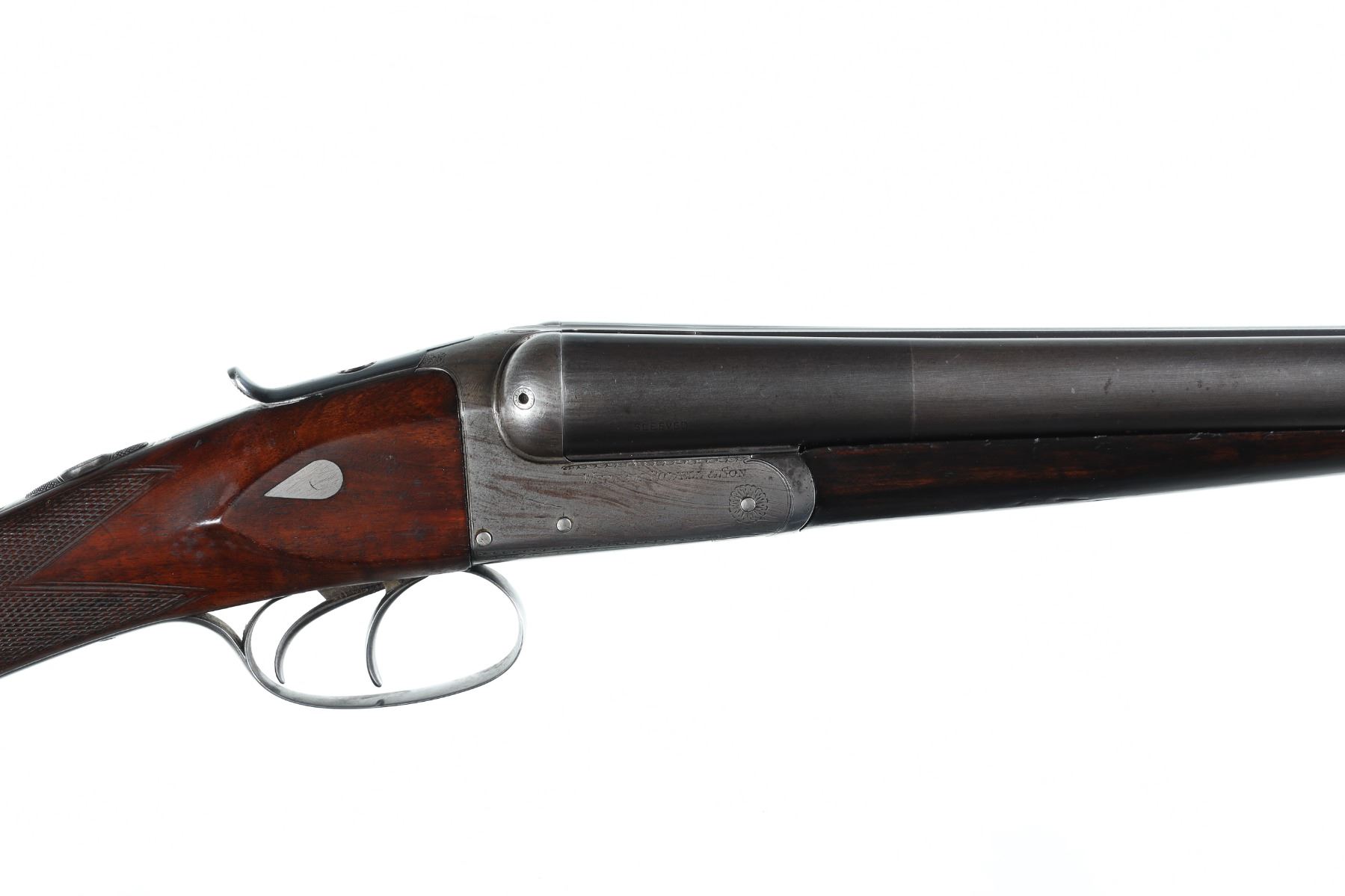 12ga Serial # 7744 Anson & Deeley patented box lock action by Powell with patented lift up top lever opening. 28" choked cylinder and full with 2-1/2" chambers and sleeved Bbl's. Double trigger with lifter extractors. Straight checkered English stock with splinter ofre arm. Condition is very good as sleeved and mechanically excellent. C&R Mfg in 1883 Barrel 28 NO4473