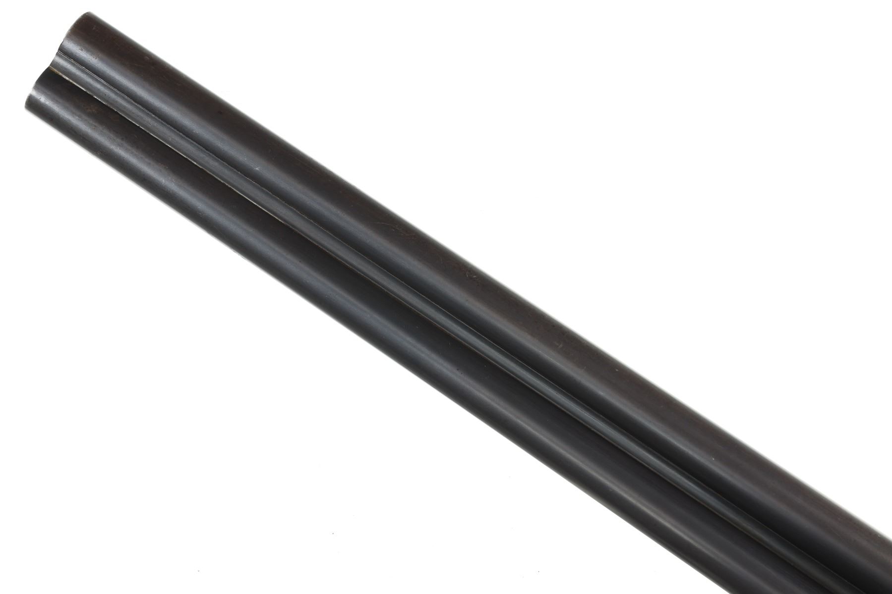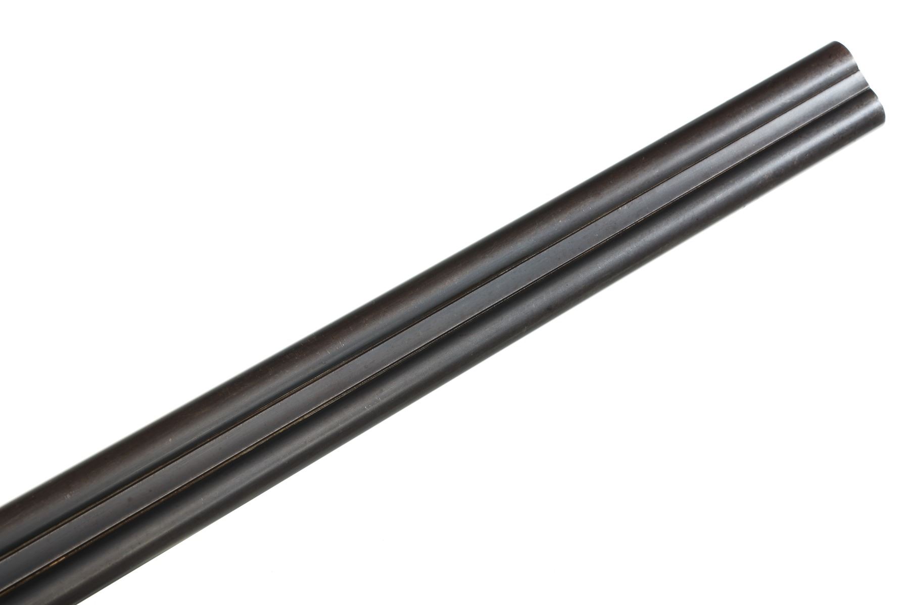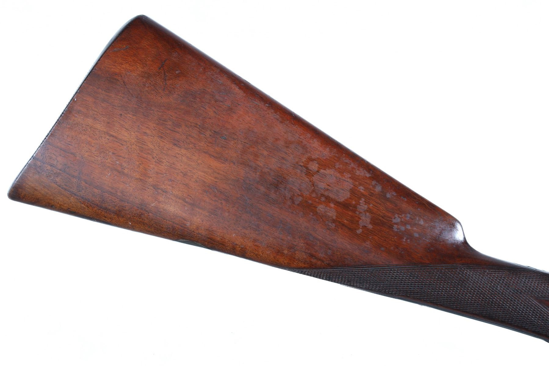 12ga Serial # 7744 Anson & Deeley patented box lock action by Powell with patented lift up top lever opening. 28" choked cylinder and full with 2-1/2" chambers and sleeved Bbl's. Double trigger with lifter extractors. Straight checkered English stock with splinter ofre arm. Condition is very good as sleeved and mechanically excellent. C&R Mfg in 1883 Barrel 28 NO4473