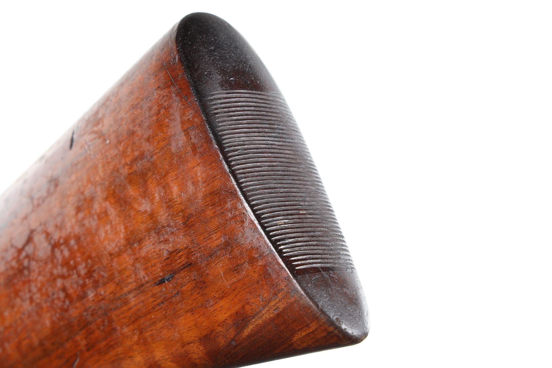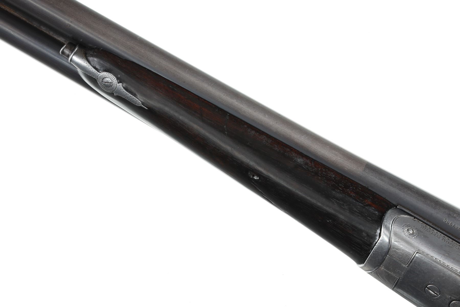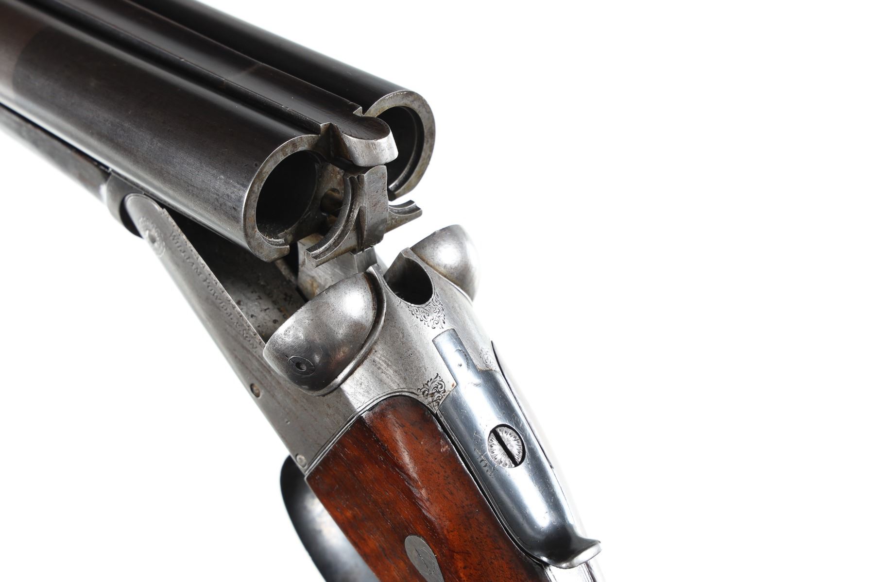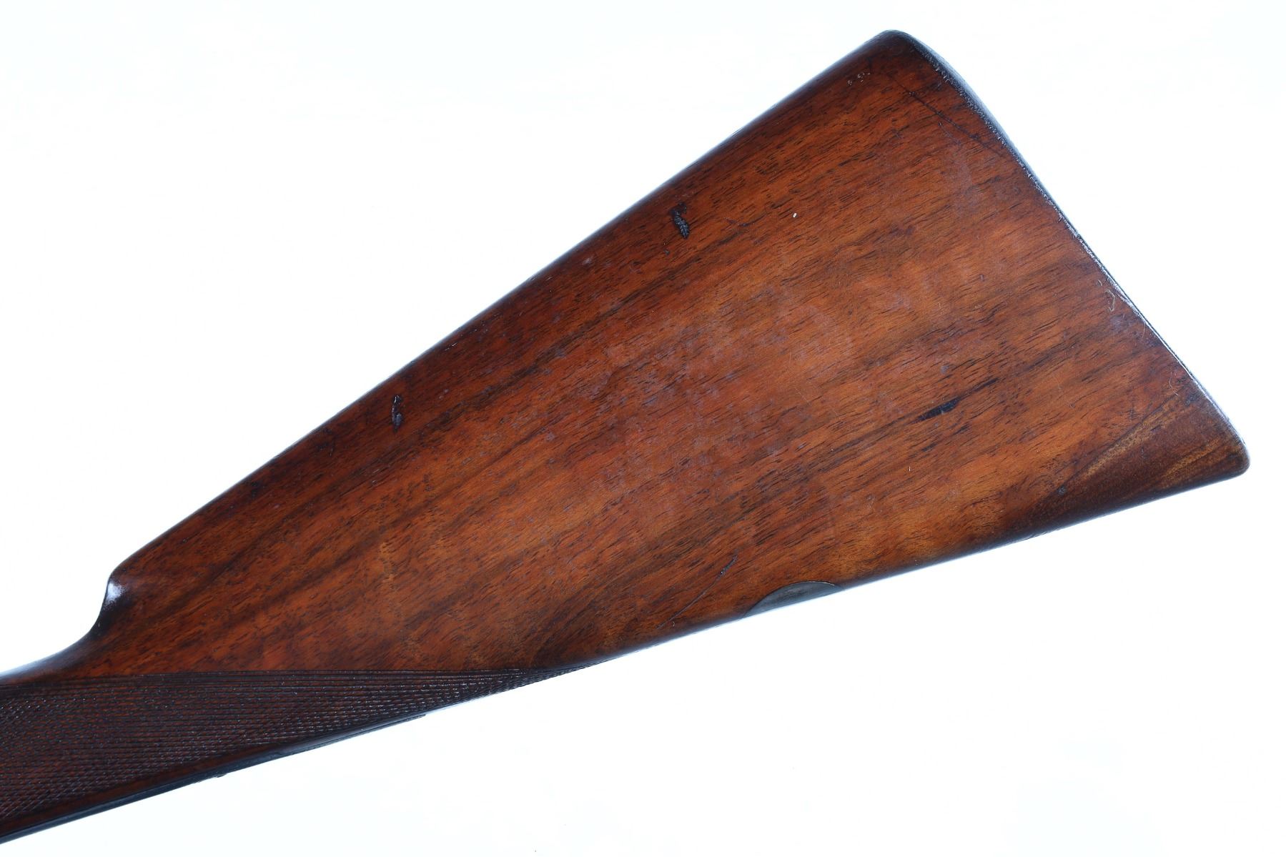 12ga Serial # 7744 Anson & Deeley patented box lock action by Powell with patented lift up top lever opening. 28" choked cylinder and full with 2-1/2" chambers and sleeved Bbl's. Double trigger with lifter extractors. Straight checkered English stock with splinter ofre arm. Condition is very good as sleeved and mechanically excellent. C&R Mfg in 1883 Barrel 28 NO4473
