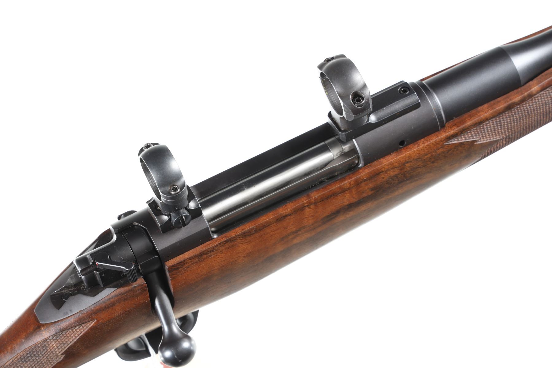 .30-06 Springfield Serial # KW19320 Kimber 8400 Select, Cal, 30-06. Matte blue finished with 1-10 twist Bbl. Adjustable trigger and checkered French Walnut pistol grip stock with steel pistol grip cap. Mauser claw extractor for control feed and 3 position Model 70 safety. One inch steel rings and bases. Very fine with minor field use. Excellent overall. Mechanically excellent. Barrel 24" Modern