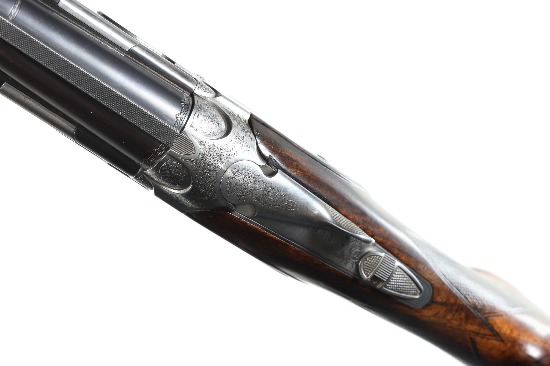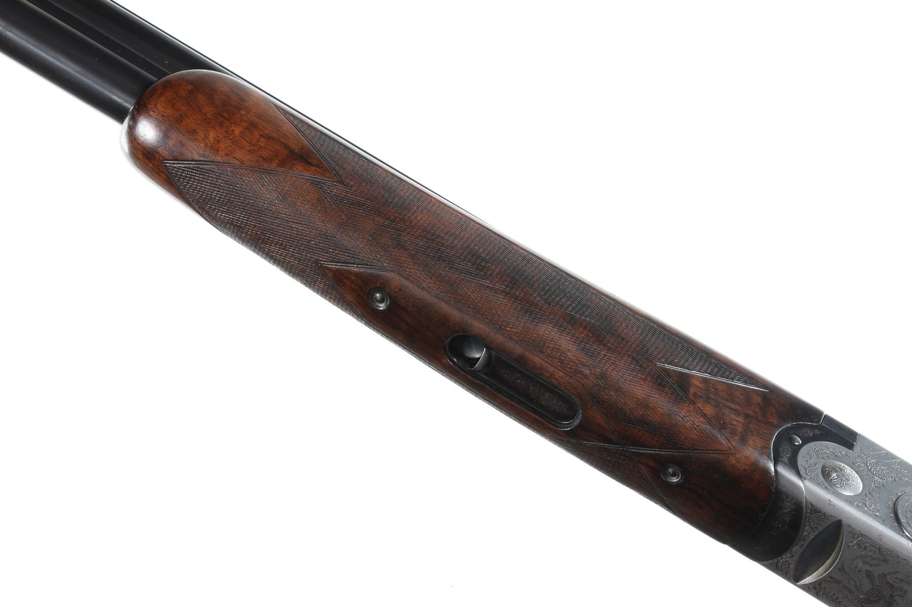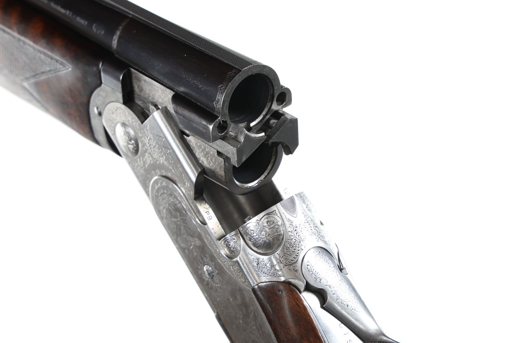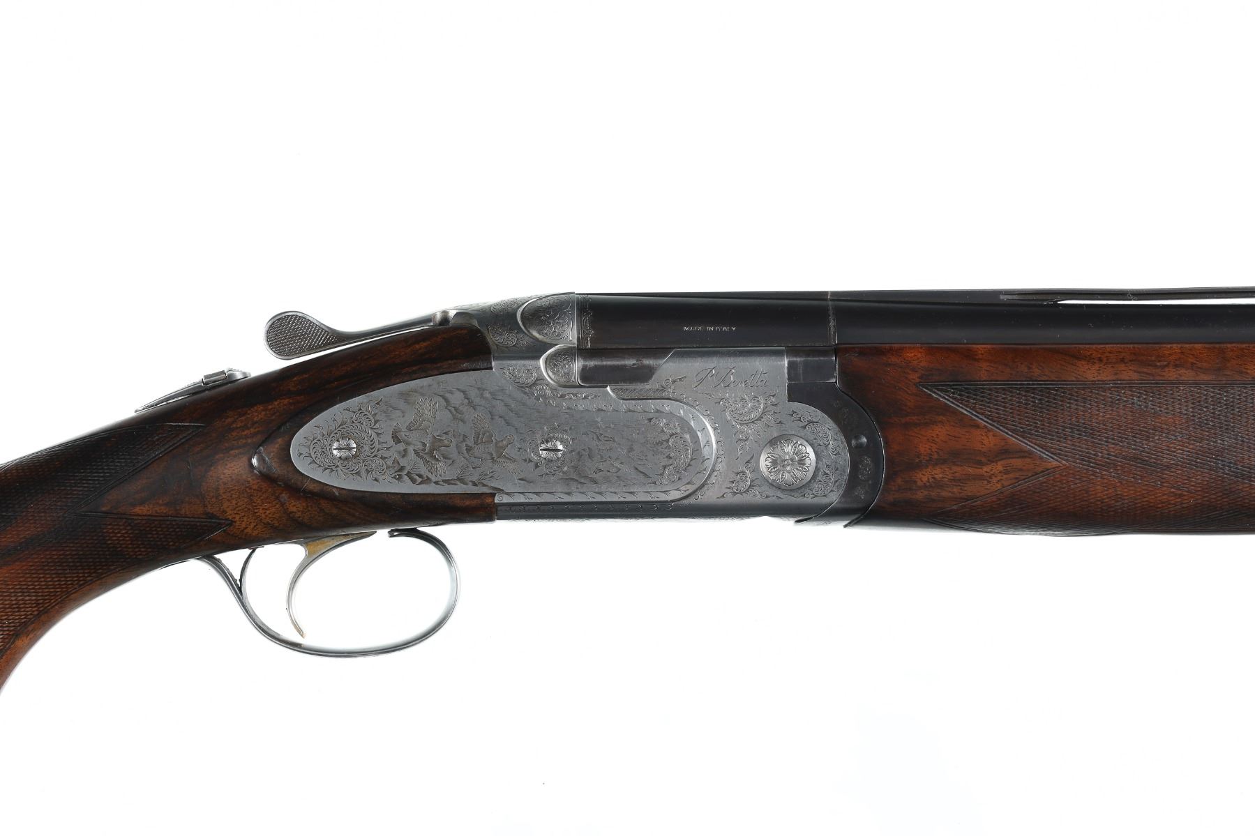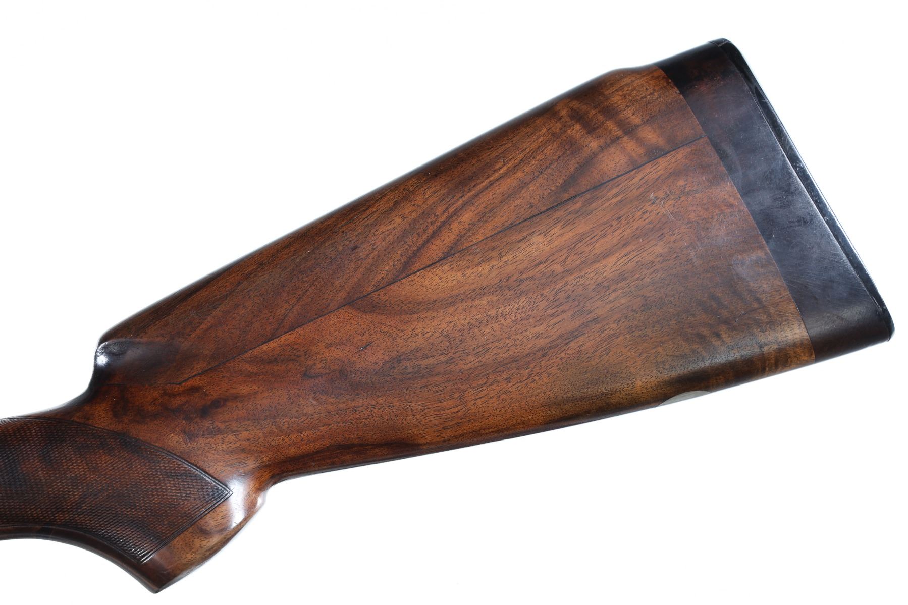 12ga Serial # D75191B Choked Skeet/Skeet, LOP 15". Drop 1 1/2"; 2". Blue finish with vent rib, single selective trigger with ejectors. Sideplated boxlock with multiple game scenes with background filled with scroll and vine engraving. Stocks have custom fitted with riser installed in comb, 1" extension at butt and installation of Browning buttplate. Very fine overall condition with barrels retaining most finish, receiver having white discoloration, stocks are good as mentioned, mechanically excellent. Mfg in 1984 Barrel 28" Modern