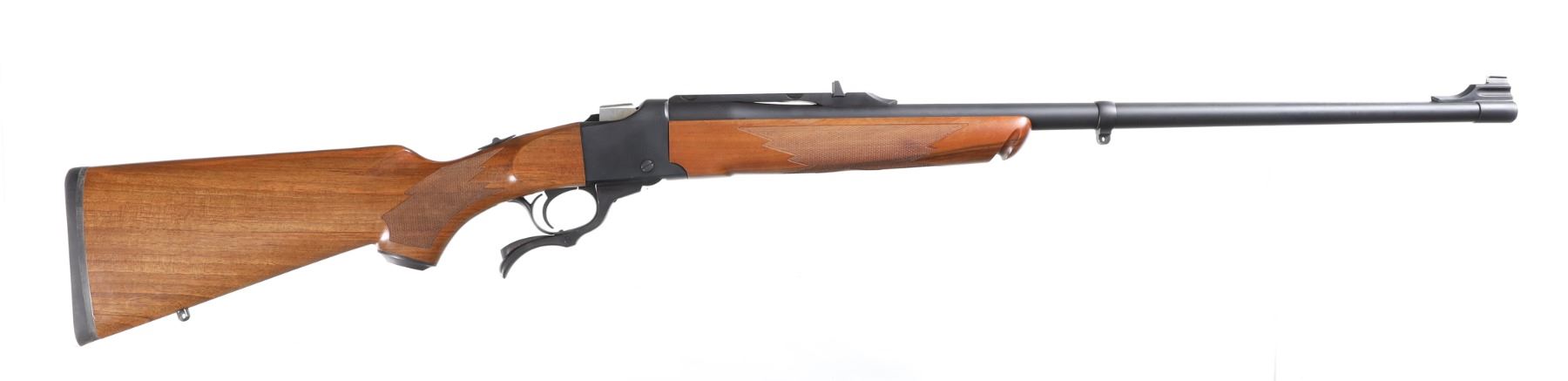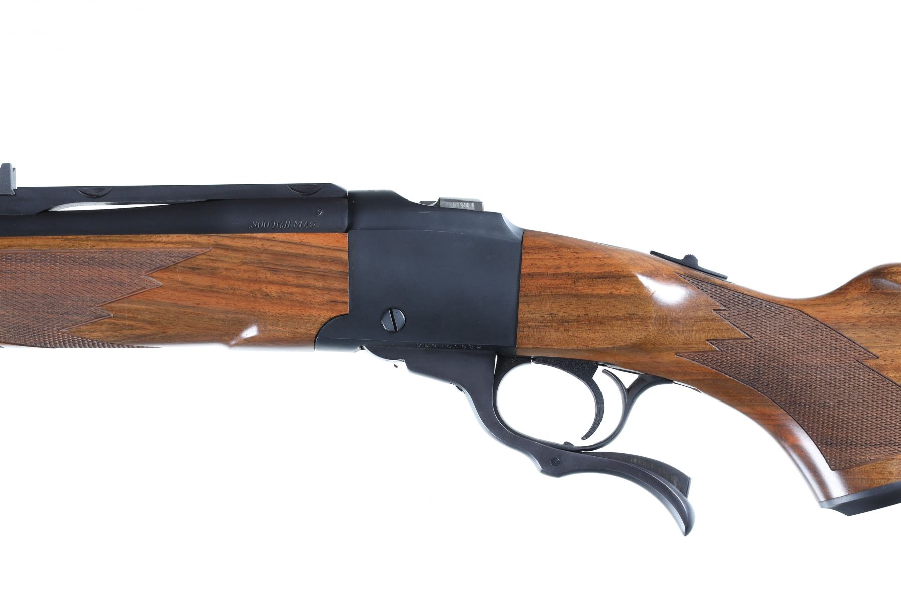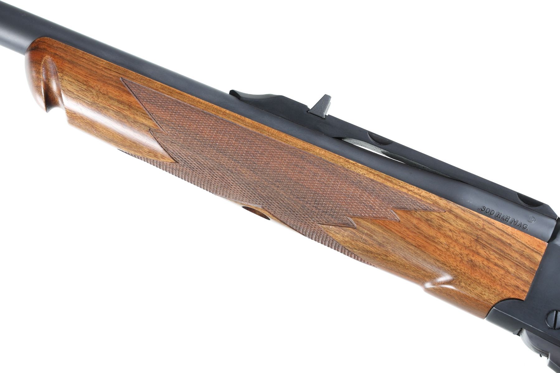 .300 H&H Mag Serial # CB3-00082 Introduced by Ruger as the famed Craig Boddington series. 4 separate calibers all chosen by Boddington with 150 of each caliber made. This is the 3rd in the series and these are the only .300 Holland & Holland Magnums ever produced in a Ruger number 1 by the factory. Stocked with Circasian Walnut with a special selected checkering pattern, Matte blue finish and mounted with quarter rib and open sights. Rifle comes with matching box, papers and lock. Very fine with bright sharp bore and metal retains over 99% finish. Stocks have a number of storage bruises and impressions. Action operates properly. A very uncommon Ruger Number 1. Mfg 2008. Barrel 26" Modern