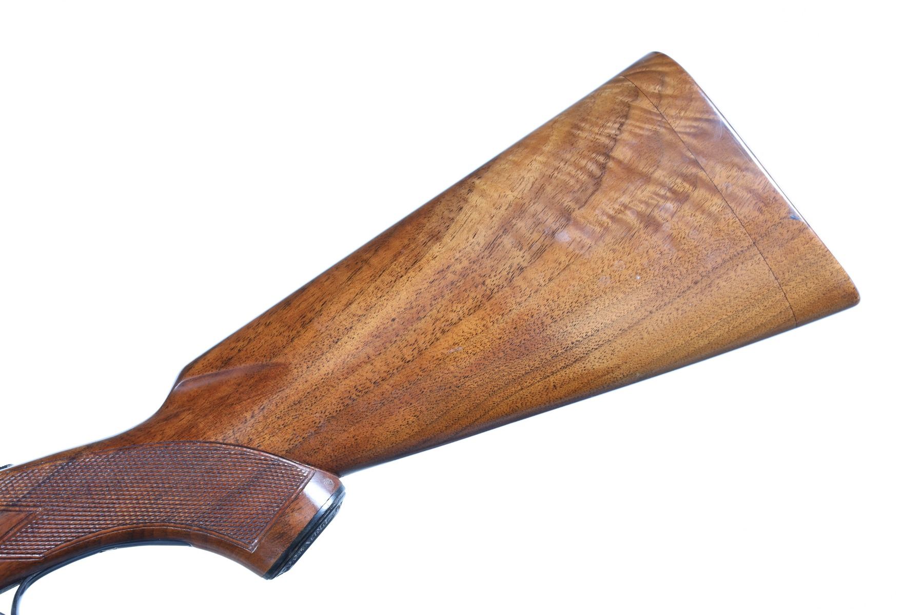 12ga Serial # 24691 Winchester Model 21 12 Ga, with 28" Bbl, choked WS-1 & WS-2 2-3/4" chambers with checkered pistol grip butt stock with 13-3/8" LOP and beaver tail fore arm. Single selective trigger with ejectors. Left Bbl has .014 constriction (skeet) Right Bbl is open with .004 (cyl,)constriction and more open at muzzle. Very fine with bright bores and retaining over 95% blue finish. Stocks are very good with butt having been shortened and having the original wood returned. Ejectors remain in time Mechanically excellent. Drop at Comb1 5/8" Drop at Heel 2 3/8 C&R Barrel 28" C&R