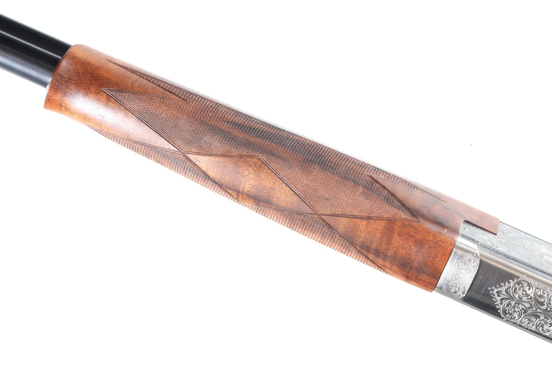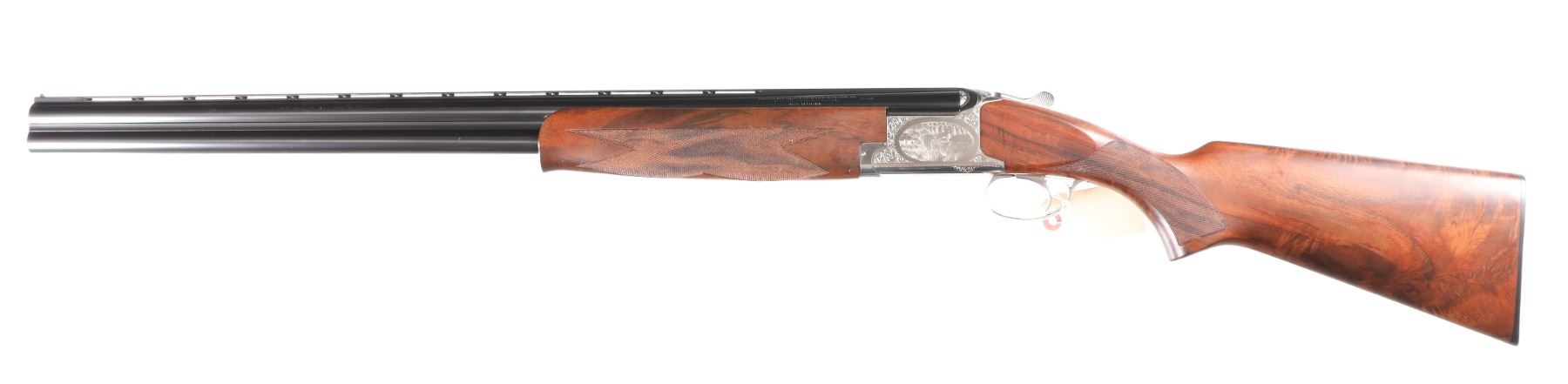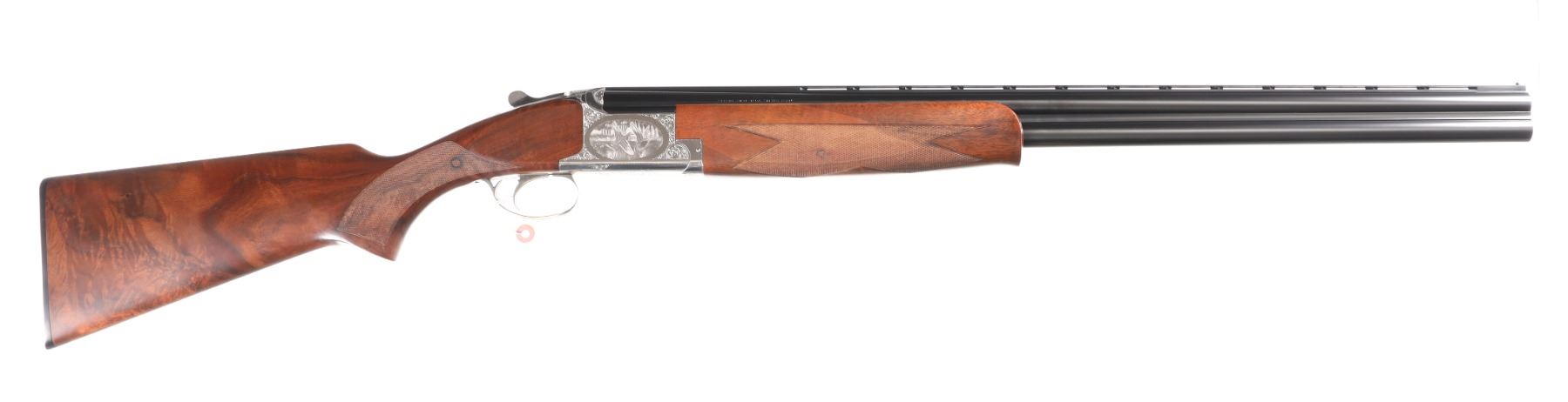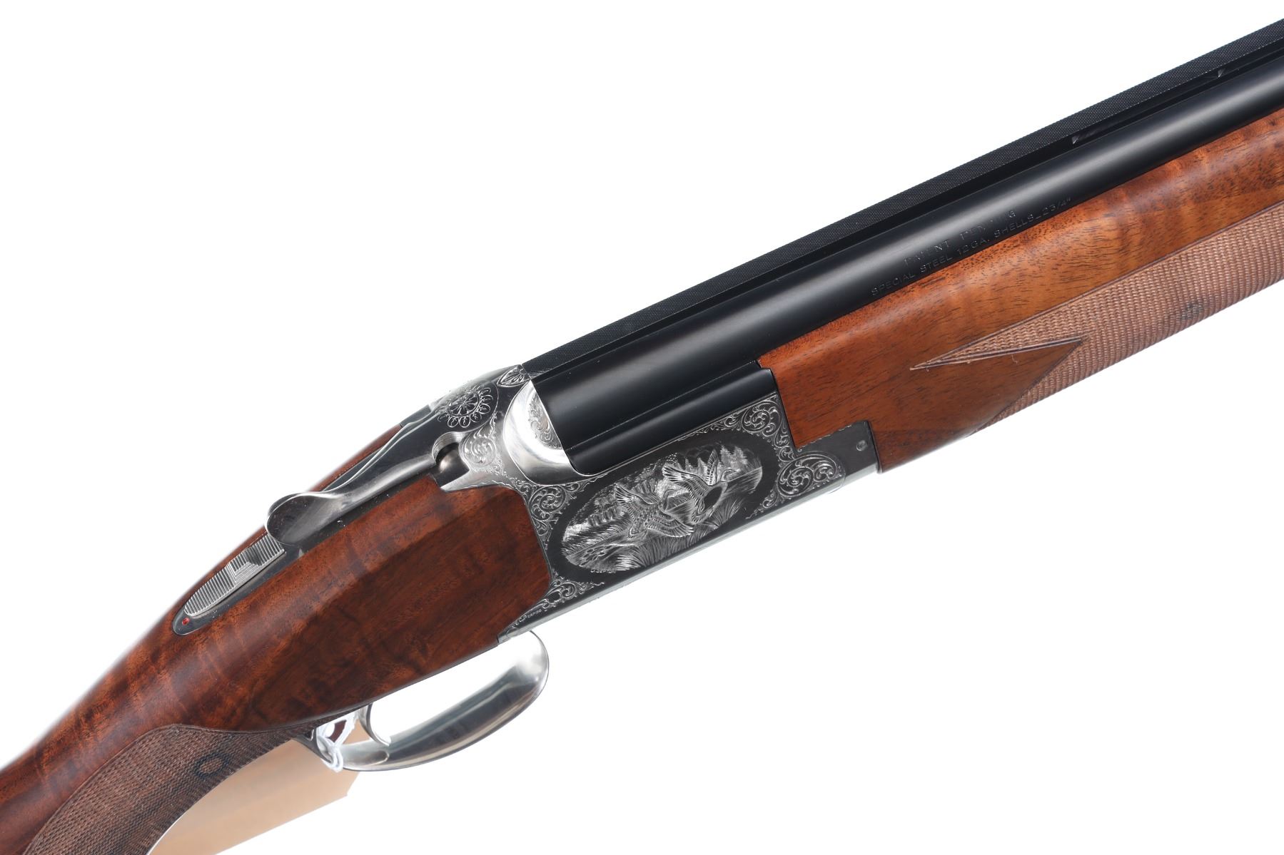 12ga Serial # L13PY02300 Browning Model B 27 Deluxe 12 Ga, Over / Under shotgun with single selective trigger and ejectors. 28" Vent rib Bbl, with single sight bead. Chambered 2-3/4" chambers with Full & Modified chokes. Coin finished receiver with Dual game scene vignettes of launching Mallards in a wetlands scene and 2 flushing Pheasants in a woodland scene. Engraving is dual signed D. Septon and C. Perfido. Stocked with a highly figured walnut with oil finish. 14 1/4" LOP 1 3/4" Drop at Comb 2 1/2" drop at heel . The Belgian production of the model 27 was on 1973 through 1975. Excellent Plus with little or no indication of use. Retaining all of its factory blue finish on barrel and coin finished and engraved frame remains as new. Stocks are excellent with no distress or material losses. Housed in its original numbers matching box with full label and instruction manual. Mechanically excellent. C&R Modern