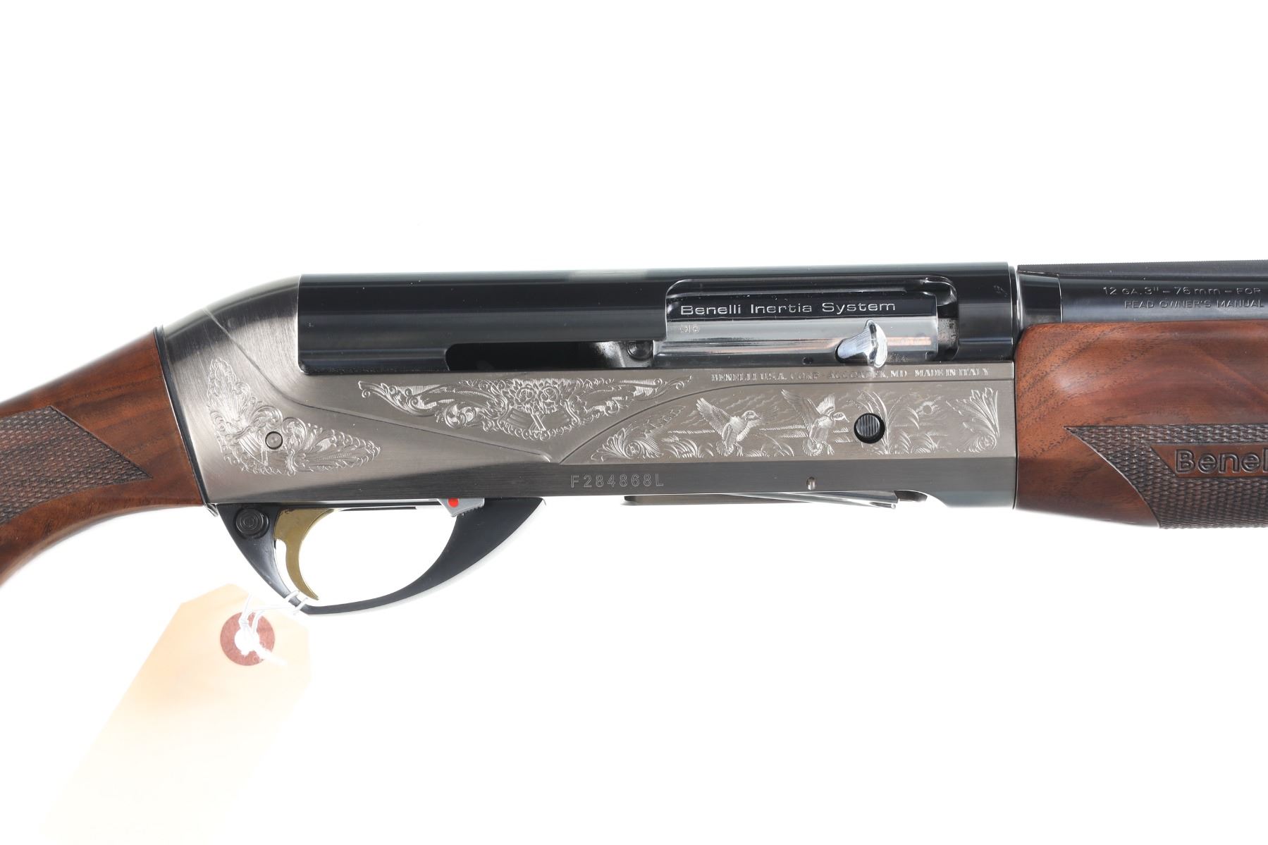 12ga Serial # F284868L Benelli Legacy recoil assist semi-auto shotgun with coin finished receiver and blue finished Bbl, with vent rib. Walnut stocks . Uses 2-3/4 & 3" ammunition interchangeably. Excellent plus overall condition, mechanically excellent. Manufactured in 2010. With a factory soft case. Chamber marked 3", interchangeable chokes (improved cylinder installed), and 14 1/4" LOP. Barrel 28" Modern