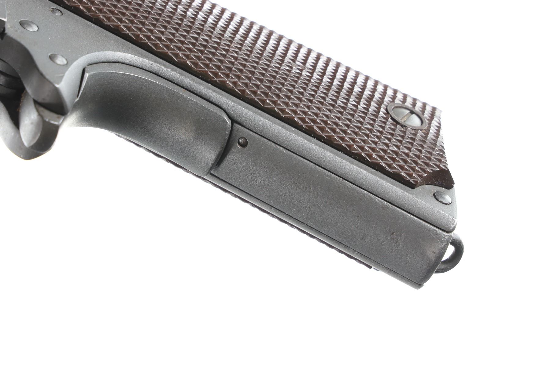 .45 ACP Serial # 424261 Augusta Arsenal refurbished with parkerized finish, fiber brown checkered grips. Fine overall condition as refurbished, mfg in 1918. Barrel 5" C&R