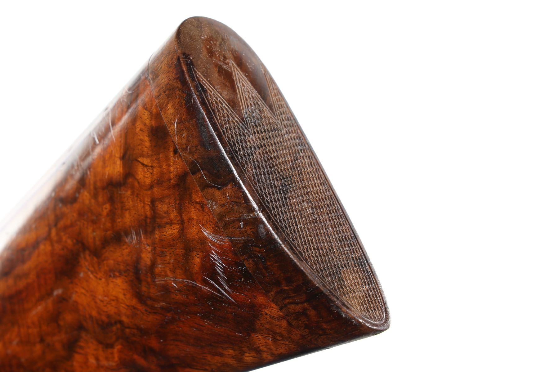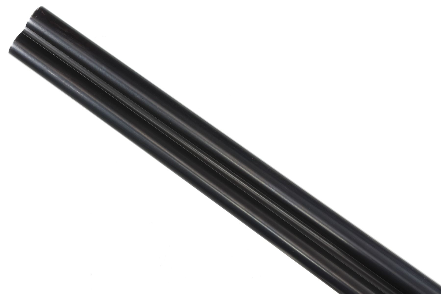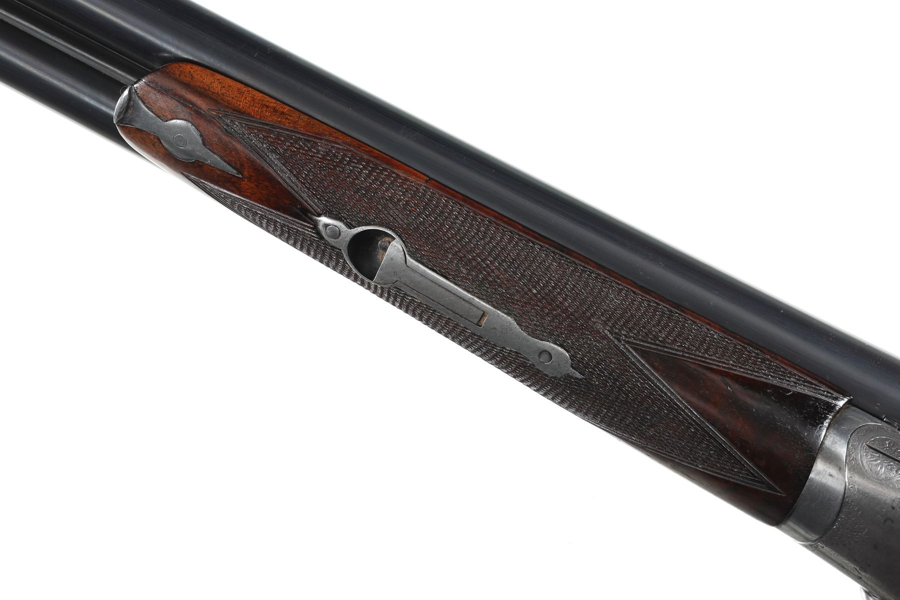 12ga Serial # 14129 2 1/2" chambers, choked Imp Cyl/Imp Mod, double trigger with extractor, LOP 14 1/2". DAC 1 3/8", DAH 2 1/2". Excellent overall condition as recently refreshed with English sleeved barrels and reproofed in London. Stock has had checkering cleaned with 7/8" extension added, elegant lightweight English double in very fine condition. Mfg in 1895 Barrel 26" NO4473