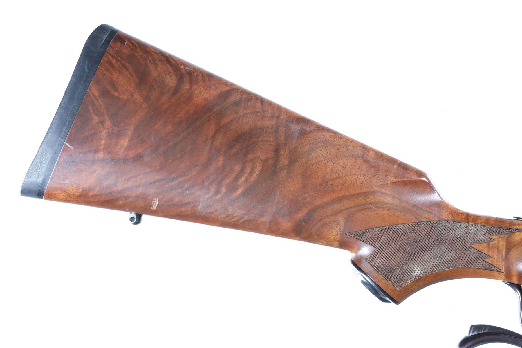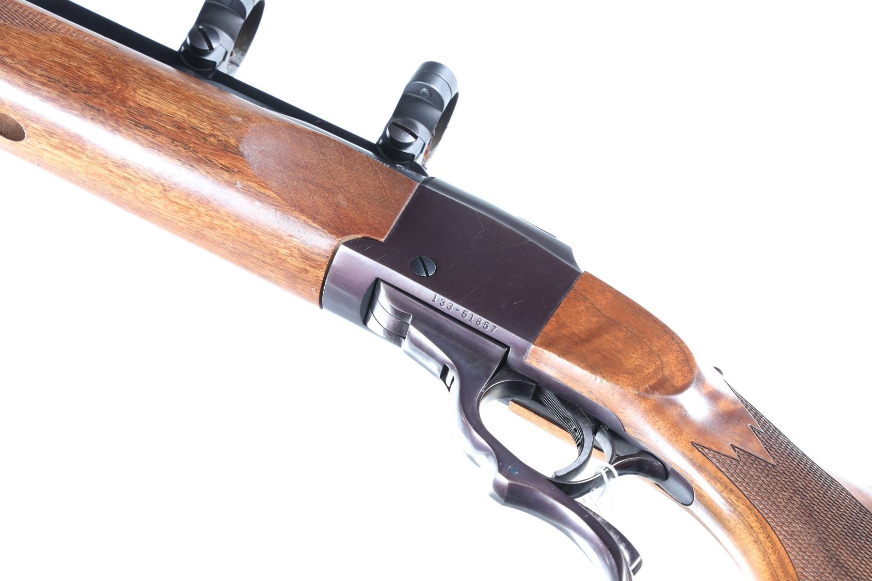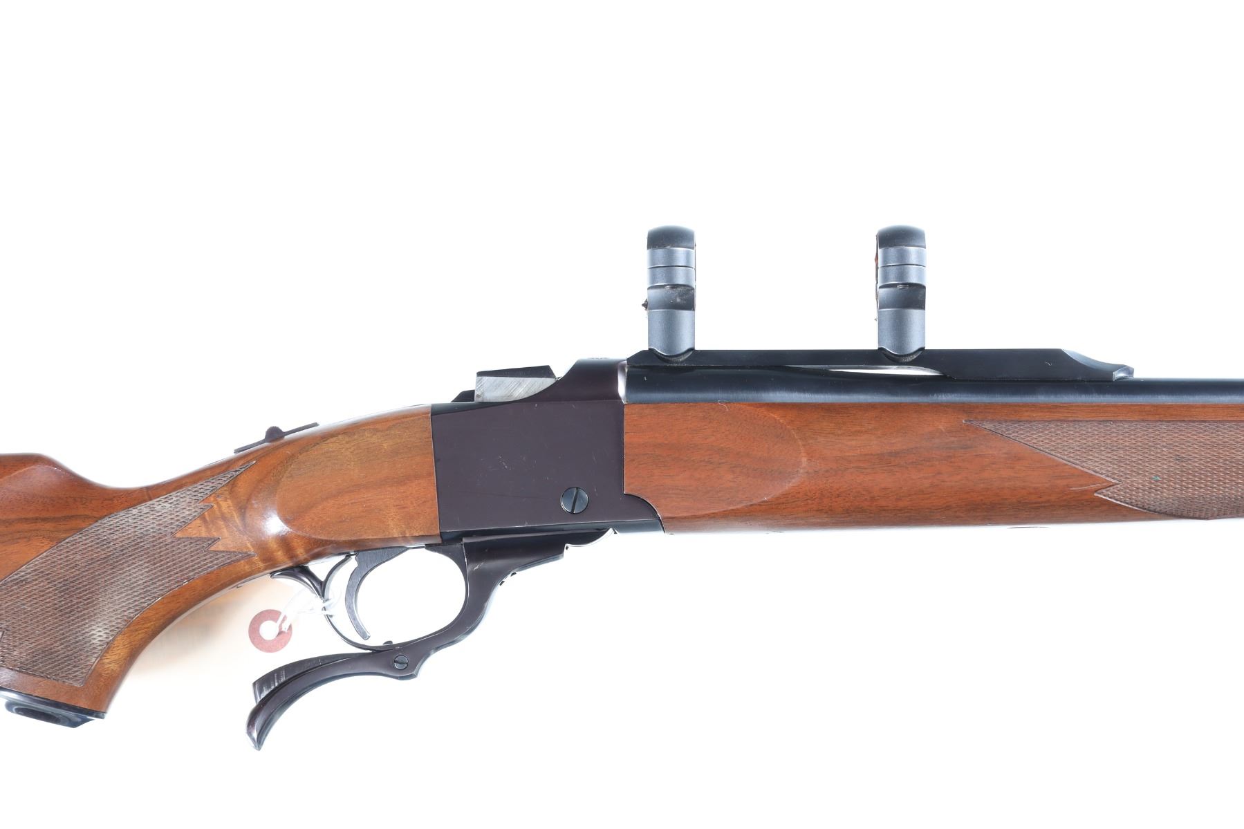 .270 Win Serial # 133-51857 The American single shot rifle. Ruger Number One chambered for 270 Win with blue finished steel tang safety. Varnished checkered pistol grip stocks with factory recoil pad. Factory quarter rib. Metal surfaces rate excellent, light marring and handling marks to wood. No provision for front or rear sight. Mfd 1998 Mechanically excellent. Barrel 26" Modern