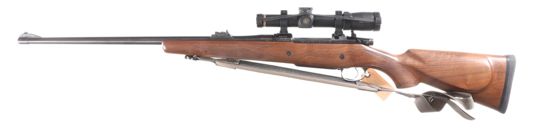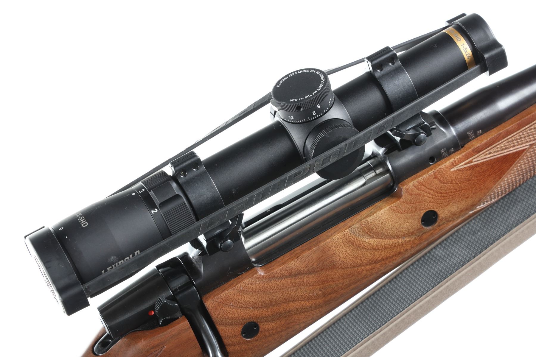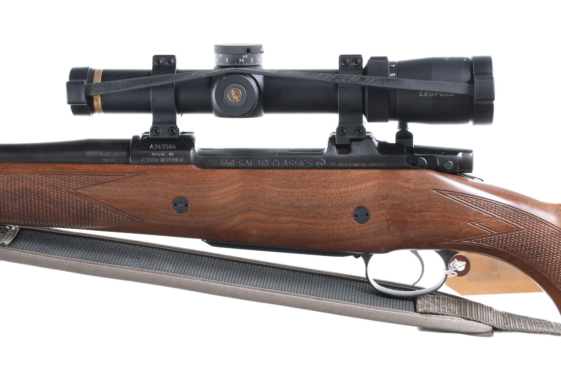 .416 Rigby Serial # A245504 CZ Brno Model 550 Safari chambered for 416 Rigby. Blue finished with single set trigger. Varnished checkered pistol grip walnut stock. Double stock cross bolts. Excellent overall condition, minimal handling marks. Leupold Vari VX-V HD 1-5x24 scoped, clear optics. Mechanically excellent. Barrel 25" Modern
