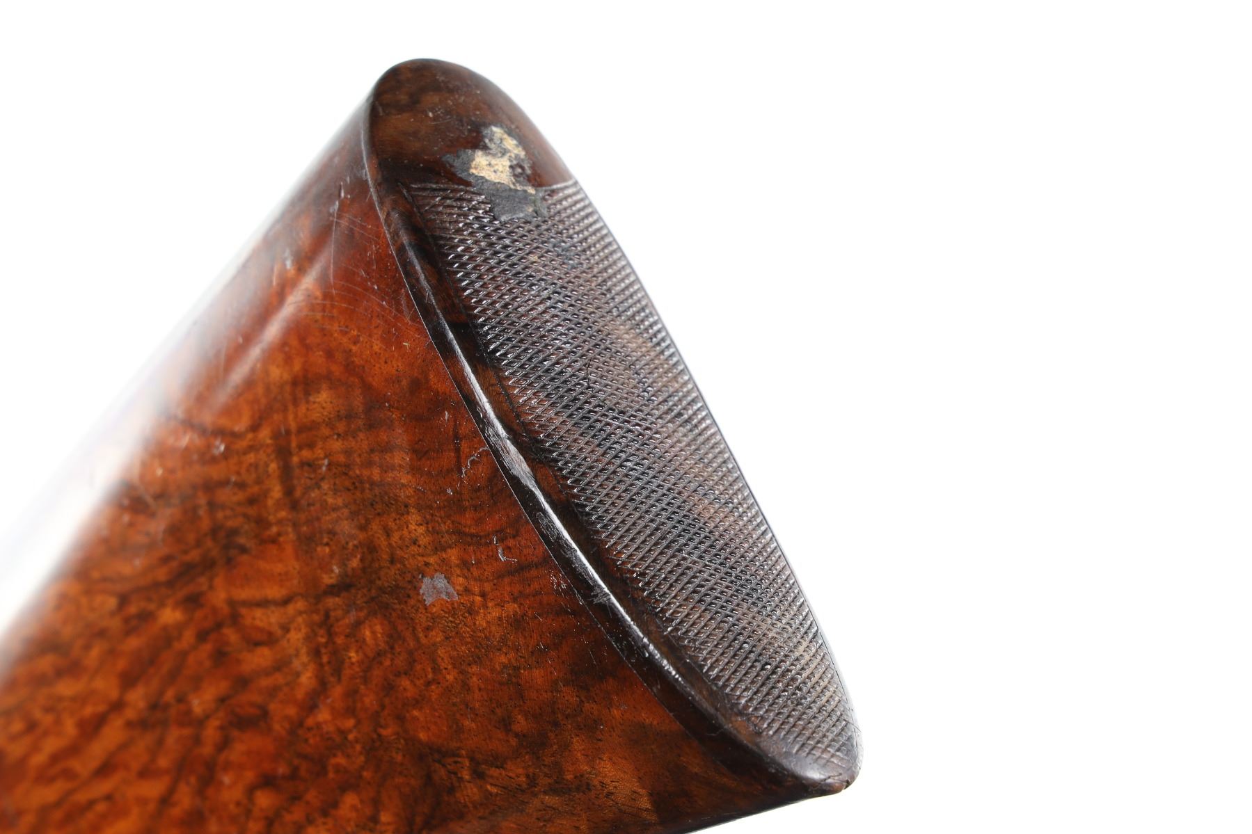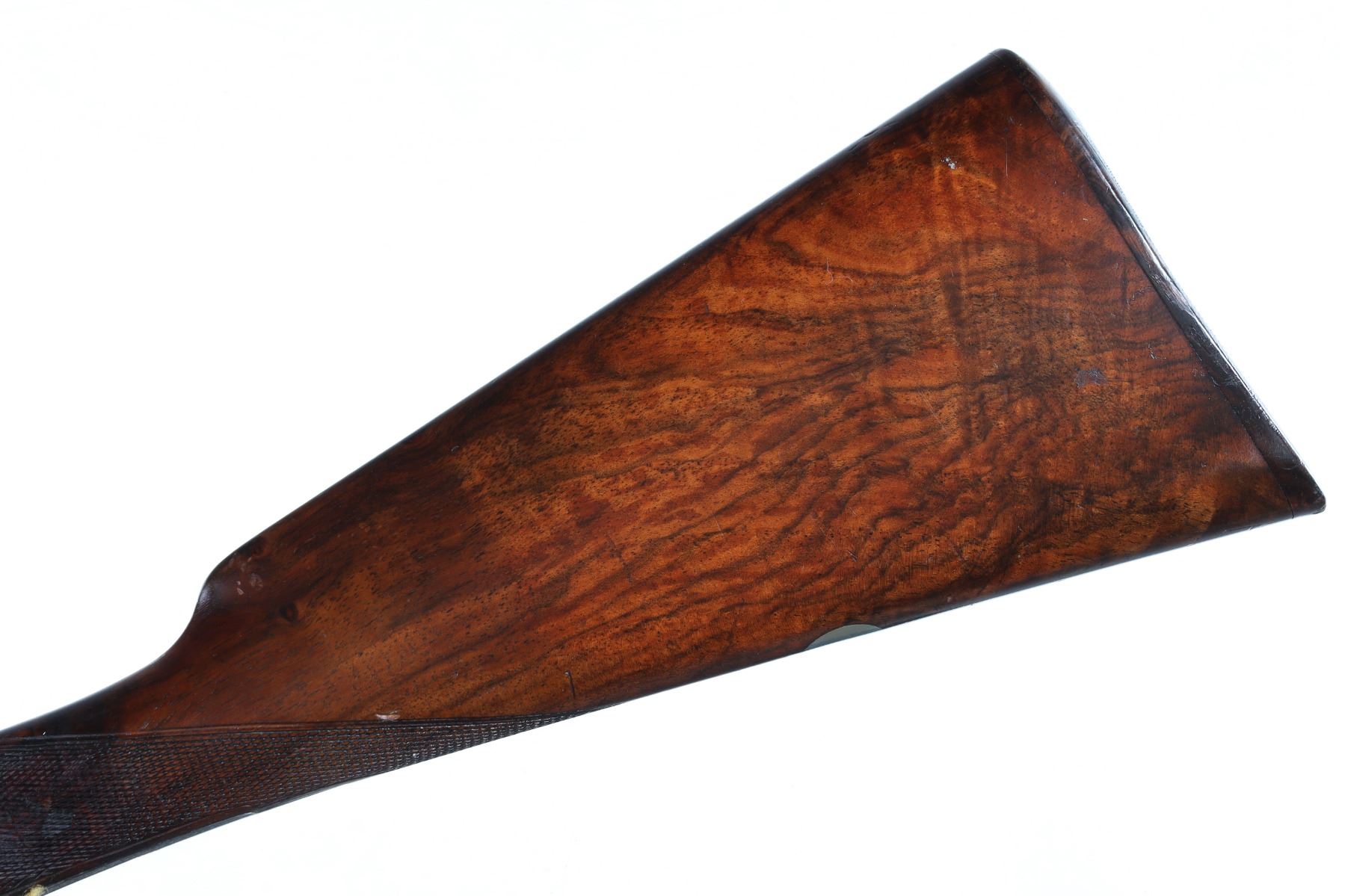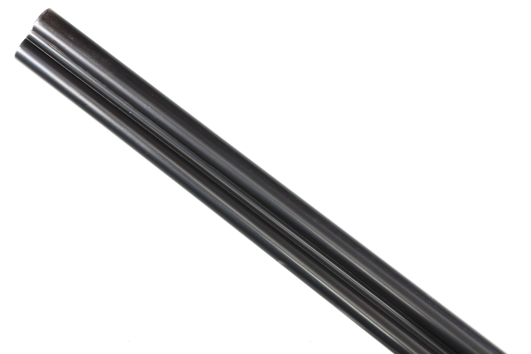12ga Serial # 76064 Choked Full/Imp Cyl, 2 1/2" chambers. Double trigger with ejectors, straight English stock, receiver marked Webley Scott LTD on both sides with modest scroll and vine engraving. Top rib marked Webley & Scott Birmingham, LOP 14 3/4", DAC 1 3/8', DAH 1 7/8". Very fine overall condition with slight finish loss at muzzle and breach. Stocks are very good with light wear to checkering, some bruises and impressions. Mechanically excellent. Mfg in 1939 Barrel 28" C&R