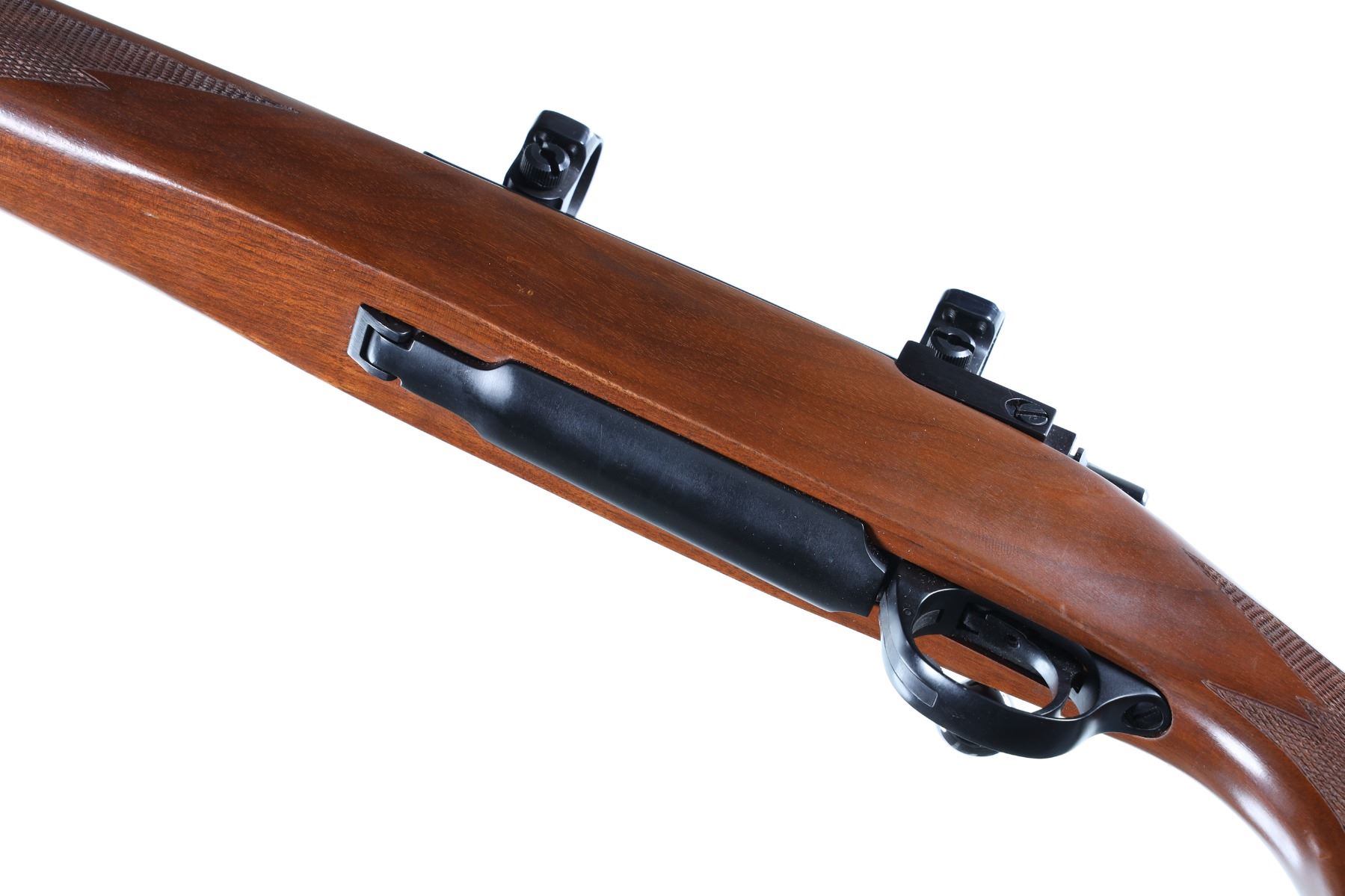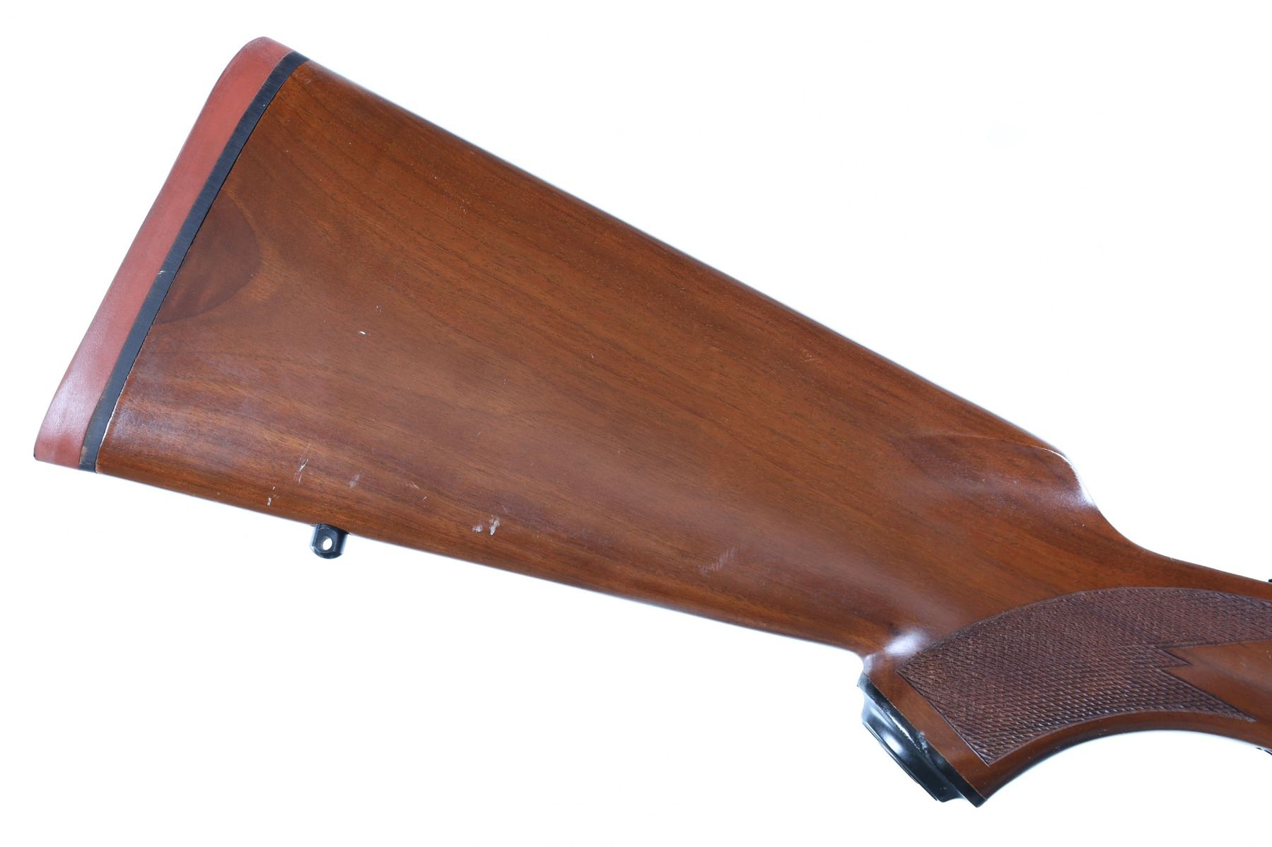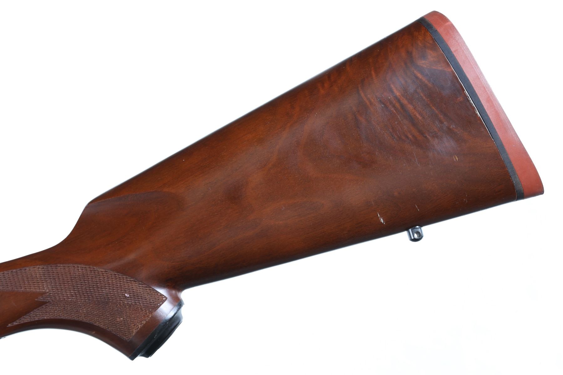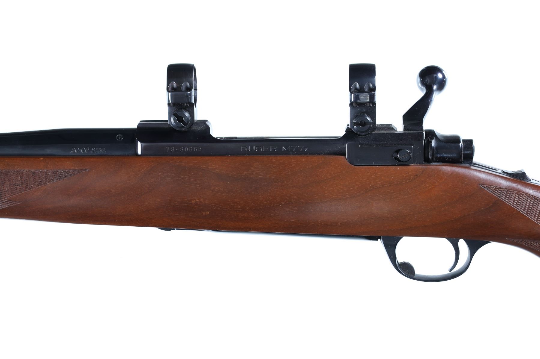 .30-06 Serial # 73-80668 Discontinued Ruger M77 with Tang safety and red butt plate, Checkered walnut stock with pistol grip. Comes with factory 1" rings. Very fine with a few minor storage marks and bruises. 99% blue finish remains. Bore is brilliant bright and action operates properly. Barrel 22" Modern