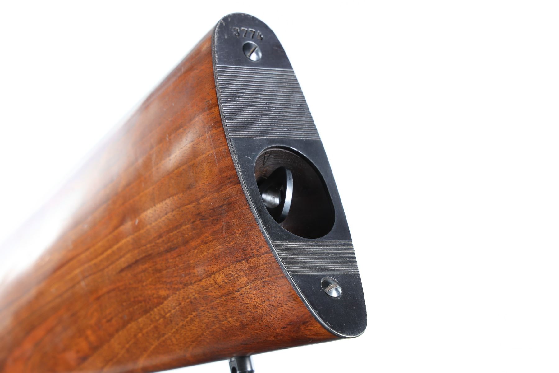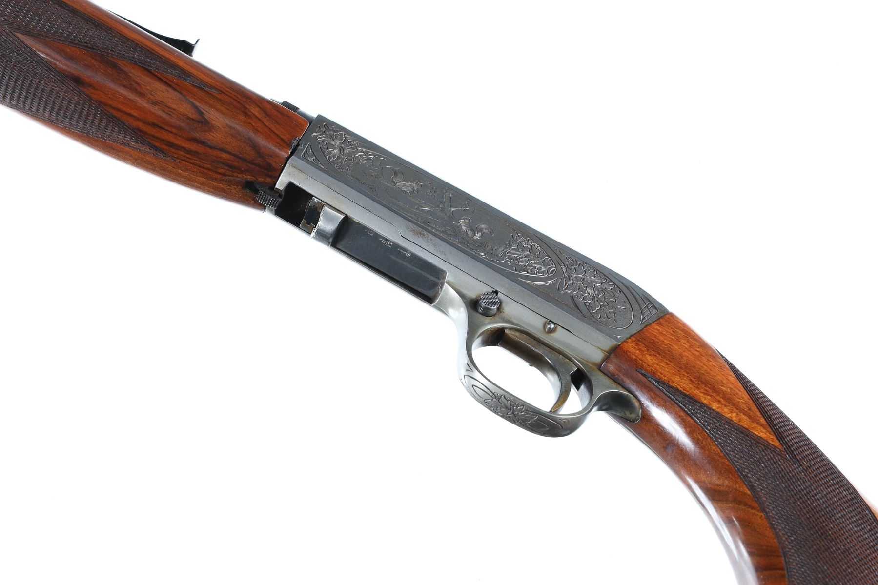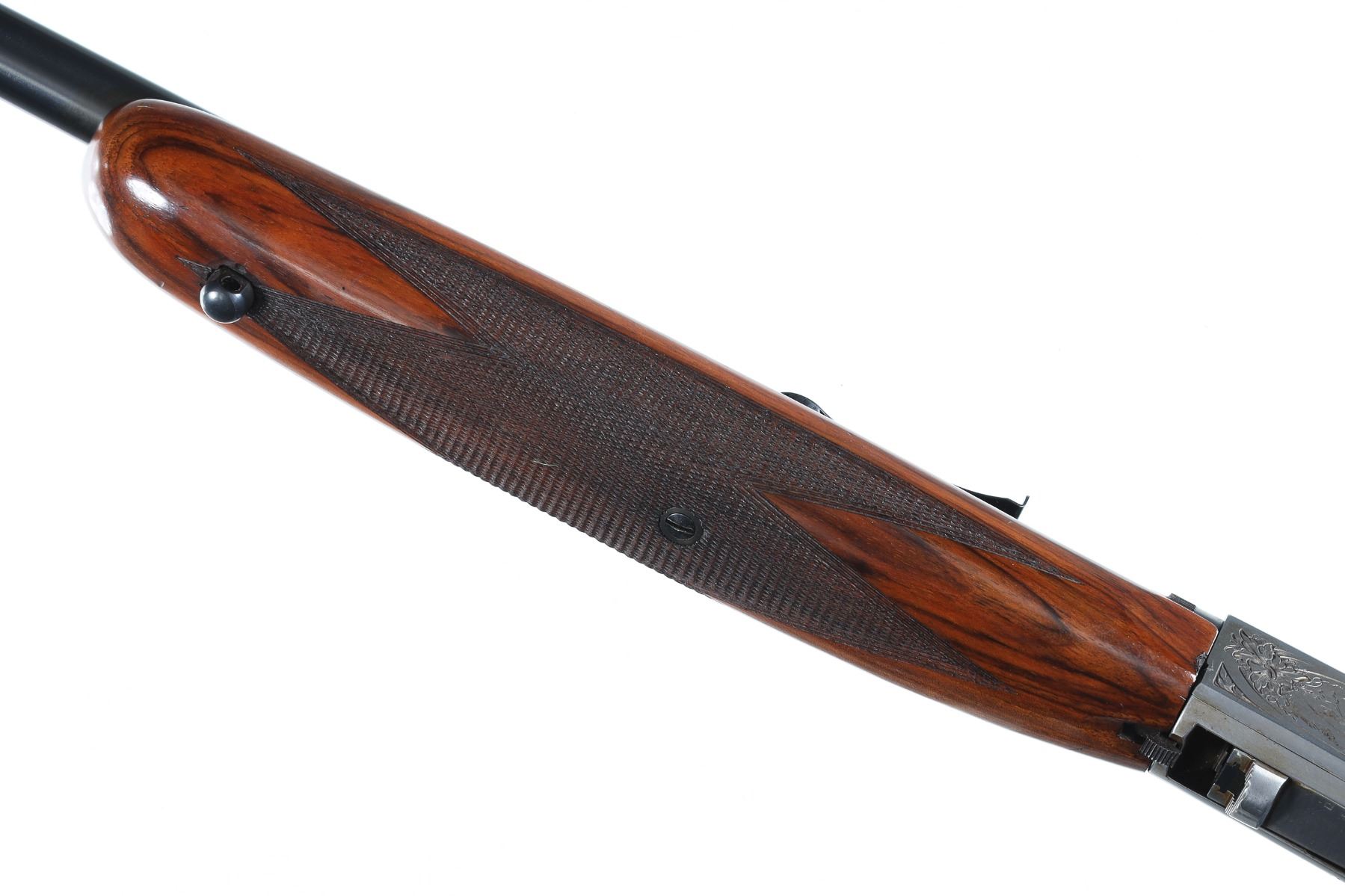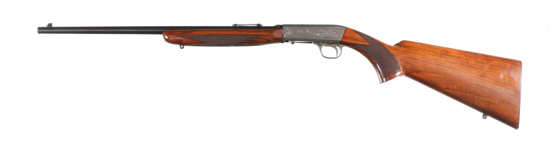 .22 lr Serial # T3774 Browning SA-22 Made in Belgium with select wood stocks and Grade II engraved with coin finished receiver. Steel butt plate and serial number 3774. 22 Long Rifle. 3 Game scene vignettes of Squirrels, Launching water fowl and Prairie Dogs. Very fine with most all blue finish remaining. Bore is brilliant bright. Stocks are very fine with some minor bruises and impressions and sling swivel studs. mfg 1956 Mechanically Excellent. Barrel 19 1/2" C&R