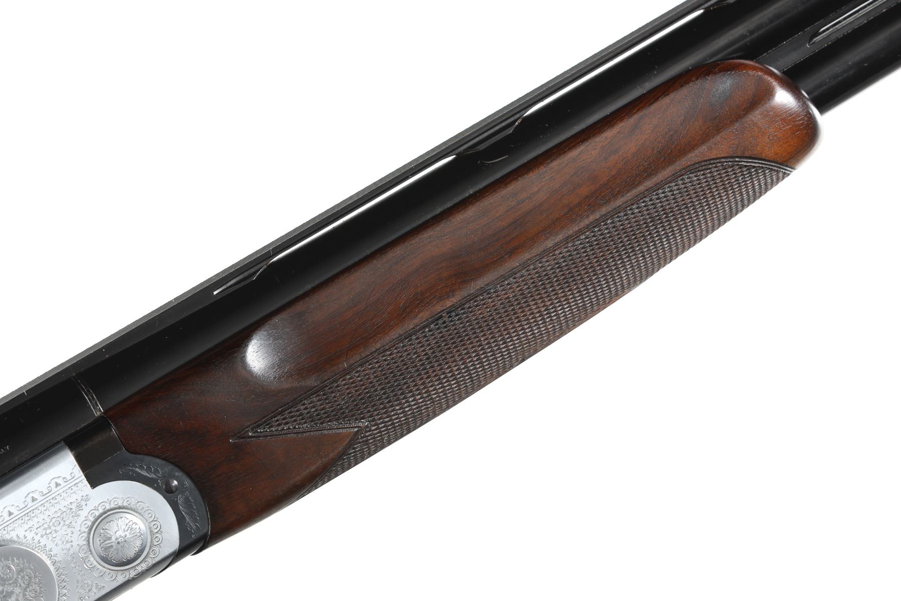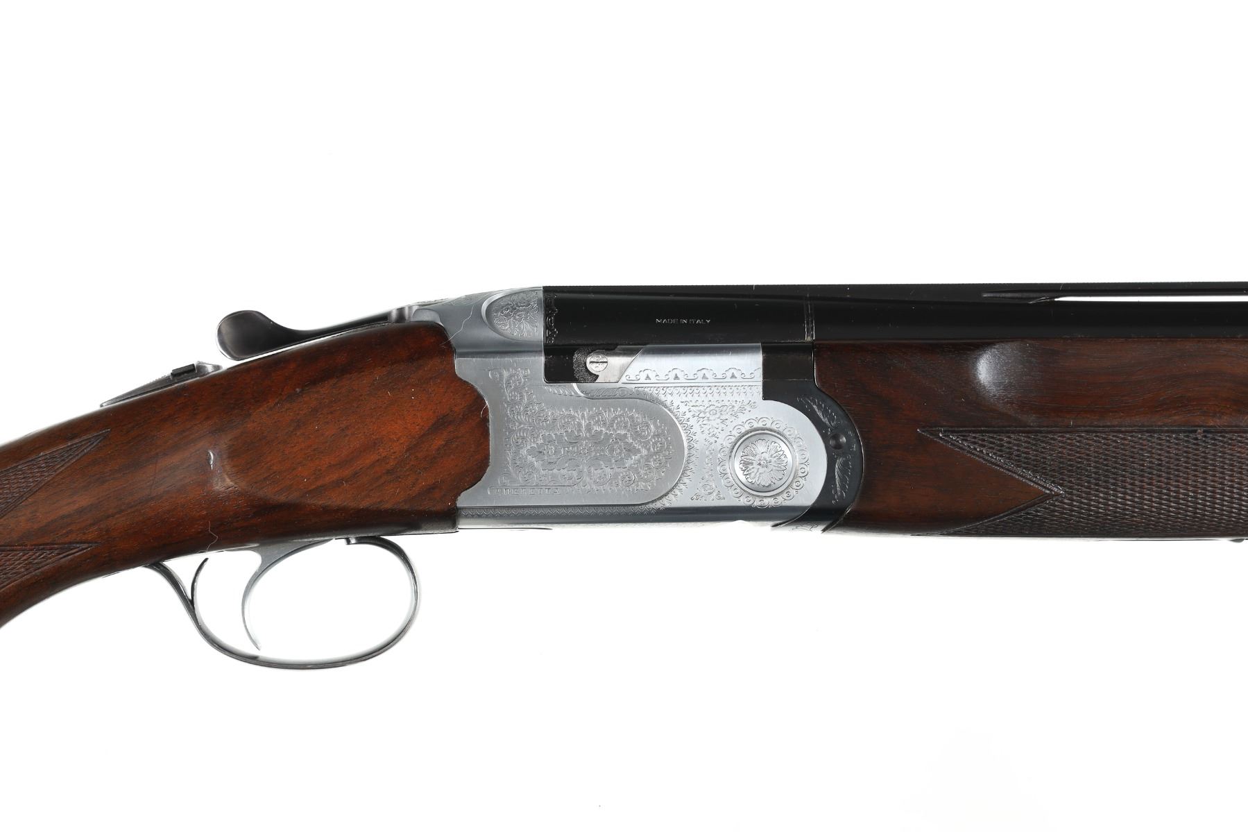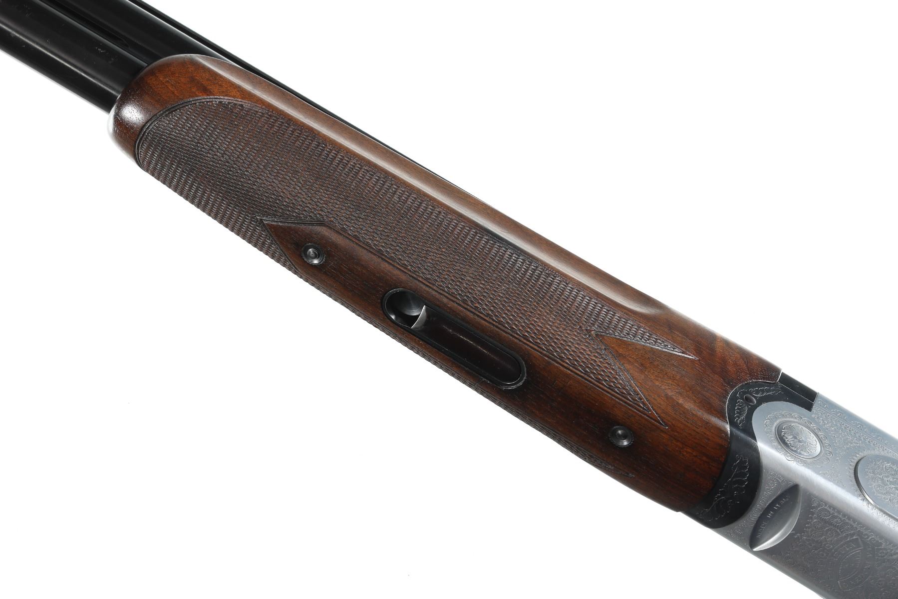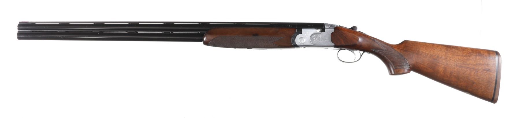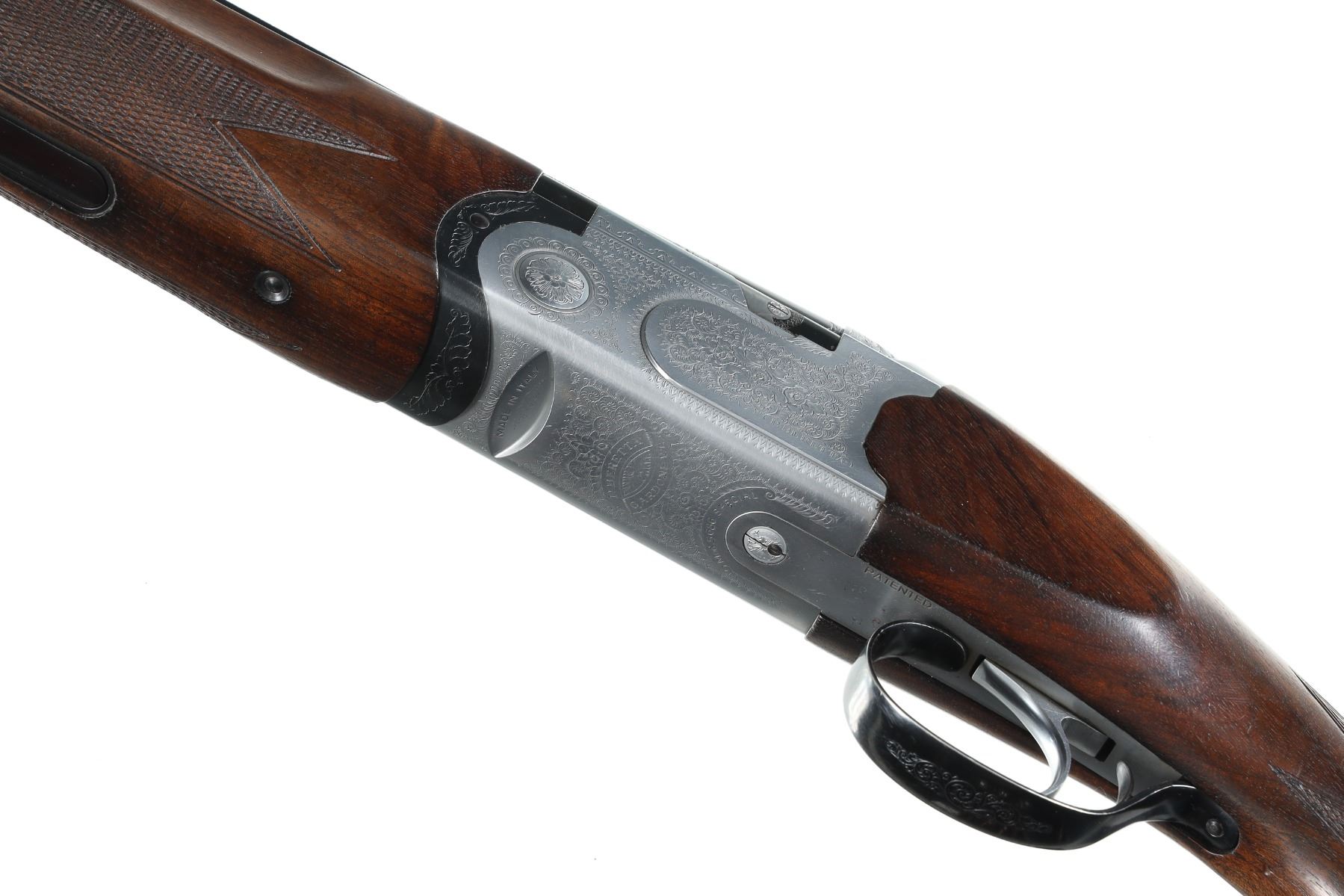12ga Serial # E54678B Choked Imp Cyl/Imp Mod. LOP 14 1/4", Drop 1 3/4"; 2 1/2". Single selective trigger with ejectors. Blue barrels with vent rib, coin finished receiver with Beretta rose and scroll engraving, oil finished checkered pistol grip stock. Very fine overall condition with English reblacked barrels. Stocks are excellent with minor impressions. Mechanically excellent. Mfg in 1985 Barrel 29 1/2" Modern
