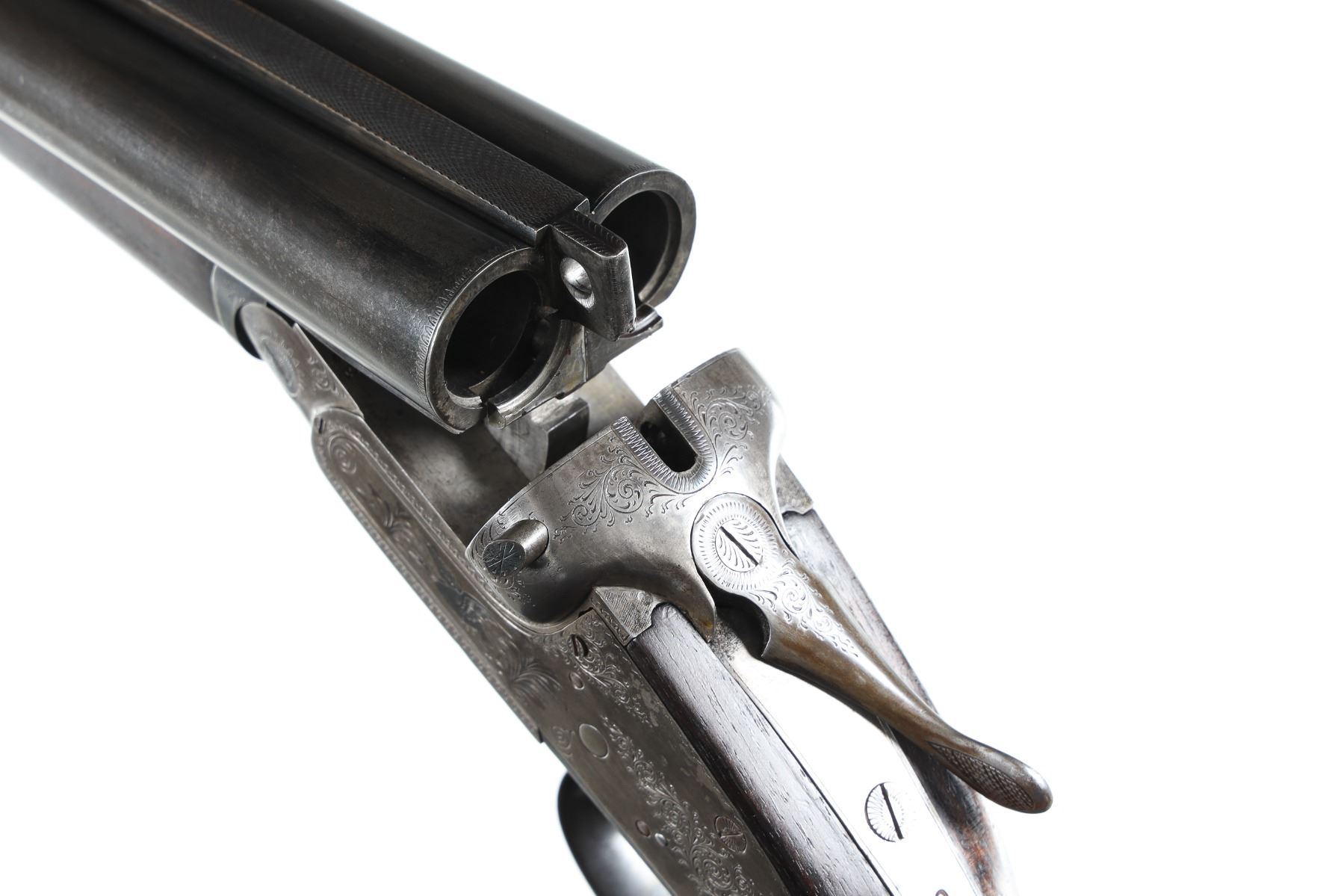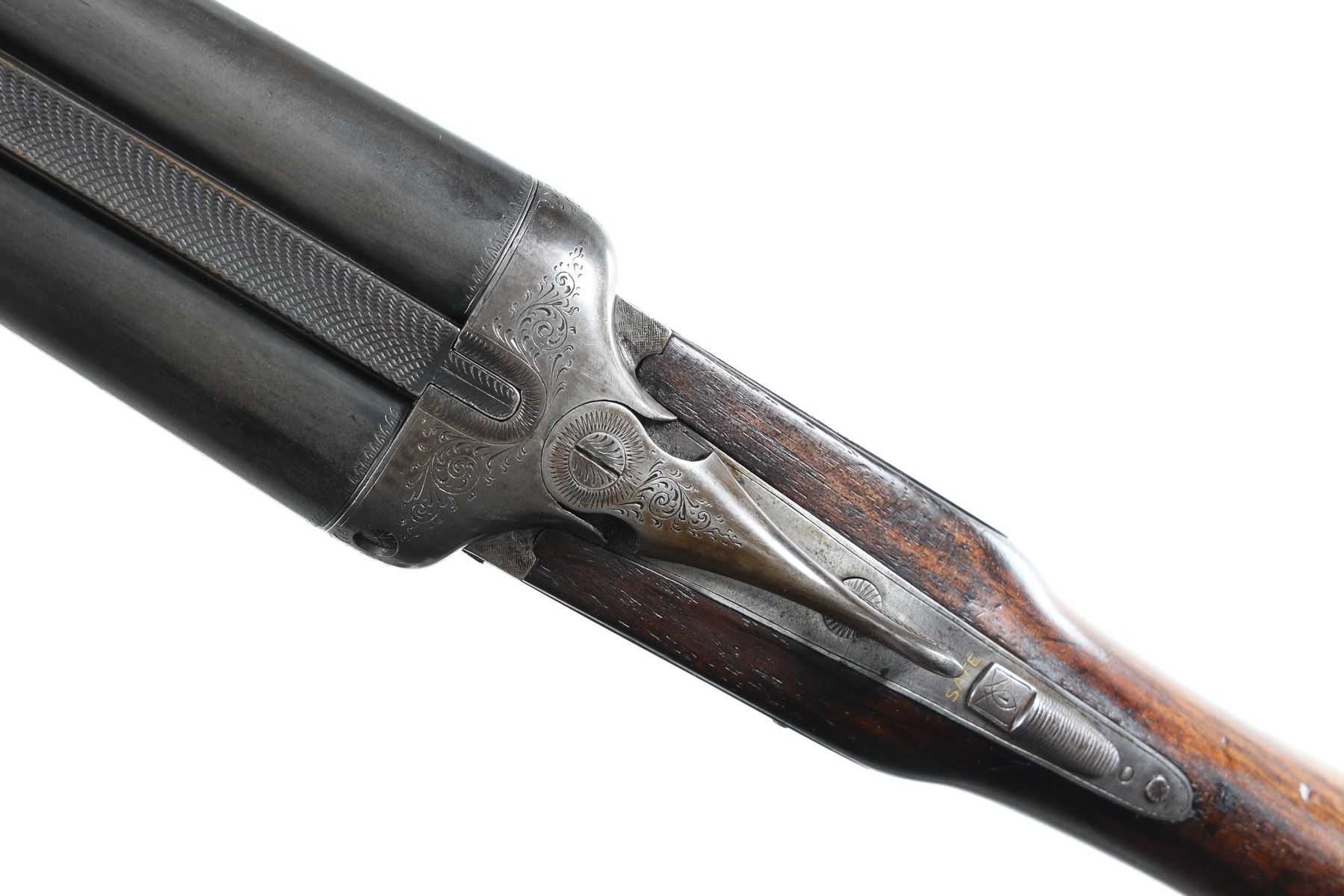 12ga Serial # 393 6 pin sidelock double 12 Bore shotgun with 2 3/4" chambers and choked Skeet & Skeet. Dual game scene engraved with waterfowl in a wetlands. 15" LOP over 1" recoil pad. Walnut pistol grip stock with splinter forearm with double triggers and lifter extractors. Pre-WW2 proofs. C&R Mechanically fine Barrel 30 C&R