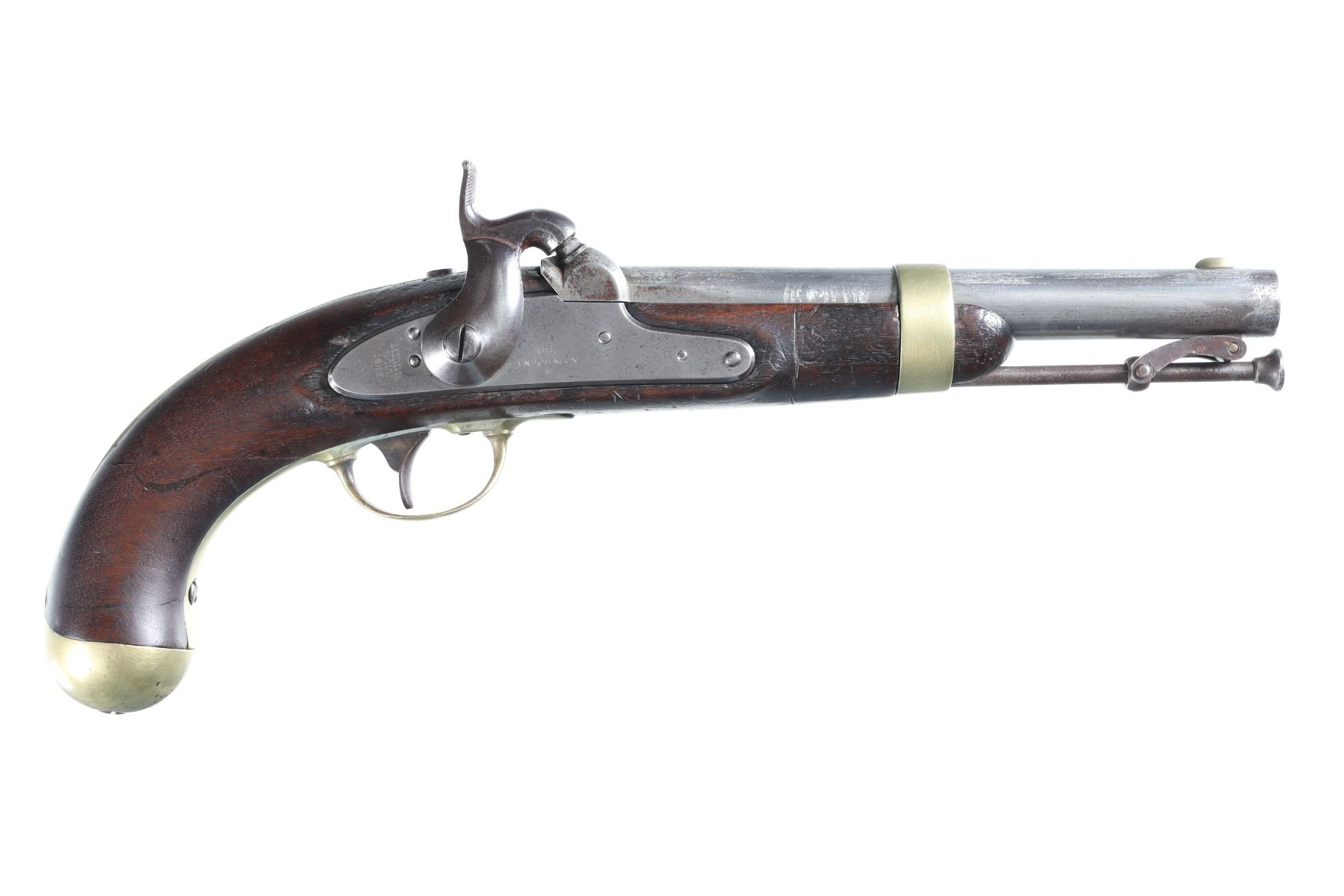 .54 perc Serial # NSN Produced by Ira N. Johnson of Middletown Conn with brass furniture and mounts. 8 1/2" 54 caliber smooth bore with swiveled ram rod. Percussion ignition and oil finished one piece walnut stock. Lock is dated 1853 and breech is dated 1849. Good with iron having been cleaned bright with some evidence of pitting. Bore is dark. Brass is lightly cleaned but attaining a yellow patina. The stock has some wear with bruises and impressions, but no material losses evident. Action operates properly and pistol remains attractive. Barrel 8 1/2" NO4473