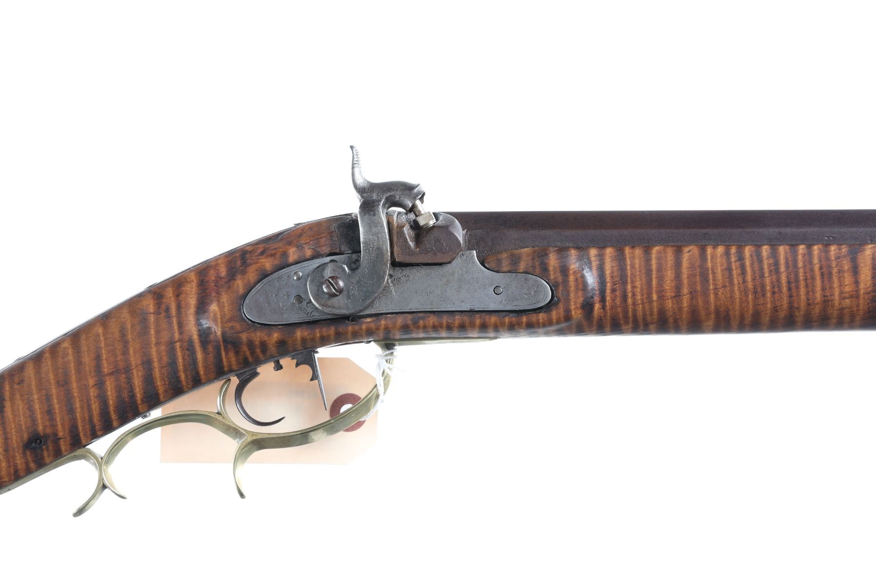 .52 cal Serial # NSN Antique Percussion half stock rifle by Valentine Gahr of Scioto Ohio circa 1850"s. Tiger Maple stock with Leman furniture and pewter forend cap. Goulcher marked percussion lock with Double set triggers. Fine with minor restoration. Triggers have been cleaned / restored and are possible replacement. Rear sight is contemporary replacement. Stock has been glass bedded at breech and nipple replace. Action operates properly and is believed to have been shot in recent past. Mechanically fine. Barrel 37 7/8" NO4473
