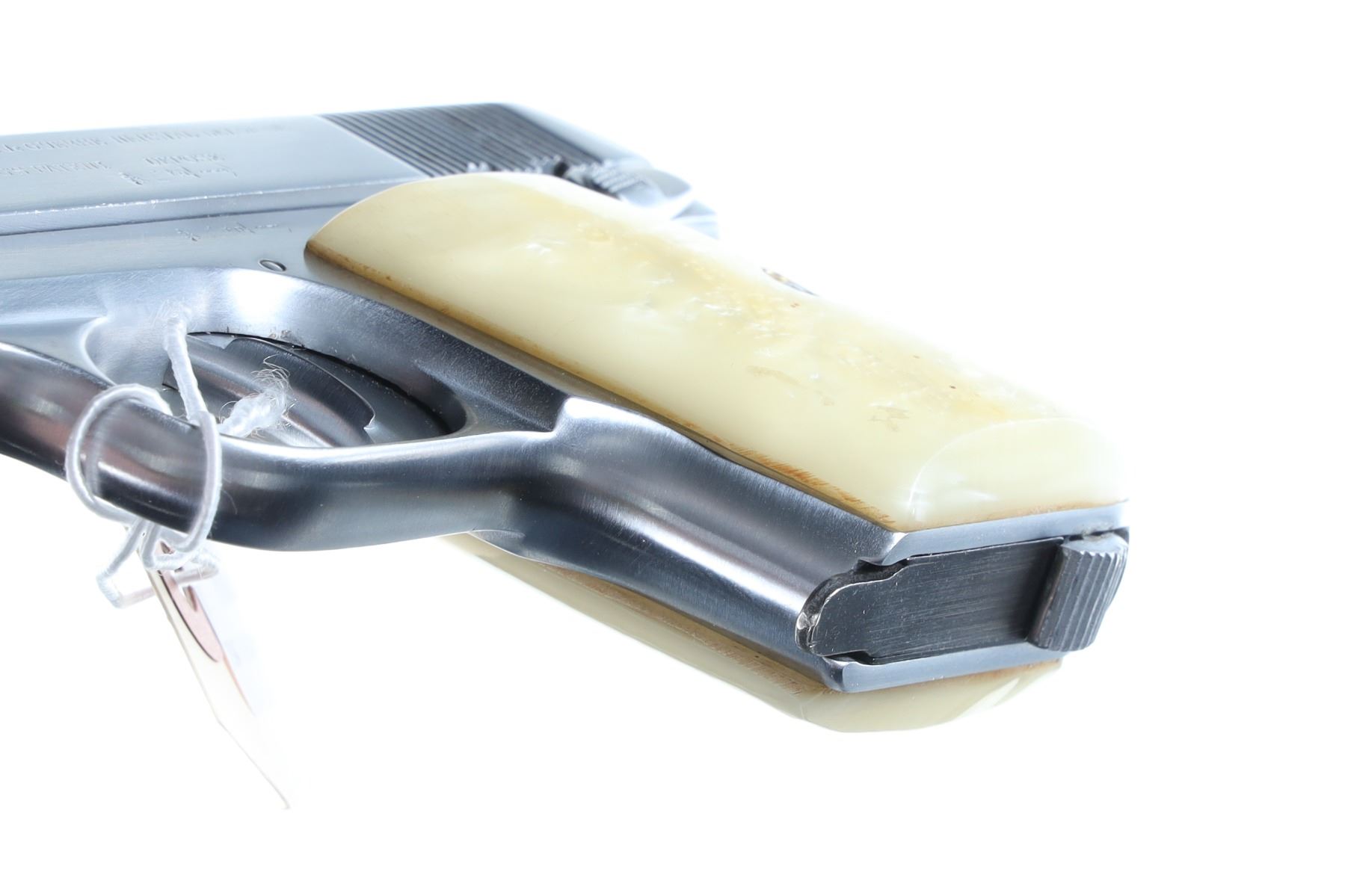 .25 ACP Serial # 488521 Brushed nickel finish with faux mother of pearl grips. Second model with contemporary magazine, very good overall condition. Barrel 2 1/8" C&R