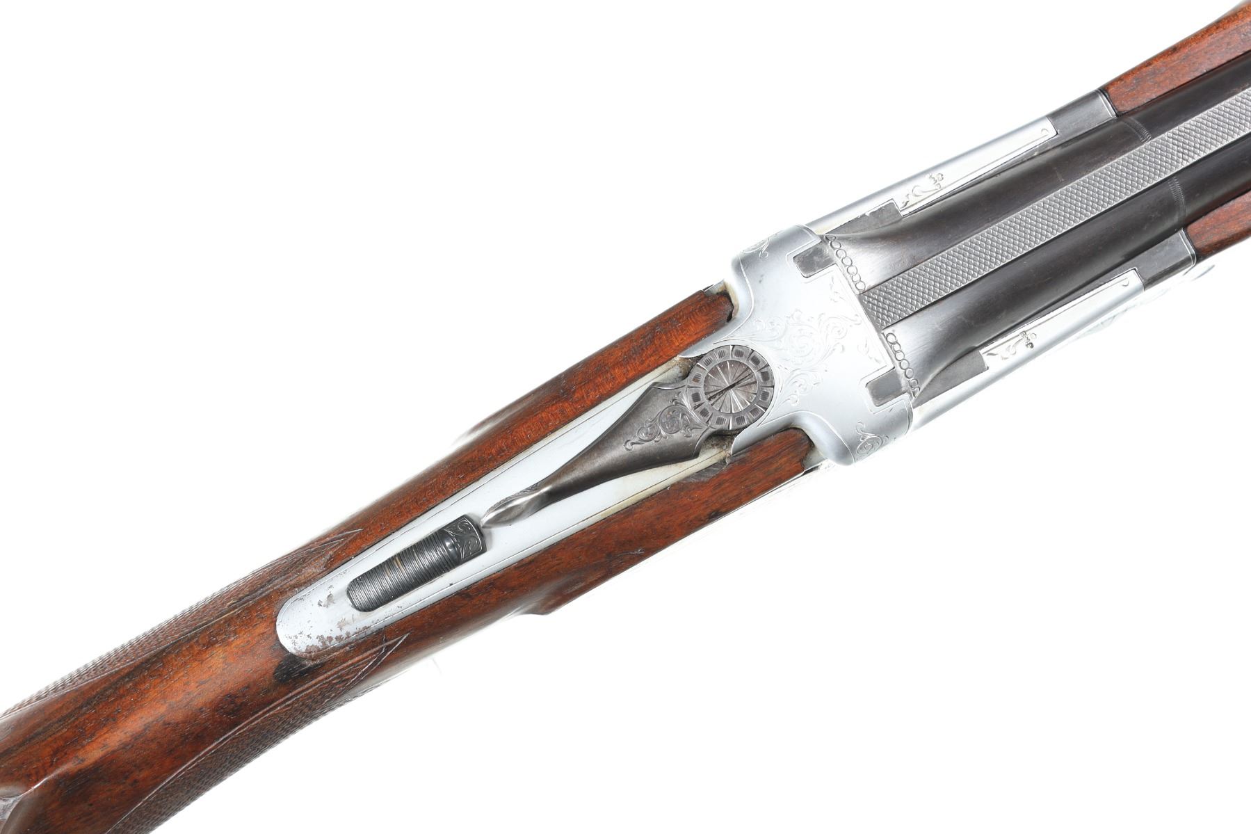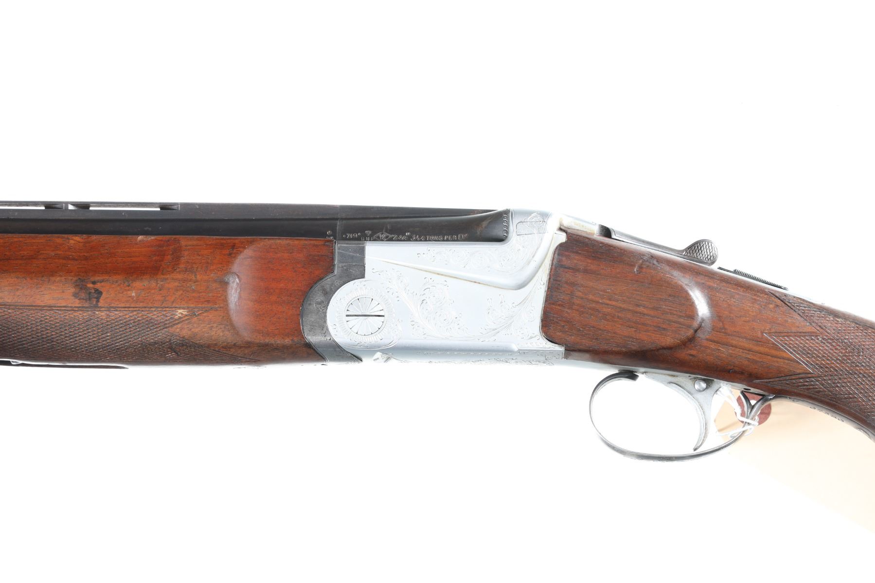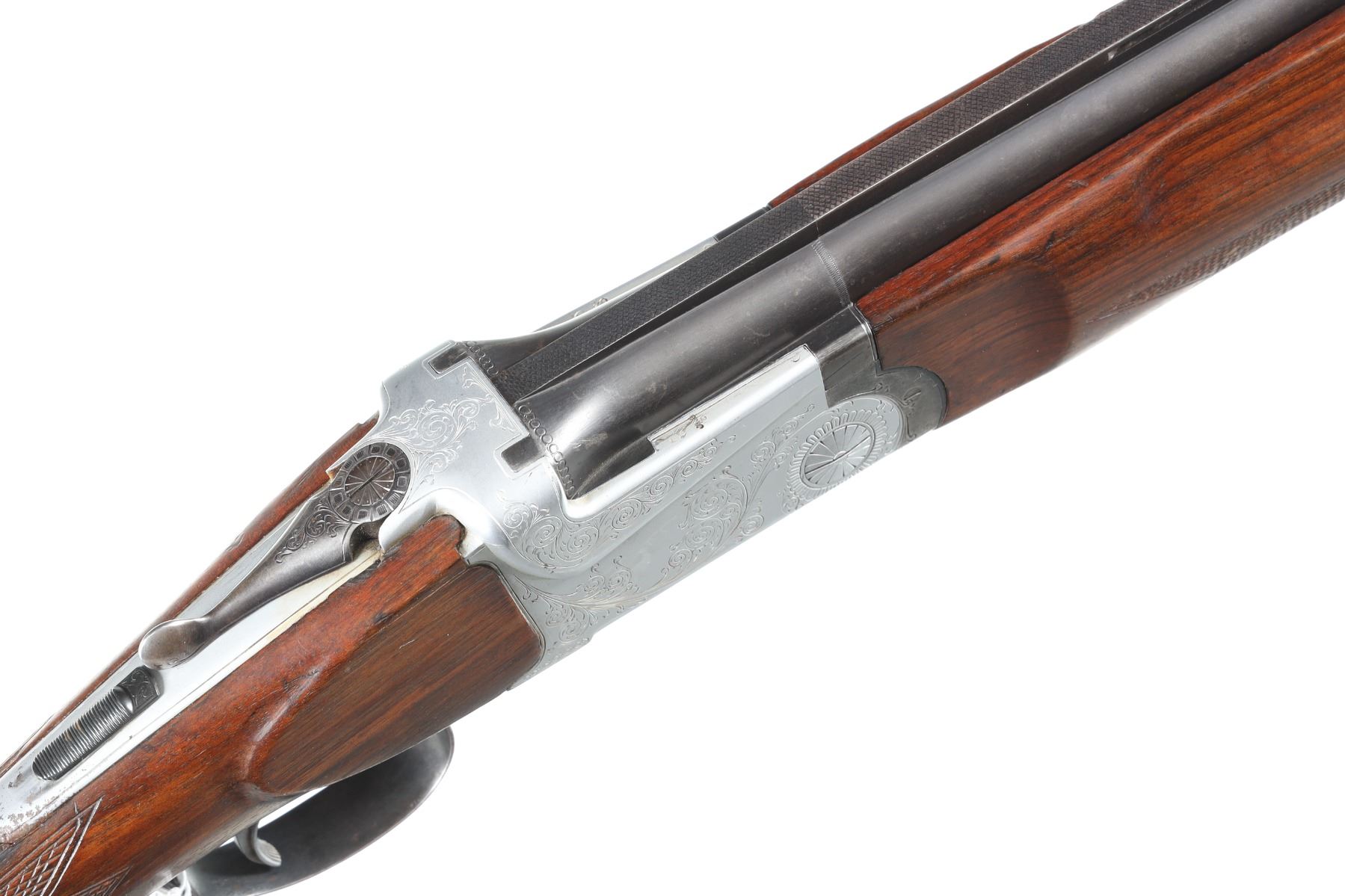 12ga Serial # 67386 SKB version of the Merkel double bite over under with engraved coin finished receiver with vent rib blue finished barrels. Single selective trigger with ejectors. Varnished checkered pistol grips stocks with sporting forearm. Very good overall condition with moderate wear and small bruises and handling marks in stocks. Choked Imp Cyl/Mod with 2 3/4" chambers, LOP 14". DAC 1 3/4" DAH 2 1/2" Mechanically excellent. Barrel 28" Modern