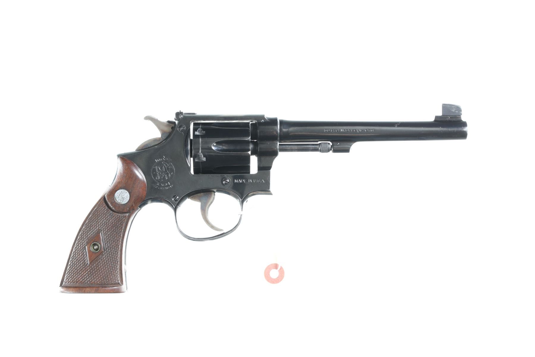 .38 spl Serial # 677146 Pre-war Outdoorsman .38 with case color hammer and trigger in excellent overall condition with minor finish losses at high points and muzzle, bore is excellent, has star after serial number indicating previous factory return, mechanically excellent. Manufactured c. 1915-1942. Factory refinish date "6 55". Factory rework star on butt. Barrel 6" C&R