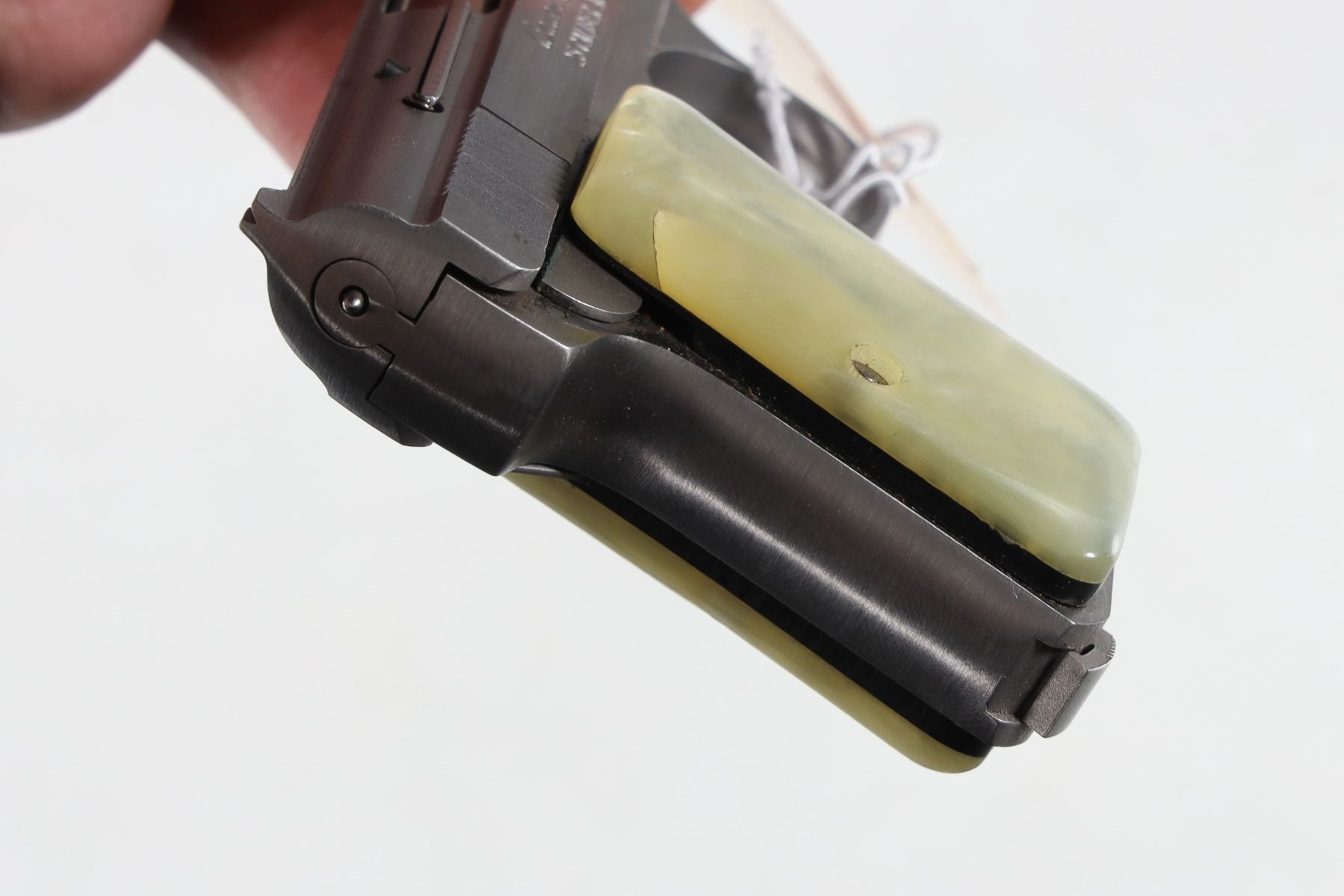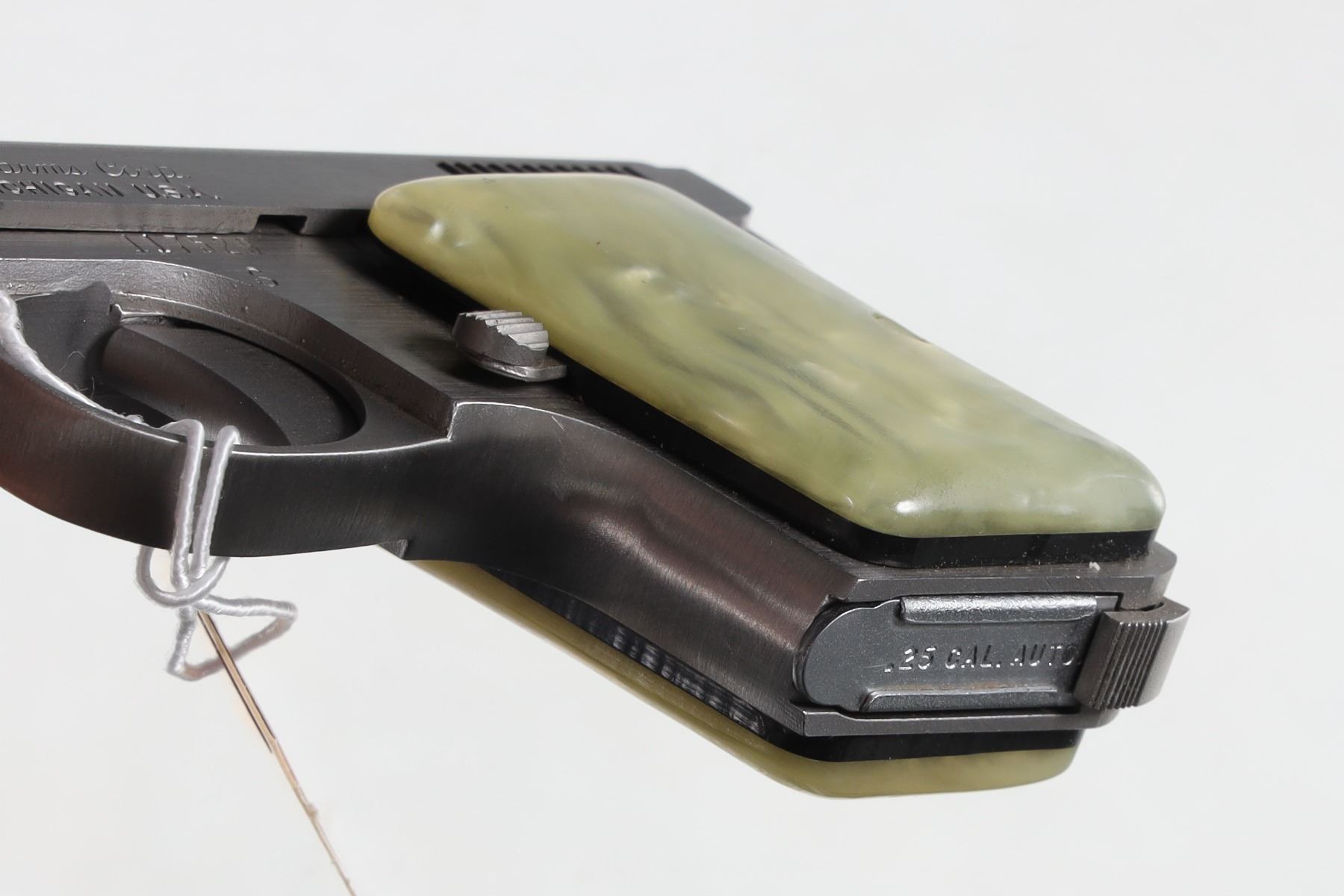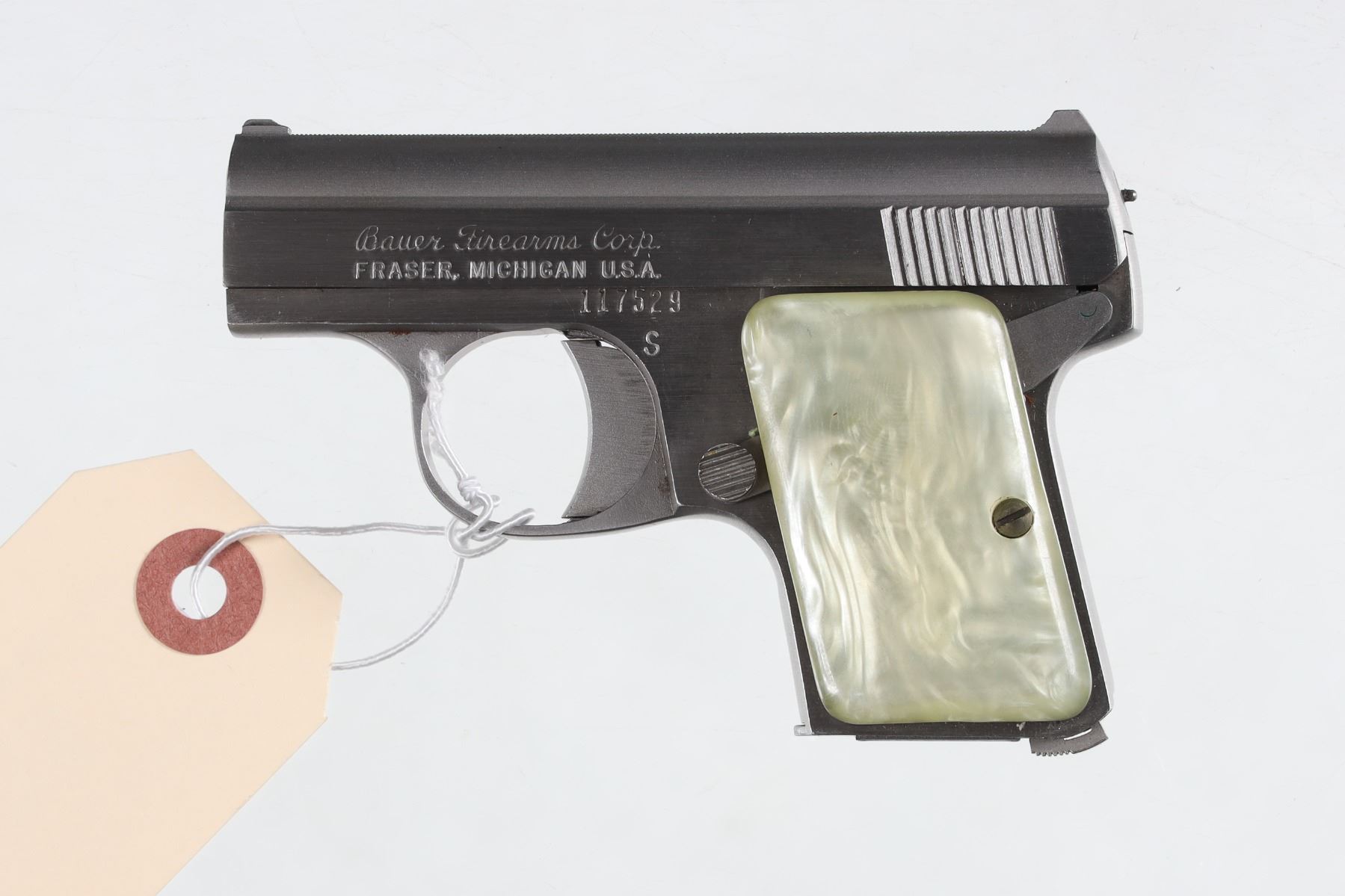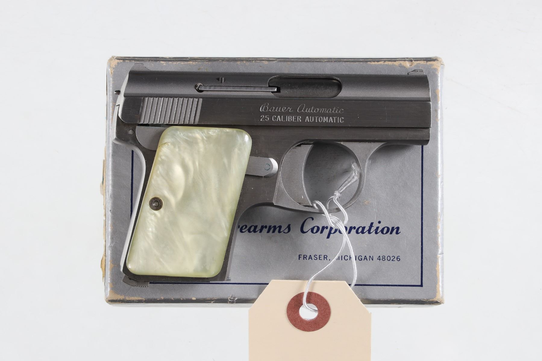 .25 ACP Serial # 117529 Stainless steel with faux mother of pearl grips in original factory box numbered to gun. Pistol remains as new condition, mechanically excellent. Barrel 2 1/8" Modern