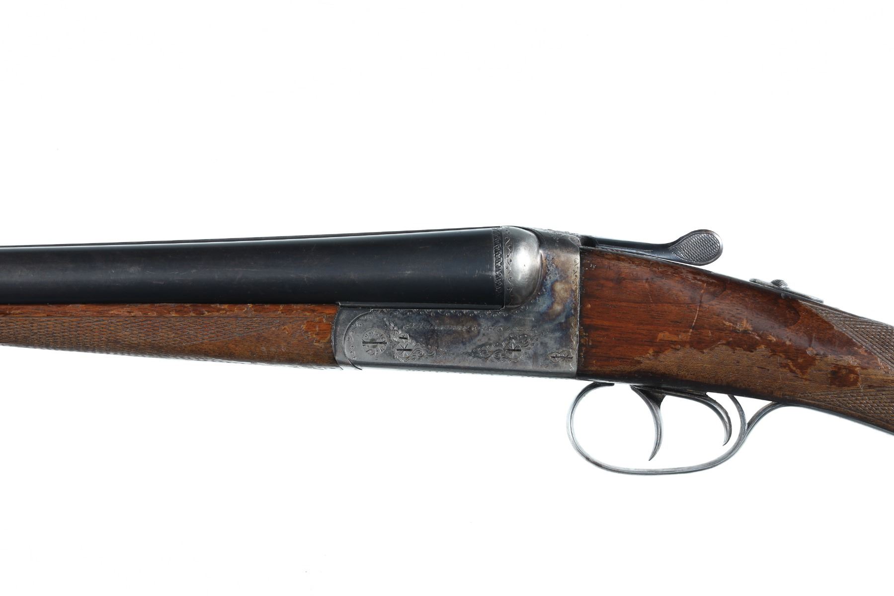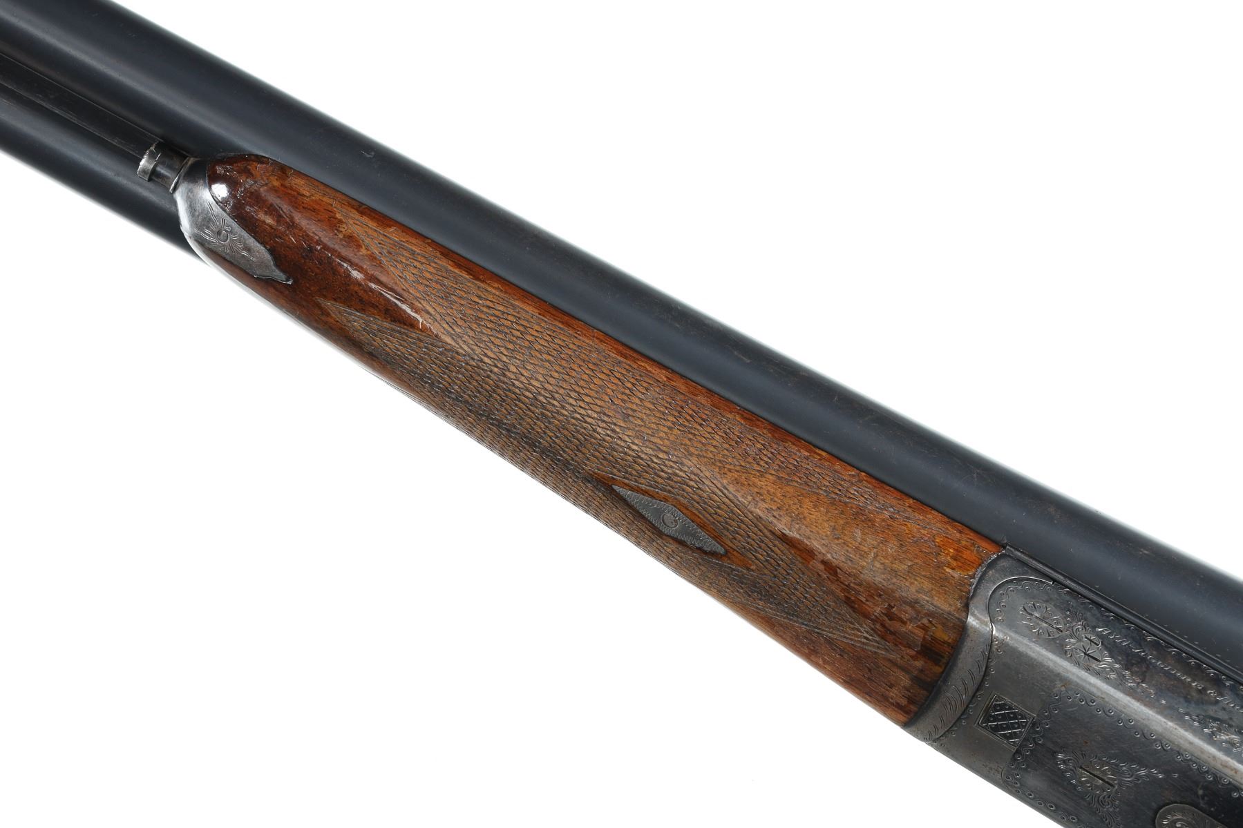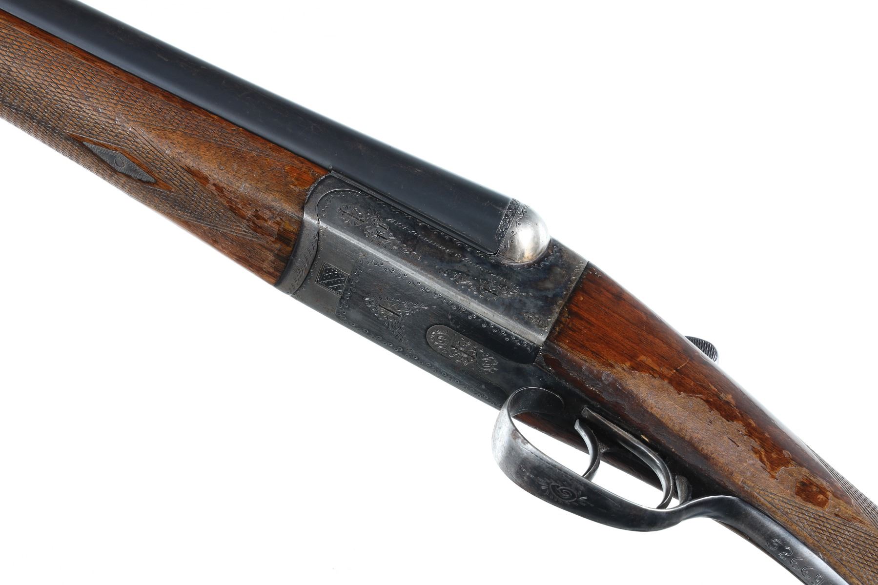 12ga Serial # 526693 Choked full/mod. Metal surfaces rate very good with thinning case colors on receiver, some varnish loss to wood, mechanically excellent. 14 3/4" LOP. Barrel 26 Modern