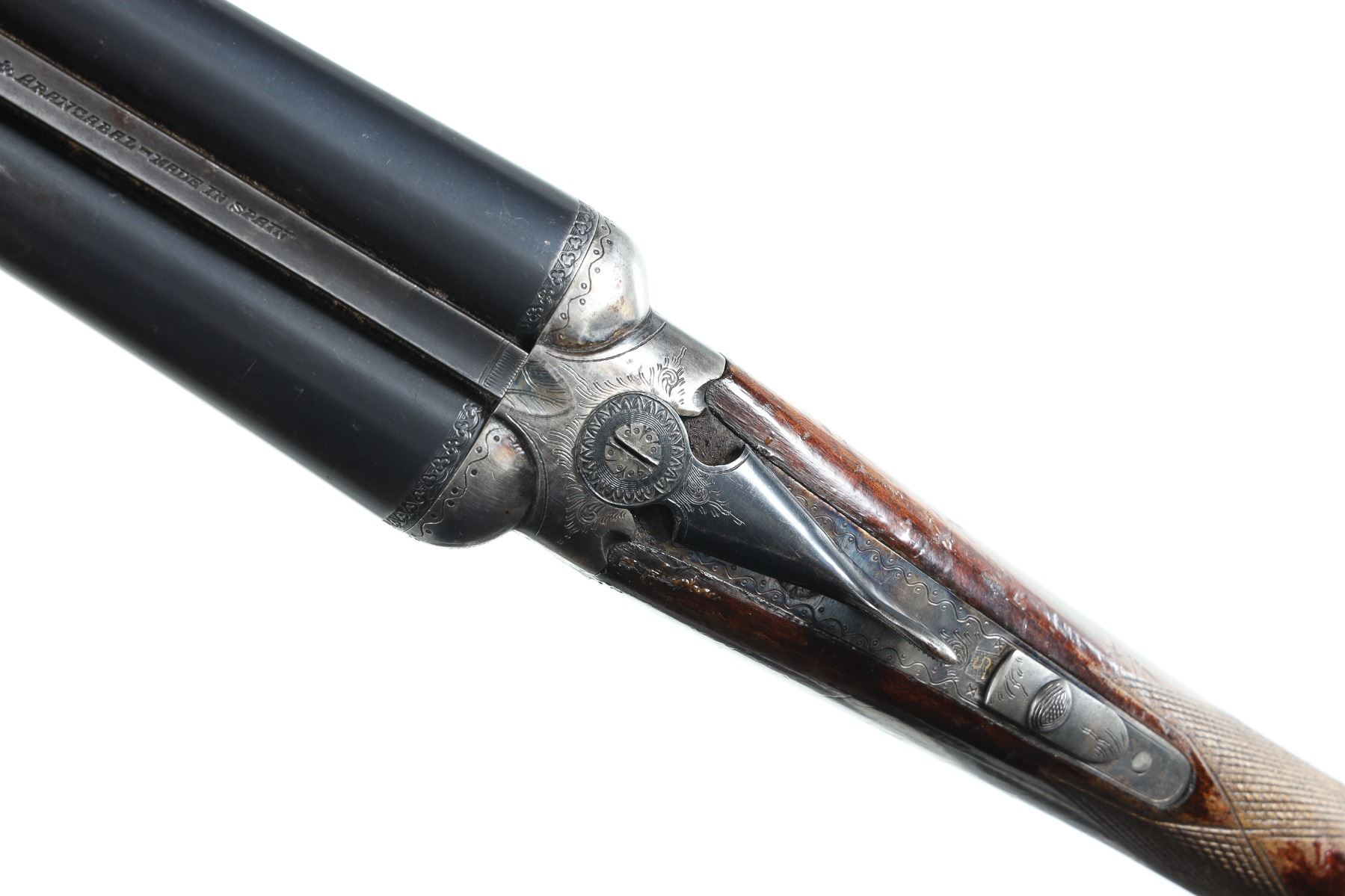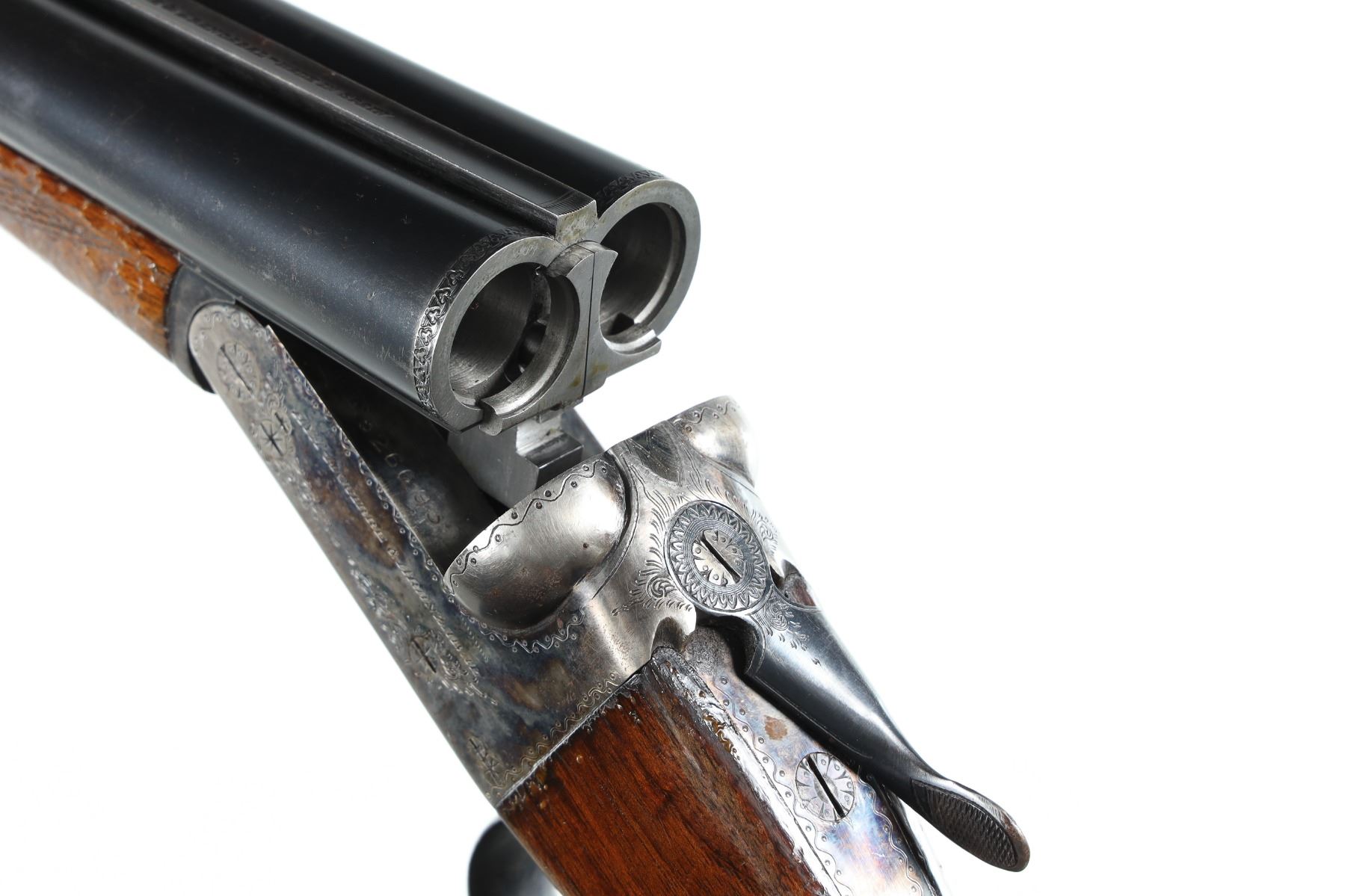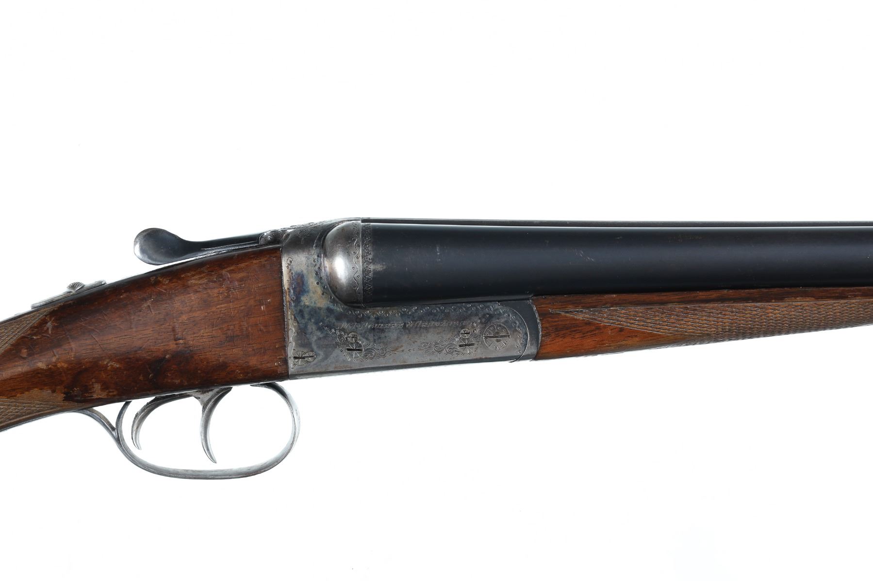 12ga Serial # 526693 Choked full/mod. Metal surfaces rate very good with thinning case colors on receiver, some varnish loss to wood, mechanically excellent. 14 3/4" LOP. Barrel 26 Modern