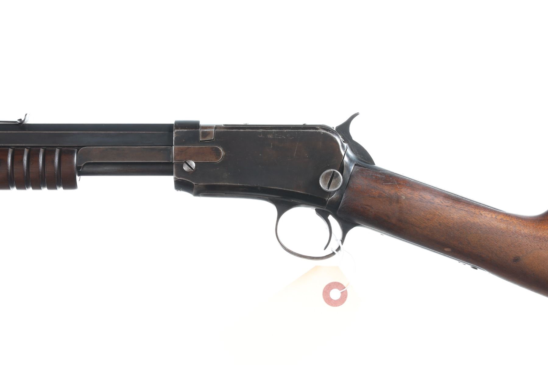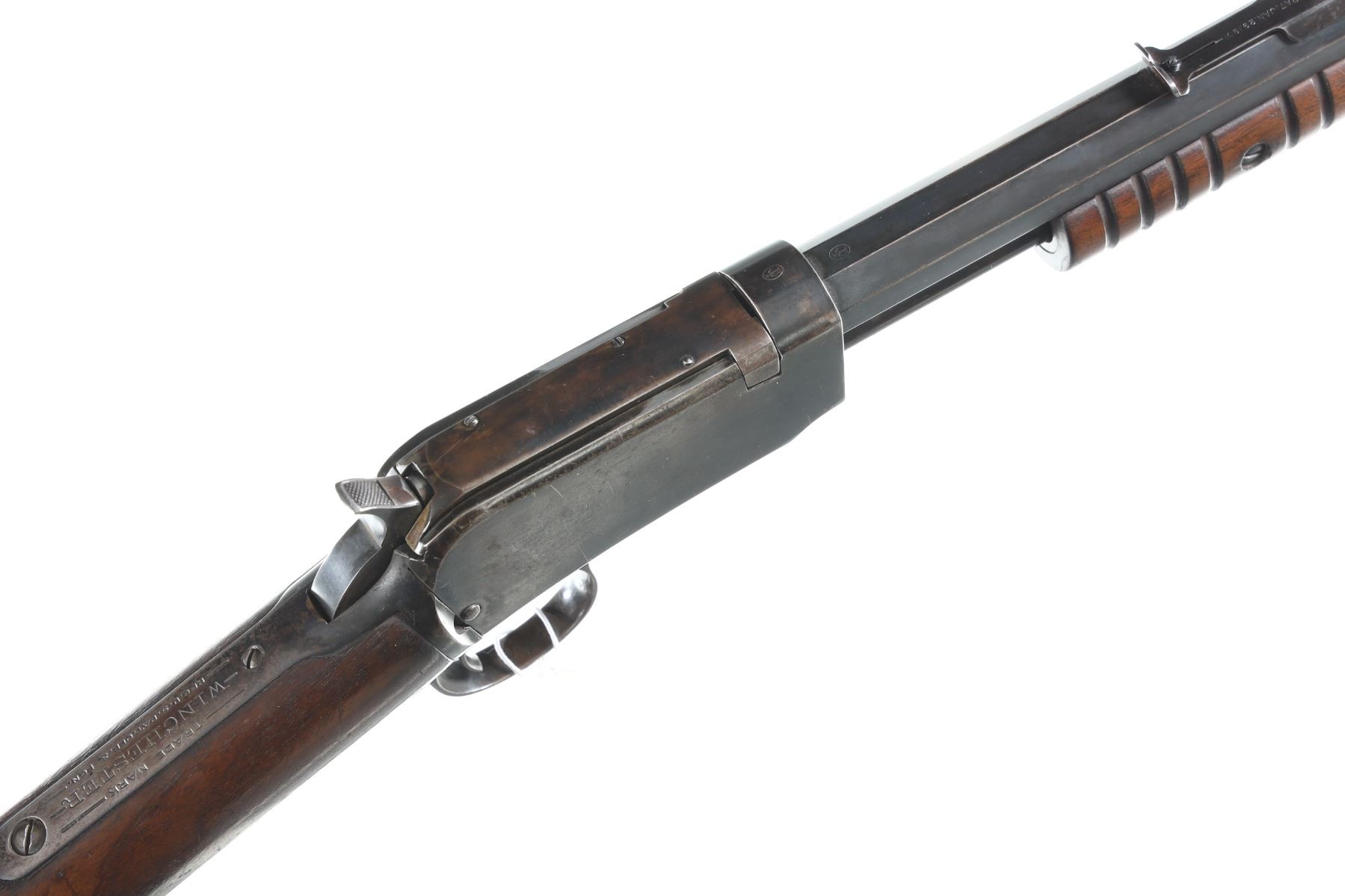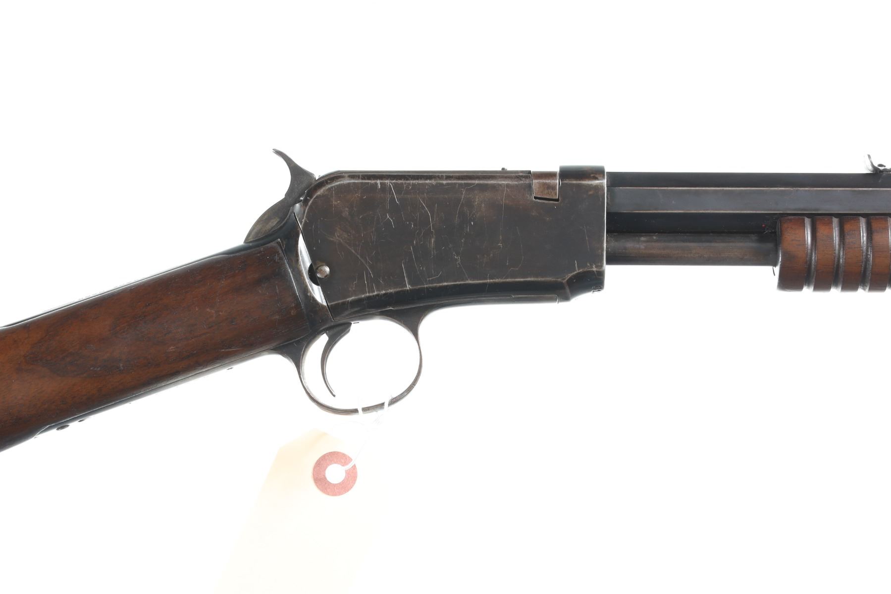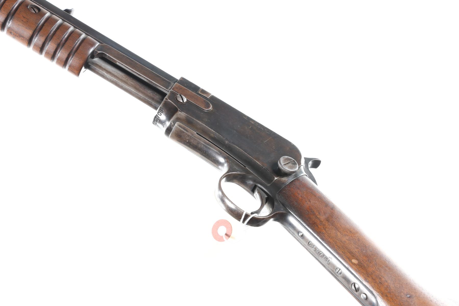 .22 short Serial # 612708A Winchester Model 1890 Pump 22 rifle cal, 22 short. Exposed hammer with blue finish and varnished walnut stocks with crescent butt plate. Very good overall condition, original finish mixed with cold blue. Mechanically excellent. Manufactured in 1917. C&R Barrel 24" C&R
