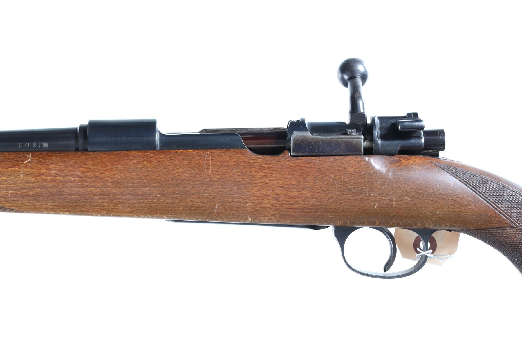 8mm Serial # 5020 Swedish Husqvarna Large ring 98 Mauser action sporter with commercial marked Husqvarna Bbl, marked KAL 8MM. Checkered pistol grip stock with 7/8" sling swivels and commercial Husqvarna plastic butt plate. Metal surfaces rate excellent, handling marks to wood.. Mechanically excellent. C&R Barrel 24" C&R