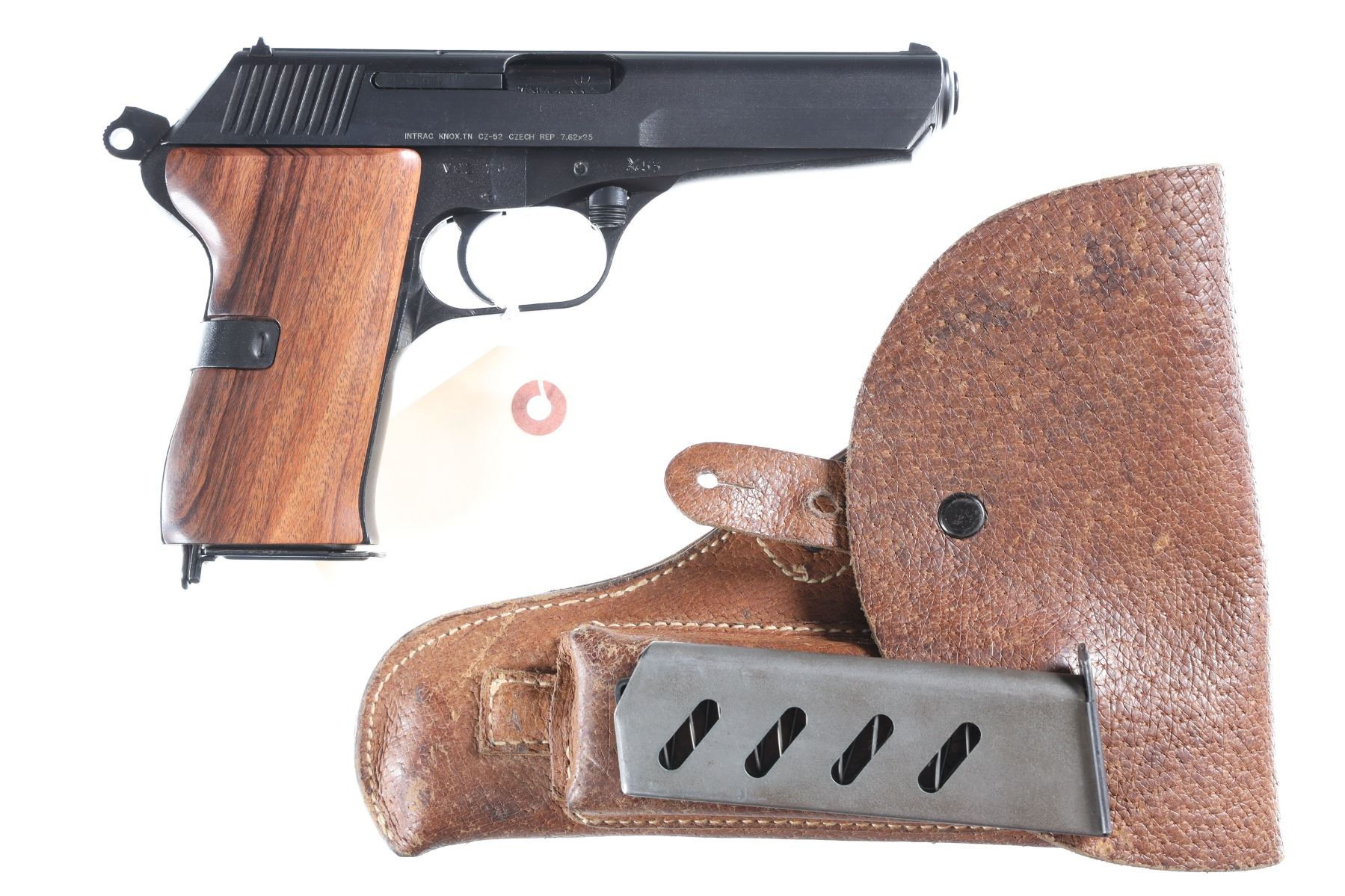 7.62x25mm Serial # T14433rid Arsenal refinished with import mark with original holster and spare magazine and custom walnut grips. Very fine overall condition. Barrel 4 5/8" C&R