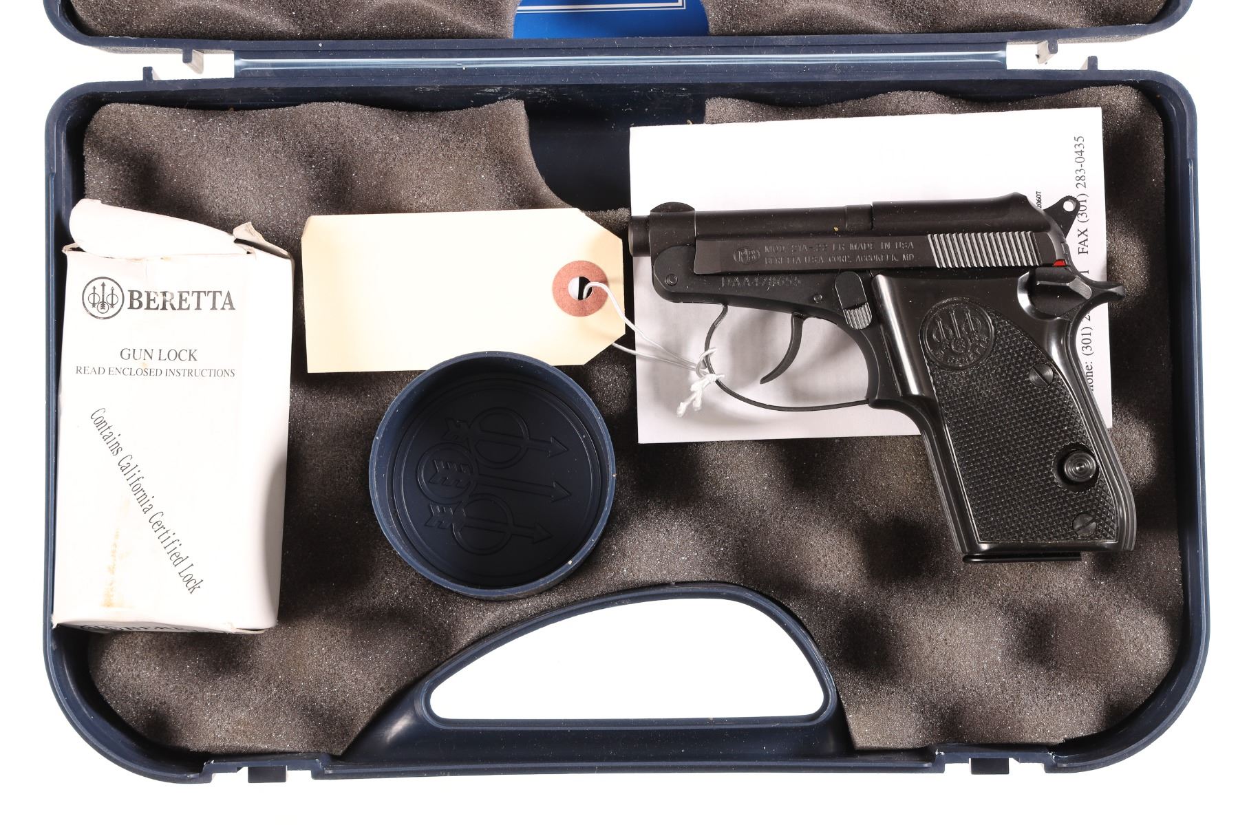 .22 lr Serial # DAA478655 Matte blue finish with factory plastic grips, tip up barrel, single/double action, Beretta factory case. Pistol remains as new condition retaining all factory finish. Barrel 2 1/2" Modern