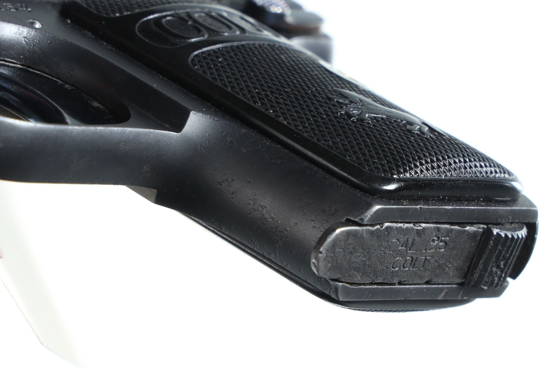 .25 ACP Serial # 318154 Matte blue finish with factory hard rubber grips, very good overall condition as restored with light pitting on frame and slide. Mechanically excellent. Barrel 2 1/4" C&R