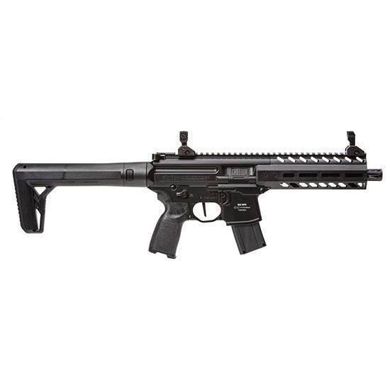 Created from the same robust foundation as its predecessor, the SIG MPX GEN II Air Rifle has been updated with improved accuracy and modified furniture and controls. Now featuring an M-LOK system handguard, flat blade trigger, reduced angle grip, a redesigned buttstock and a low-profile recoil pad. Chambered in .177 pellet and complete with rifled barrel and flip-up sights, the CO2 powered SIG MPX GEN II Air Rifle keeps you on target while delivering 30 rounds of semi-automatic firepower down range.
