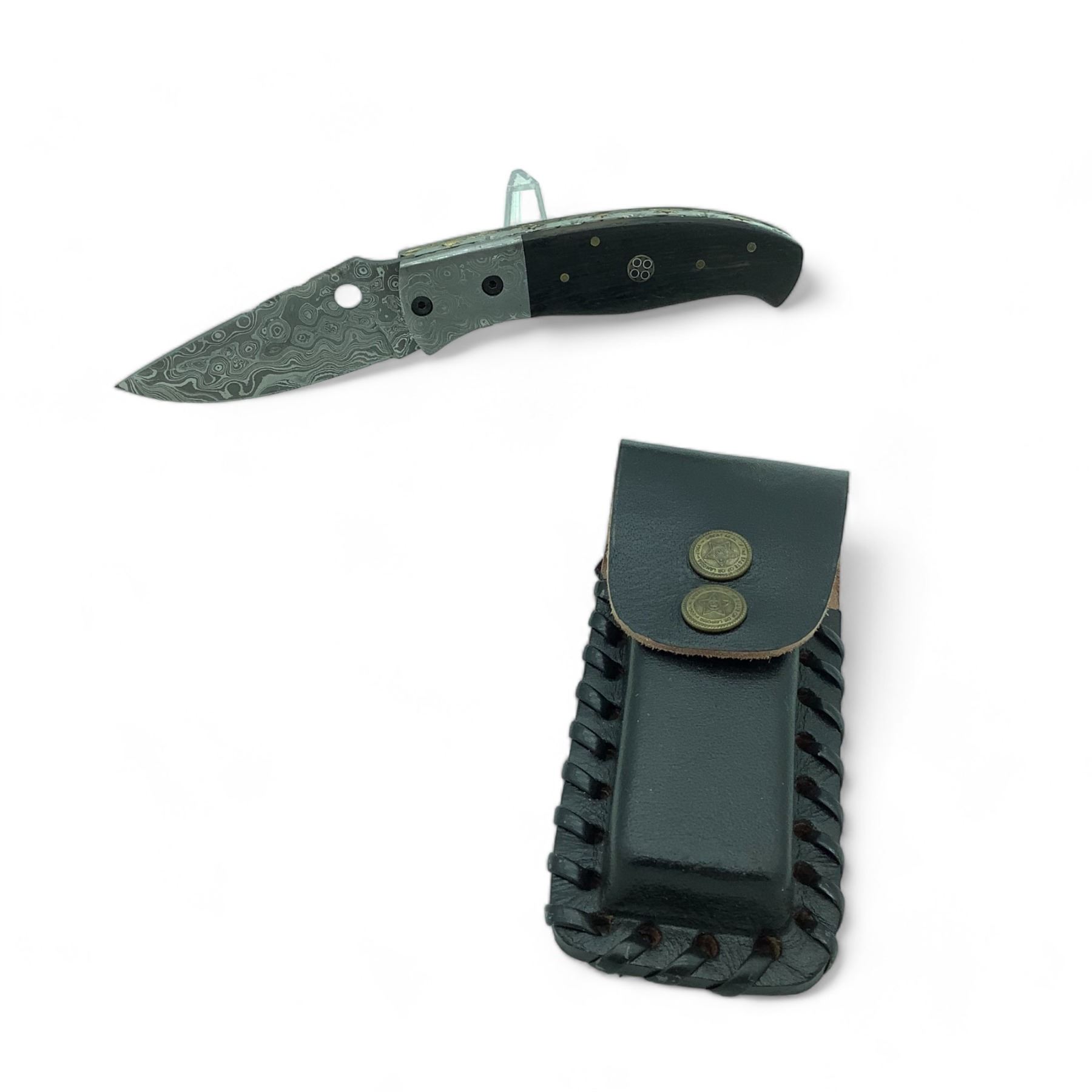Lot 188 Hand Forged Damascus Folding 3 1/4" Blade Knife with Leather Sheath