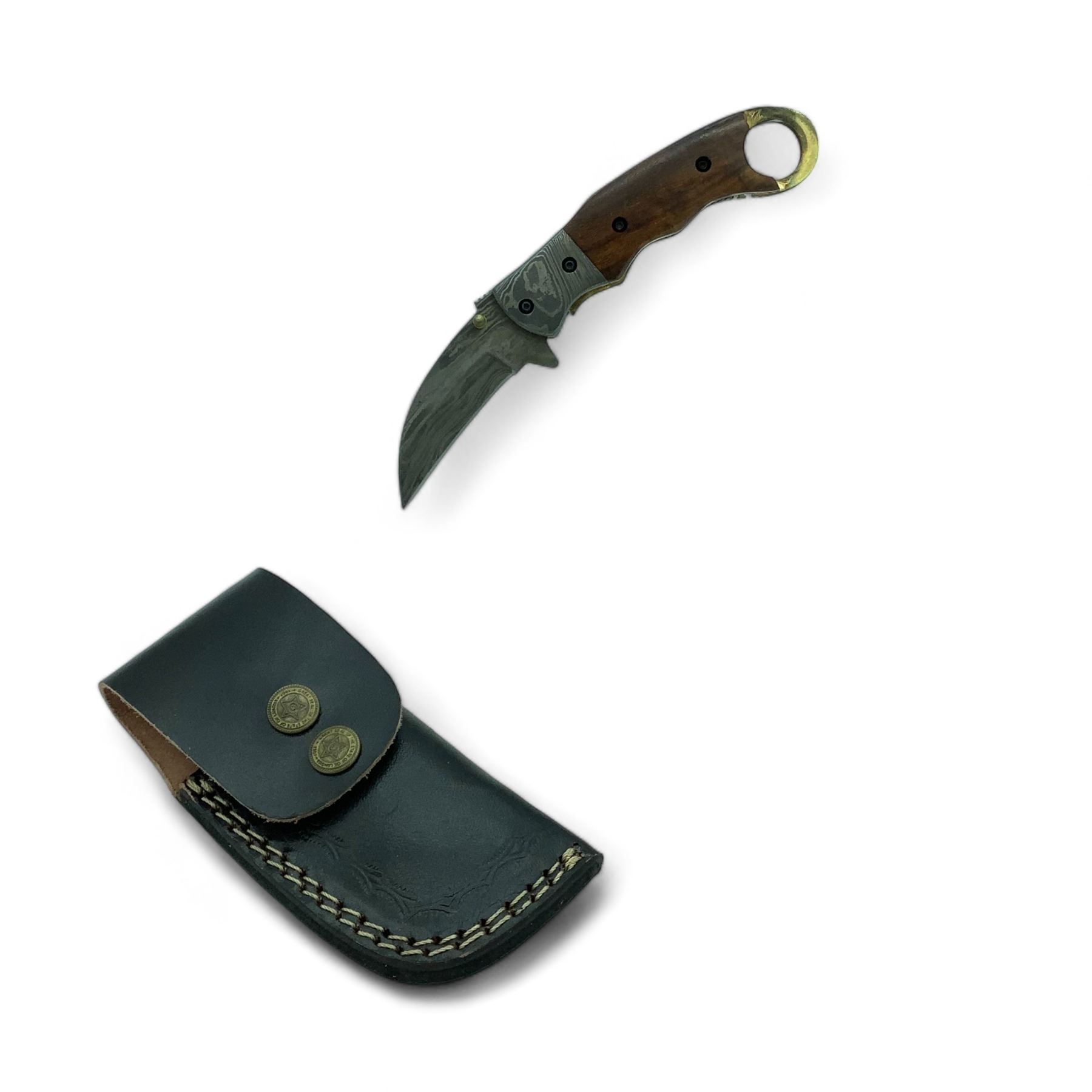 Lot 192 Hand Forged Damascus Folding 2 1/2" Blade Knife with Leather Belt Sheath