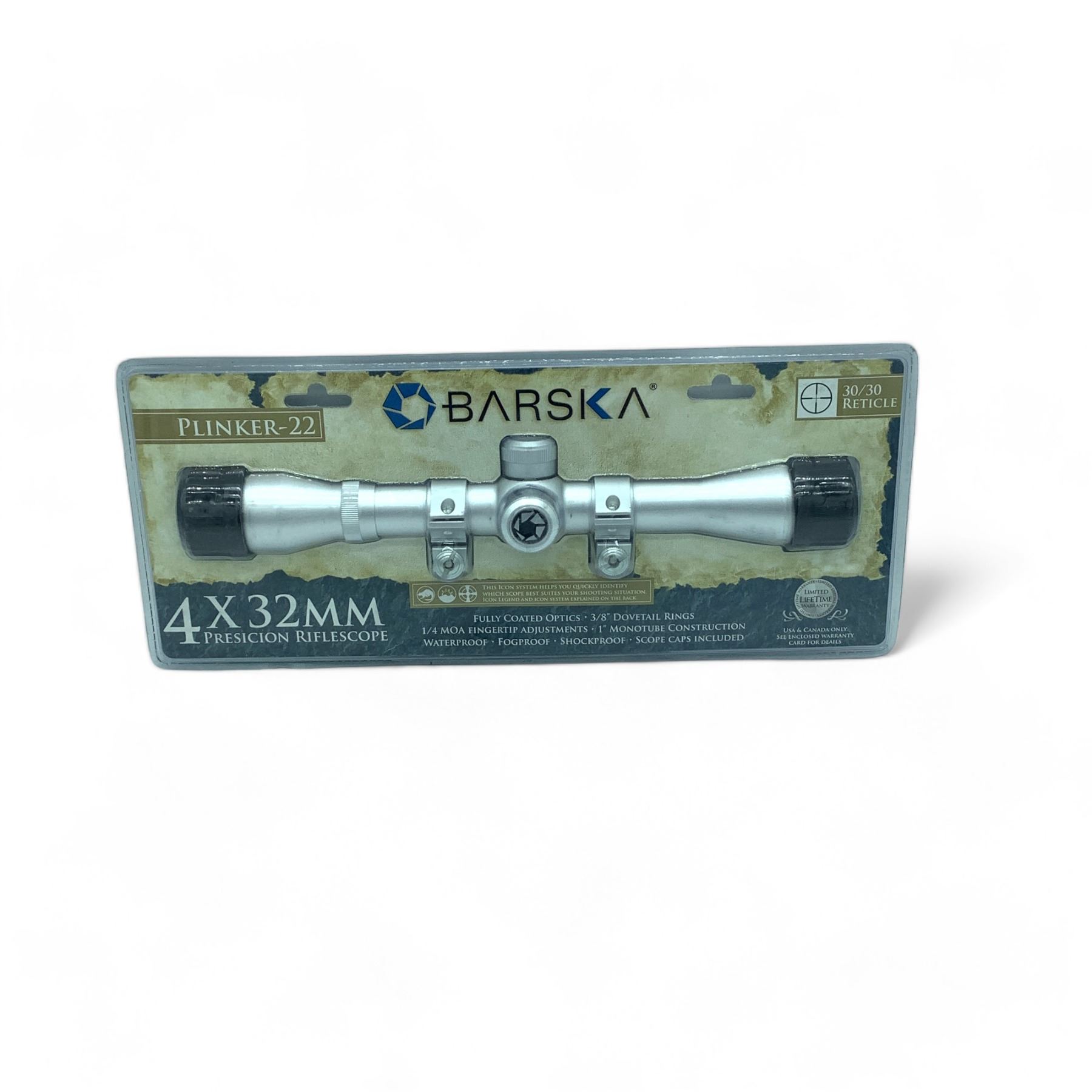 Barska Plinker-22 4 X 32 mm Precision Rifle Scope with 30/30 Reticle, Stainless, New