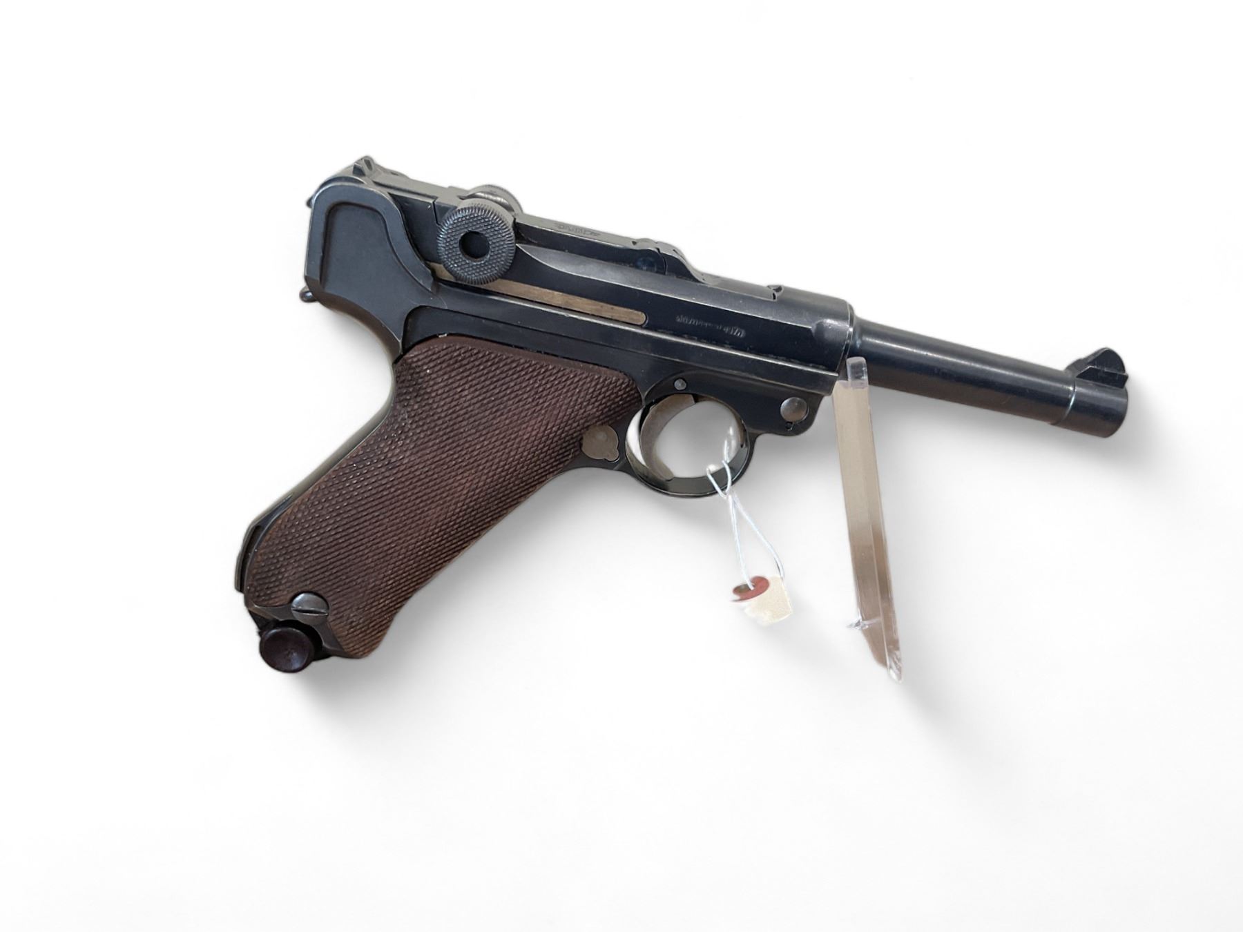 DWM Luger P08 Semi Auto Pistol 7.65MM (.30 Luger) 3.75" Barrel Wood Grips, Prohibited. Comes with one magazine; wood base of magazine cracked. Fixed sights. This is a prohibited firearm and can only be sold to exempted individuals under the new firearms legislation, other businesses, export, deactivated for a fee of $250, or stripped and sold without the frame and barrel for an additional $95 fee.