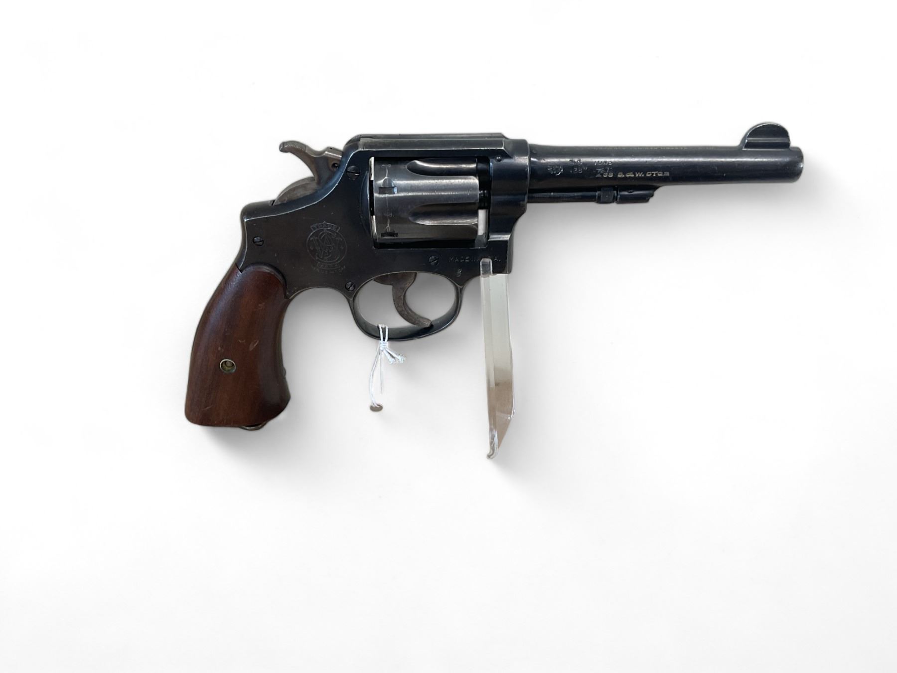 Smith & Wesson Hand Ejector 38/200 British Service Revolver 38 S&W 5" Barrel Wood Grips, Restricted. United States Property marked. Fixed sights; lanyard ring.
