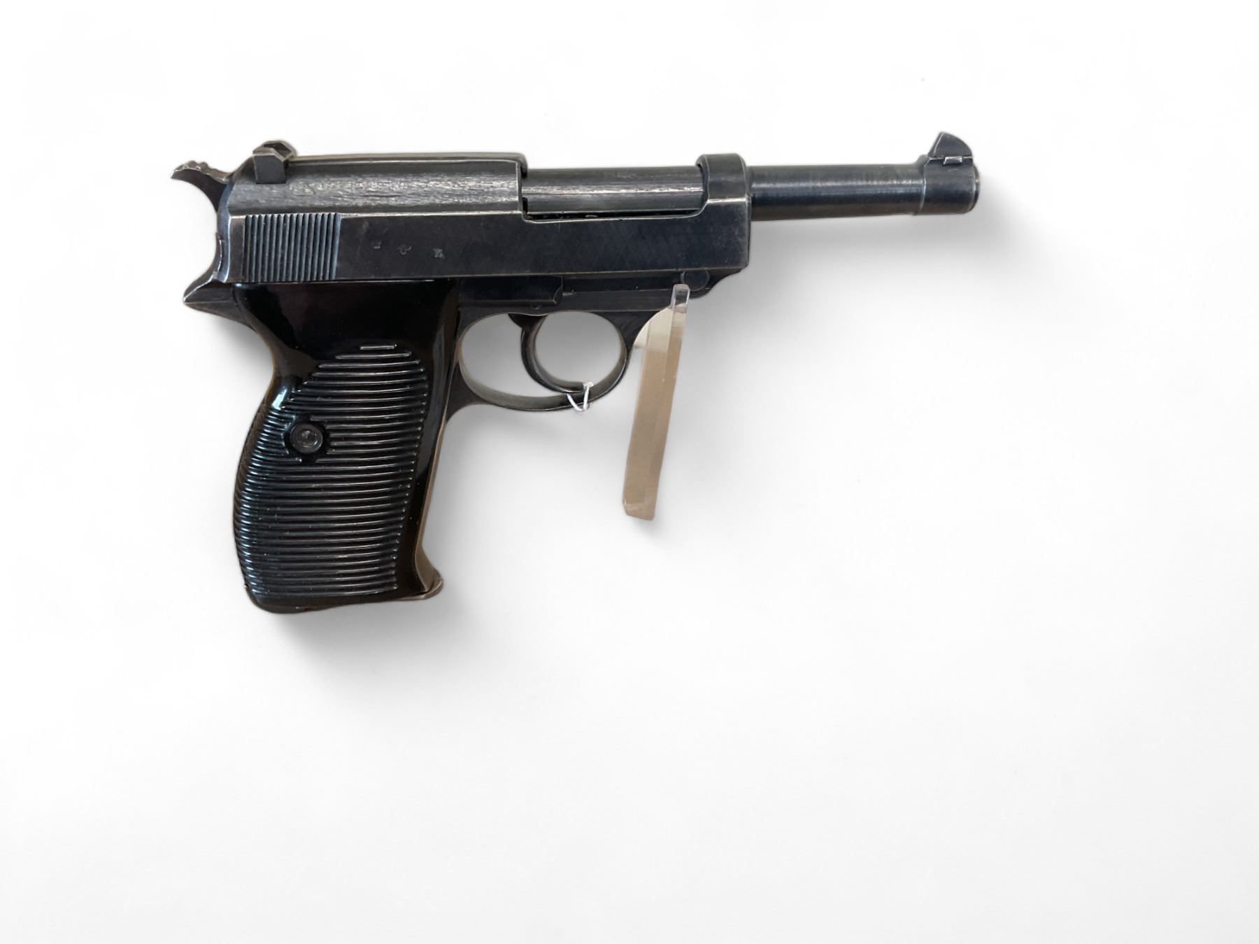 Walther P38 Semi Auto Pistol 9MM 4.7" Barrel, Restricted. Comes with one detachable magazine. Fixed sights; lanyard ring. German marks present. This is a restricted firearm and can only be sold to exempted individuals under the new firearms legislation, other businesses, export, deactivated for a fee of $250, or stripped and sold without the frame for an additional $95 fee.
