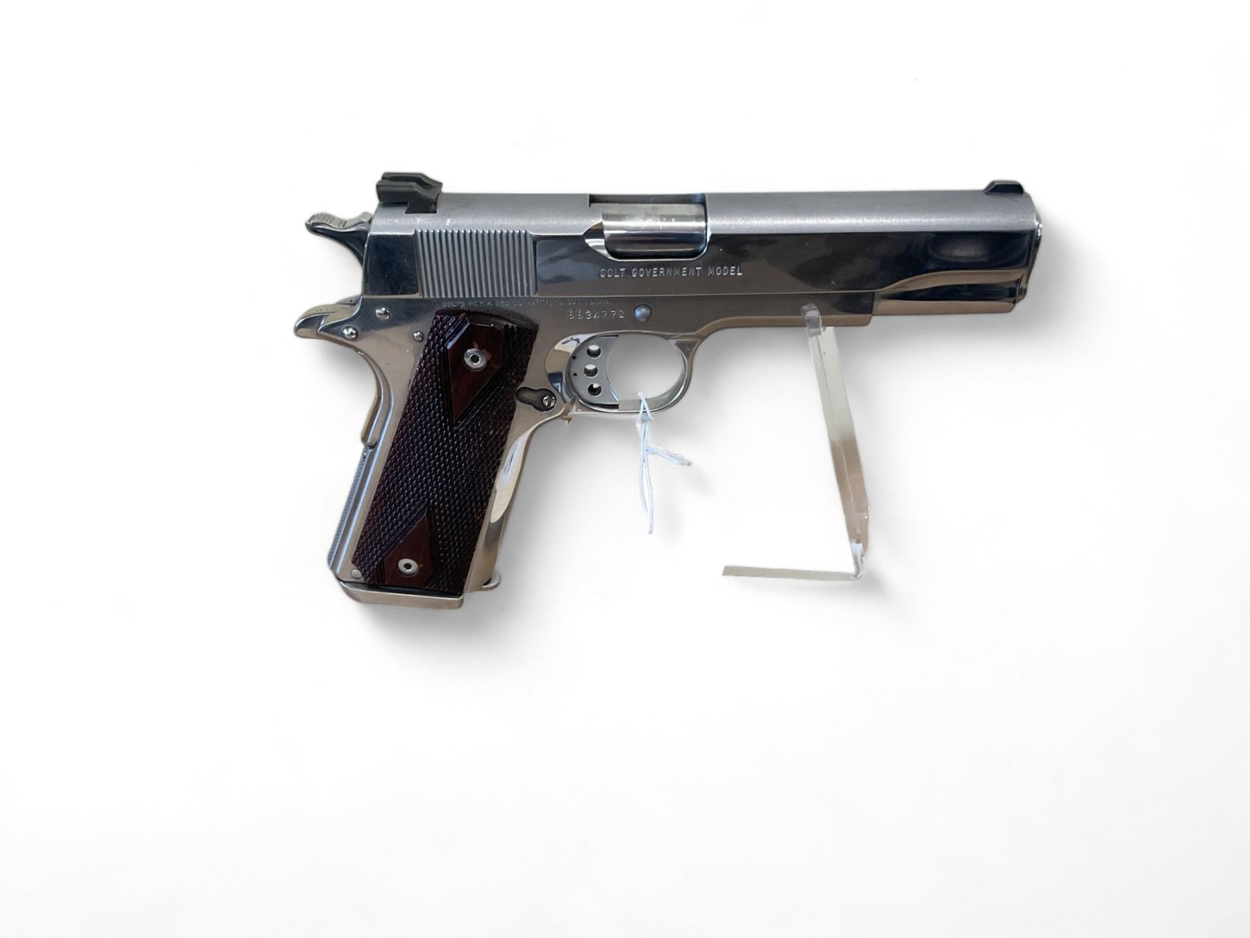 Colt Mk IV Series 80 Semi Auto Pistol 45 ACP 5" Barrel Wood Grips, Restricted. Comes with one detachable magazine. Fixed sights, guide rod appears to have been upgraded. This is a restricted firearm and can only be sold to exempted individuals under the new firearms legislation, other businesses, export, deactivated for a fee of $250, or stripped and sold without the frame for an additional $95 fee.