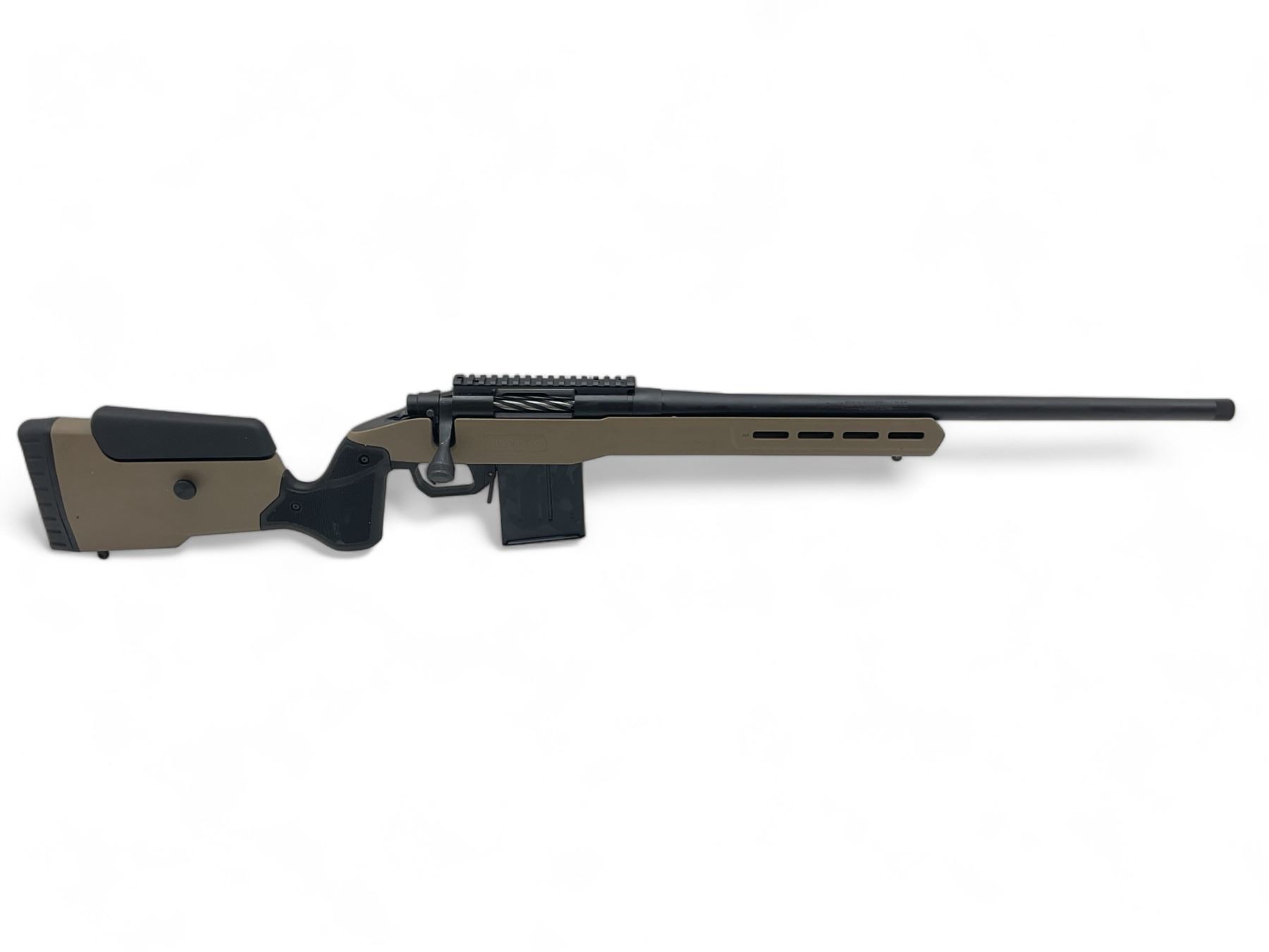 Mossberg Patriot LR Tactical Bolt Action Rifle 6.5 Creedmoor 22" Threaded Barrel FDE Stock, New. Includes one detachable magazine. Adjustable trigger, receiver drilled and tapped with 20 MOA rail installed. MLOK forend, fluted bolt; pistol grip palm swell has imperfections. This is a non-restricted firearm.