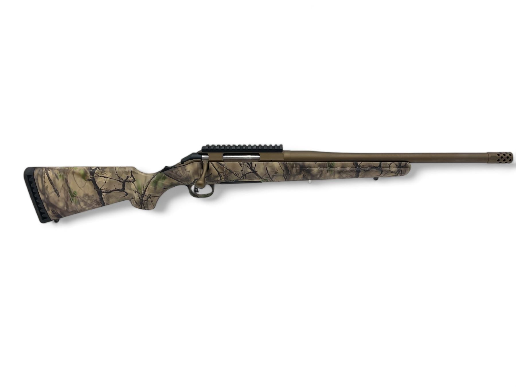 Ruger American Bolt-Action Rifle 6.5 Creedmoor 16.1" Threaded Barrel Burnt Bronze And Go Wild Camo, New. Includes one detachable magazine, threaded barrel has brake installed. Adjustable trigger; receiver drilled and tapped with one piece rail included. This is a non-restricted firearm.