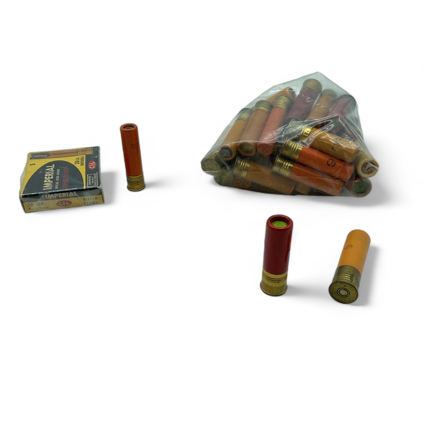 Cardboard and Plastic Assorted Gauge Shotgun Slug/ Shot Ammunition and Empty Imperial 28 Ga Box